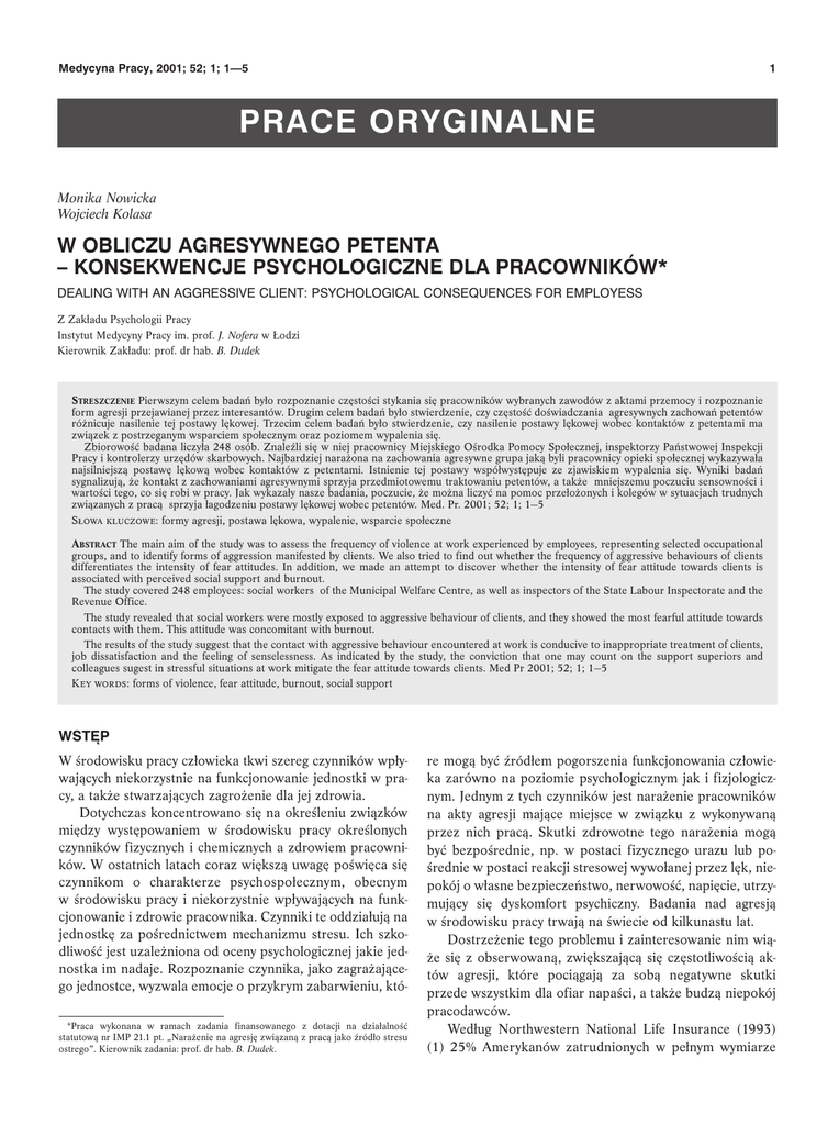 Medycyna Pracy, 2001; 52; 1; 1—5 1 PRACE ORYGINALNE Monika Nowicka Wojciech Kolasa W OBLICZU AGRESYWNEGO PETENTA – KONSEKWENCJE PSYCHOLOGICZNE DLA PRACOWNIKÓW* DEALING WITH AN AGGRESSIVE CLIENT: PSYCHOLOGICAL CONSEQUENCES FOR EMPLOYESS Z Zakładu Psychologii Pracy Instytut Medycyny Pracy im. prof. J. Nofera w Łodzi Kierownik Zakładu: prof. dr hab. B. Dudek STRESZCZENIE Pierwszym celem badań było rozpoznanie częstości stykania się pracowników wybranych zawodów z aktami przemocy i rozpoznanie form agresji przejawianej przez interesantów. Drugim celem badań było stwierdzenie, czy częstość doświadczania agresywnych zachowań petentów różnicuje nasilenie tej postawy lękowej. Trzecim celem badań było stwierdzenie, czy nasilenie postawy lękowej wobec kontaktów z petentami ma związek z postrzeganym wsparciem społecznym oraz poziomem wypalenia się. Zbiorowość badana liczyła 248 osób. Znaleźli się w niej pracownicy Miejskiego Ośrodka Pomocy Społecznej, inspektorzy Państwowej Inspekcji Pracy i kontrolerzy urzędów skarbowych. Najbardziej narażona na zachowania agresywne grupa jaką byli pracownicy opieki społecznej wykazywała najsilniejszą postawę lękową wobec kontaktów z petentami. Istnienie tej postawy współwystępuje ze zjawiskiem wypalenia się. Wyniki badań sygnalizują, że kontakt z zachowaniami agresywnymi sprzyja przedmiotowemu traktowaniu petentów, a także mniejszemu poczuciu sensowności i wartości tego, co się robi w pracy. Jak wykazały nasze badania, poczucie, że można liczyć na pomoc przełożonych i kolegów w sytuacjach trudnych związanych z pracą sprzyja łagodzeniu postawy lękowej wobec petentów. Med. Pr. 2001; 52; 1; 1—5 Słowa kluczowe: formy agresji, postawa lękowa, wypalenie, wsparcie społeczne ABSTRACT The main aim of the study was to assess the frequency of violence at work experienced by employees, representing selected occupational groups, and to identify forms of aggression manifested by clients. We also tried to find out whether the frequency of aggressive behaviours of clients differentiates the intensity of fear attitudes. In addition, we made an attempt to discover whether the intensity of fear attitude towards clients is associated with perceived social support and burnout. The study covered 248 employees: social workers of the Municipal Welfare Centre, as well as inspectors of the State Labour Inspectorate and the Revenue Office. The study revealed that social workers were mostly exposed to aggressive behaviour of clients, and they showed the most fearful attitude towards contacts with them. This attitude was concomitant with burnout. The results of the study suggest that the contact with aggressive behaviour encountered at work is conducive to inappropriate treatment of clients, job dissatisfaction and the feeling of senselessness. As indicated by the study, the conviction that one may count on the support superiors and colleagues sugest in stressful situations at work mitigate the fear attitude towards clients. Med Pr 2001; 52; 1; 1—5 Key words: forms of violence, fear attitude, burnout, social support WSTÊP W środowisku pracy człowieka tkwi szereg czynników wpływających niekorzystnie na funkcjonowanie jednostki w pracy, a także stwarzających zagrożenie dla jej zdrowia. Dotychczas koncentrowano się na określeniu związków między występowaniem w środowisku pracy określonych czynników fizycznych i chemicznych a zdrowiem pracowników. W ostatnich latach coraz większą uwagę poświęca się czynnikom o charakterze psychospołecznym, obecnym w środowisku pracy i niekorzystnie wpływających na funkcjonowanie i zdrowie pracownika. Czynniki te oddziałują na jednostkę za pośrednictwem mechanizmu stresu. Ich szkodliwość jest uzależniona od oceny psychologicznej jakie jednostka im nadaje. Rozpoznanie czynnika, jako zagrażającego jednostce, wyzwala emocje o przykrym zabarwieniu, któ*Praca wykonana w ramach zadania finansowanego z dotacji na działalność statutową nr IMP 21.1 pt. „Narażenie na agresję związaną z pracą jako źródło stresu ostrego”. Kierownik zadania: prof. dr hab. B. Dudek. re mogą być źródłem pogorszenia funkcjonowania człowieka zarówno na poziomie psychologicznym jak i fizjologicznym. Jednym z tych czynników jest narażenie pracowników na akty agresji mające miejsce w związku z wykonywaną przez nich pracą. Skutki zdrowotne tego narażenia mogą być bezpośrednie, np. w postaci fizycznego urazu lub pośrednie w postaci reakcji stresowej wywołanej przez lęk, niepokój o własne bezpieczeństwo, nerwowość, napięcie, utrzymujący się dyskomfort psychiczny. Badania nad agresją w środowisku pracy trwają na świecie od kilkunastu lat. Dostrzeżenie tego problemu i zainteresowanie nim wiąże się z obserwowaną, zwiększającą się częstotliwością aktów agresji, które pociągają za sobą negatywne skutki przede wszystkim dla ofiar napaści, a także budzą niepokój pracodawców. Według Northwestern National Life Insurance (1993) (1) 25% Amerykanów zatrudnionych w pełnym wymiarze 2 M. Nowicka, W. Kolasa godzin pada rocznie ofiarą przemocy, obejmujących, obok skrajnych jej form np. napaści fizycznej, także łagodniejsze jej przejawy jak groźby, zastraszanie i inne formy słownego nękania. Departament Sprawiedliwości Stanów Zjednoczonych odnotował w roku 1993 blisko milion osób poszkodowanych w wyniku aktów agresji w pracy, wśród których było 160 000 rannych. W Wielkiej Brytanii od roku 1981 liczba aktów agresji w pracy podwoiła się i w roku 1991 osiągnęła liczbę 360 000 (za Beale i inni 1998) (2). Badania prowadzone wśród pracowników służby zdrowia Wielkiej Brytanii w latach osiemdziesiątych przez UK Health and Safety Executive wykazały, że w ciągu 12 miesięcy poprzedzających badania 0,5% badanych doznało na skutek agresji w pracy zranienia, wymagającego pomocy medycznej. 10% doznało m