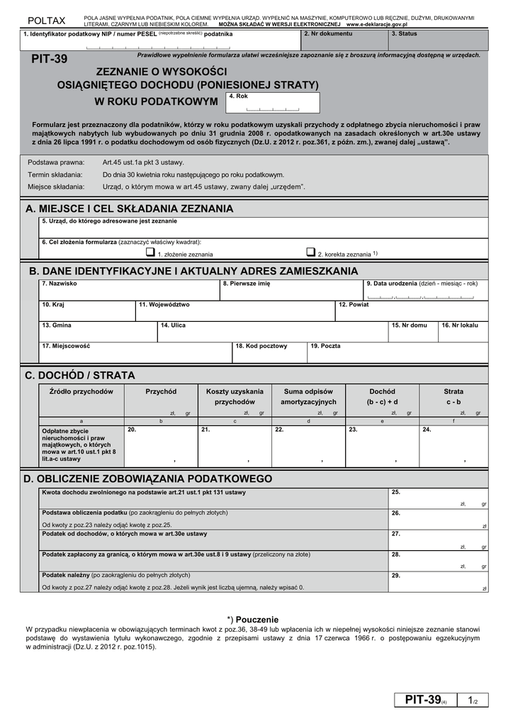 POLA JASNE WYPENIA PODATNIK, POLA CIEMNE WYPENIA URZD. WYPENI NA MASZYNIE, KOMPUTEROWO LUB RCZNIE, DUYMI, DRUKOWANYMI LITERAMI, CZARNYM LUB NIEBIESKIM KOLOREM. MONA SKADA W WERSJI ELEKTRONICZNEJ www.e-deklaracje.gov.pl POLTAX 1. Identyfikator podatkowy NIP / numer PESEL (niepotrzebne skreli) podatnika 2. Nr dokumentu 3. Status Ŋņņņņŏņņņņŏņņņņŏņņņņŏņņņņŏņņņņŏņņņņŏņņņņŏņņņņŏņņņņŏņņņņŋ 3UDZLGáRZHZ\SHáQLHQLHIRUPXODU]DXáDWZLZF]HĞQLHMV]H]DSR]QDQLHVLĊ]EURV]XUąLQIRUPDF\MQąGRVWĊSQąZXU]ĊGDFK PIT-39 ZEZNANIE O WYSOKOCI OSIGNITEGO DOCHODU (PONIESIONEJ STRATY) 4. Rok W ROKU PODATKOWYM Ŋņņņņŏņņņņŏņņņņŏņņņņŋ Formularz jest przeznaczony dla podatników, którzy w roku podatkowym uzyskali przychody z odpatnego zbycia nieruchomoci i praw maj tkowych nabytych lub wybudowanych po dniu 31 grudnia 2008 r. opodatkowanych na zasadach okrelonych w art.30e ustawy z dnia 26 lipca 1991 r. o podatku dochodowym od osób fizycznych (Dz.U. z 2012 r. poz.361, z pón. zm.), zwanej dalej ustaw ”. ” Podstawa prawna: Art.45 ust.1a pkt 3 ustawy. Termin skadania: Do dnia 30 kwietnia roku nast pujcego po roku podatkowym. Miejsce skadania: Urzd, o którym mowa w art.45 ustawy, zwany dalej urz dem”. ” A. MIEJSCE I CEL SKADANIA ZEZNANIA 5. Urz d, do którego adresowane jest zeznanie 6. Cel zoenia formularza (zaznaczy waciwy kwadrat): 1. zoenie zeznania 2. korekta zeznania 1) B. DANE IDENTYFIKACYJNE I AKTUALNY ADRES ZAMIESZKANIA 7. Nazwisko 8. Pierwsze imi 9. Data urodzenia (dzie - miesic - rok) Ŋņņņņŏņņņņŋ-Ŋņņņņŏņņņņŋ-Ŋņņņņŏņņņņŏņņņņŏņņņņŋ 10. Kraj 11. Województwo 14. Ulica 15. Nr domu 16. Nr lokalu ww w. rcl.g ov .pl 13. Gmina 12. Powiat 17. Miejscowo 18. Kod pocztowy 19. Poczta C. DOCHÓD / STRATA ródo przychodów Przychód z, a Odpatne zbycie nieruchomoci i praw maj tkowych, o których mowa w art.10 ust.1 pkt 8 lit.a-c ustawy Koszty uzyskania Suma odpisów Dochód przychodów amortyzacyjnych (b - c) + d z, gr b gr z, c 20. z, d 21. , c-b gr z, e 22. , gr Strata 23. , gr f 24. , , D. OBLICZENIE ZOBOWIZANIA PODATKOWEGO Kwota dochodu zwolnionego na podstawie art.21 ust.1 pkt 131 ustawy 25. Podstawa obliczenia podatku (po zaokrgleniu do penych zotych) 26. Od kwoty z poz.23 naley odj kwot z poz.25. Podatek od dochodów, o których mowa w art.30e ustawy 27. Podatek zapacony za granic , o którym mowa w art.30e ust.8 i 9 ustawy (przeliczony na zote) 28. Podatek naleny (po zaokrgleniu do penych zotych) 29. z, gr z z, gr z, gr Od kwoty z poz.27 naley odj kwot z poz.28. Jeeli wynik jest liczb ujemn, naley wpisa 0. z *) Pouczenie W przypadku niewpacenia w obowizujcych terminach kwot z poz.36, 38-49 lub wpacenia ich w niepenej wysokoci niniejsze zeznanie stanowi podstaw do wystawienia tytuu wykonawczego, zgodnie z przepisami ustawy z dnia 17 czerwca 1966 r. o post powaniu egzekucyjnym w administracji (Dz.U. z 2012 r. poz.1015). PIT-39 (4) 1/2 POLA JASNE WYPENIA PODATNIK, POLA CIEMNE WYPENIA URZD. WYPENI NA MASZYNIE, KOMPUTEROWO LUB RCZNIE, DUYMI, DRUKOWANYMI LITERAMI, CZARNYM LUB NIEBIESKIM KOLOREM. MONA SKADA W WERSJI ELEKTRONICZNEJ www.e-deklaracje.gov.pl POLTAX E. KWOTA DO ZAPATY / NADPATA Zryczatowany podatek dochodowy, o którym mowa w art.29, 30 i 30a ustawy, jeeli podatek ten nie zosta pobrany przez patnika, z wyj tkiem podatku wykazanego w poz.31, 32, 33 oraz w czci F (po zaokrgleniu do penych zotych 2)) 30. Zryczatowany podatek obliczony od przychodów (dochodów), o których mowa w art.30a ust.1 pkt 1-5 ustawy, uzyskanych poza granicami Rzeczypospolitej Polskiej 31. Podatek zapacony za granic , o którym mowa w art.30a ust.9 ustawy (przeliczony na zote) 32. Kwota z poz.32 nie moe przekroczy kwoty z poz.31. Podatek zapacony za granic , o którym mowa w art.30a ust.10 ustawy (przeliczony na zote) 33. Rónica pomidzy zryczatowanym podatkiem a podatkiem zapaconym za granic (po zaokrgleniu do penych zotych 2)) 34. Od kwoty z poz.31 naley odj sum kwot z poz.32 i 33. Jeeli wynik jest liczb ujemn, naley wpisa 0. Rónica pomidzy podatkiem zapaconym za granic a zryczatowanym podatkiem (po zaokrgleniu do penych zotych 2)) 35. Od sumy kwot z poz.32 i 33 naley odj kwot z poz.31. Jeeli wynik jest liczb ujemn, naley wpisa 0. KWOTA DO ZAPATY *) 36. z, gr z, gr z, gr z, gr z, gr z, gr z, gr z, gr Od sumy kwot z poz.29, 30 i 34 naley odj kwot z poz.35. Jeeli wynik jest liczb ujemn, naley wpisa 0. NADPATA 37. Od kwoty z poz.35 naley odj sum kwot z poz.29, 30 i 34. Jeeli wynik jest liczb ujemn, naley wpisa 0. F. ZRYCZATOWANY PODATEK DOCHODOWY, O KTÓRYM MOWA W ART.44 UST.1b USTAWY *) Wypeniaj osoby niemajce miejsca zamieszkania na terytorium Rzeczypospolitej Polskiej uzyskujce przychody, o których mowa w art.29 ustawy, bez porednictwa patników. Miesi ce Kwota podatku (po zaokrgleniu do penych zotych) Miesi ce Kwota podatku (po zaokrgleniu do penych zotych) I II 38. III 39. z z z z XI 47. z z X 46. 43. z IX 45. VI 42. z VIII 44. V 41. z VII IV 40. XII 48. 49. z z z, gr w. rcl.g ov .ppl p G. INFORMACJA O DOCHODACH (PRZYCHODACH) WYKAZYWANYCH NA PODSTAWIE ART.45 UST.3c USTAWY z 50. Kwota dochodów (przychodów) H. WNIOSEK O PRZEKAZANIE 1% PODATKU NALENEGO A NA RZECZ ORGANIZACJI POYTKU PUBLICZNEGO (OPP) Naley poda numer wpisu do Krajowego Rejestru Sdowego (Numer KRS) organizacji wybranej z wykazu prowadzonego przez Ministra Pracy i Polityki Spoecznej oraz wysoko kwoty na jej rzecz. 51. Numer KRS Wnioskowana kwota Kwota z poz.52 nie moe przekroczy 1% kwoty z poz.29, po zaokrgleniu do penych dziesitek groszy w dó. 52. z, gr I. INFORMACJE UZUPENIAJCE Podatnicy, którzy wypenili cz H, w poz.53 mog poda cel szczegóowy 1%, a zaznaczajc kwadrat w poz.54 wyrazi zgod na przekazanie OPP swojego imienia, nazwiska i adresu wraz z informacj o kwocie z poz.52. W poz.55 mona poda dodatkowe informacje, np. uatwiajce kontakt z podatnikiem (telefon, e-mail). 53. Cel szczegóowy 1% 54. Wyraam zgod 55. J. INFORMACJE O ZACZNIKACH W 