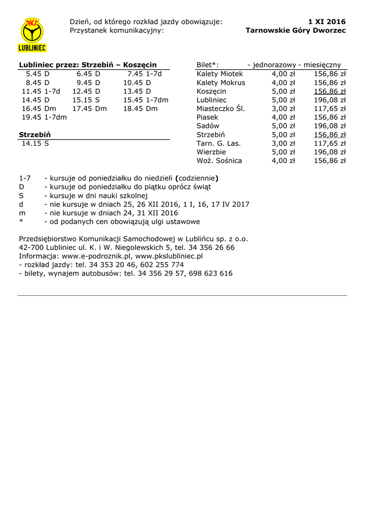 Dzień, od którego rozkład jazdy obowiązuje: Przystanek komunikacyjny: Lubliniec przez: Strzebiń – Koszęcin 5.45 D 6.45 D 7.45 1-7d 8.45 D 9.45 D 10.45 D 11.45 1-7d 12.45 D 13.45 D 14.45 D 15.15 S 15.45 1-7dm 16.45 Dm 17.45 Dm 18.45 Dm 19.45 1-7dm Strzebiń 14.15 S 1-7 D S d m * - 1 XI 2016 Tarnowskie Góry Dworzec Bilet*: - jednorazowy - miesięczny Kalety Miotek 4,00 zł 156,86 zł Kalety Mokrus 4,00 zł 156,86 zł Koszęcin 5,00 zł 156,86 zł Lubliniec 5,00 zł 196,08 zł Miasteczko Śl. 3,00 zł 117,65 zł Piasek 4,00 zł 156,86 zł Sadów 5,00 zł 196,08 zł Strzebiń 5,00 zł 156,86 zł Tarn. G. Las. 3,00 zł 117,65 zł Wierzbie 5,00 zł 196,08 zł Woź. Sośnica 4,00 zł 156,86 zł kursuje od poniedziałku do niedzieli (codziennie) kursuje od poniedziałku do piątku oprócz świąt kursuje w dni nauki szkolnej nie kursuje w dniach 25, 26 XII 2016, 1 I, 16, 17 IV 2017 nie kursuje w dniach 24, 31 XII 2016 od podanych cen obowiązują ulgi ustawowe Przedsiębiorstwo Komunikacji Samochodowej w Lublińcu sp. z o.o. 42-700 Lubliniec ul. K. i W. Niegolewskich 5, tel. 34 356 26 66 Informacja: www.e-podroznik.pl, www.pkslubliniec.pl - rozkład jazdy: tel. 34 353 20 46, 602 255 774 - bilety, wynajem autobusów: tel. 34 356 29 57, 698 623 616