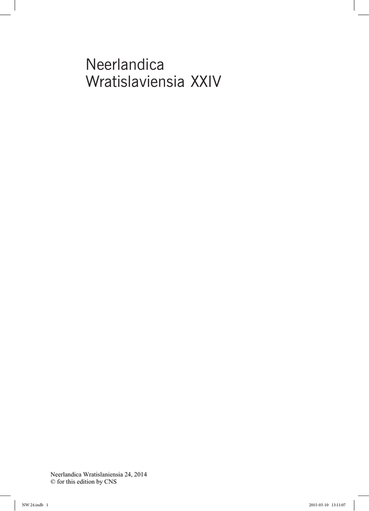 Neerlandica Wratislaviensia XXIV Neerlandica Wratislaniensia 24, 2014 © for this edition by CNS NW 24.indb 1 2015-03-10 13:11:07 Zespół Wydawniczy przy Katedrze Filologii Niderlandzkiej im. Erazma z Rotterdamu / Redactiecomité bij de Erasmus-Leerstoel voor Nederlandse Filologie / Editorial Board by the Erasmus Chair for Netherlandic Philology: Stefan Kiedroń (przewodniczący, redaktor naczelny / voorzitter, hoofdredacteur / chair, editor-in-chief), Siegfried Huigen, Irena Barbara Kalla, Jacek Karpiński, Norbert Morciniec, Stanisław Prędota, Saskia Teulings (redaktor językowy / taalredacteur / language editor), Jan Urbaniak (sekretarz redakcji / redactiesecretaris / editorial secretary) Rada Naukowa / Wetenschappelijke Raad / Scientific Board: Cor van Bree (Universiteit Leiden), C. Jac Conradie (Universiteit van Johannesburg), Gillis J. Dorleijn (Rijksuniversiteit Groningen), Dirk De Geest (Katholieke Universiteit Leuven), Arie Gelderblom (Universiteit Utrecht), Philippe Hiligsmann (Université Catholique de Louvain), Joop van der Horst (Katholieke Universiteit Leuven), Mary G. Kemperink (Rijksuniversiteit Groningen), Jacques Van Keymeulen (Universiteit Gent), Jan Konst (Freie Universität Berlin), Jan Noordegraaf (Vrije Universiteit Amsterdam), Dieter Stellmacher (Georg-August-Universität Göttingen), Siegfried Theissen (Koninklijke Academie voor Nederlandse Taal- en Letterkunde, Gent), Herbert Van Uffelen (Universität Wien), Bart Vervaeck (Universiteit Gent), Roland Willemyns (Vrije Universiteit Brussel) Lista recenzentów / Lijst van recensenten / List of reviewers: Hubert van den Berg (Uniwersytet im. Adama Mickiewicza w Poznaniu), Lars Bernaerts (Universiteit Gent), Andrzej Borowski (Uniwersytet Jagielloński), Karel Bostoen (Universiteit Leiden), Réka Bozzay (Debreceni Egyetem), Adam Bžoch (Slovenská Akadémia Vied Bratislava), Bożena Czarnecka (Uniwersytet Wrocławski), Anikó Daróczi (KGRE Budapeszt), Andrzej Dąbrówka (Instytut Badań Literackich PAN, Warszawa), Ewa Dynarowicz (Uniwersytet Wrocławski), Wilken Engelbrecht (Univerzita Palackého Olomouc), Arie Gelderblom (Universiteit Utrecht), Kees Groeneboer (Universitas Indonesia), Rick Honings (Universiteit Leiden), Joop van der Horst (Katholieke Universiteit Leuven), Matthias Hüning (Freie Universität Berlin), Michiel van Kempen (Universiteit van Amsterdam), Hubert Meeus (Universiteit Antwerpen), Ton Naaijkens (Universiteit Utrecht), Jan Noordegraaf (Vrije Universiteit Amsterdam), Jelica Novaković-Lopušina (Beogradski Univerzitet), Patrycja Poniatowska (Uniwersytet Wrocławski), Gábor Pusztai (Debreceni Egyetem), Agnes Sneller (Universiteit Utrecht), Paweł Stachura (Uniwersytet im. Adama Mickiewicza w Poznaniu), Els Stronks (Universiteit Utrecht), Carl De Strycker (Universiteit Gent), Marc Van Vaeck (Katholieke Universiteit Leuven), Wim Vandenbussche (Vrije Universiteit Brussel), Pieter Verstraeten (Katholieke Universiteit Leuven), Ulrike Vogl (Universität Wien) Neerlandica Wratislaniensia 24, 2014 © for this edition by CNS NW 24.indb 2 2015-03-10 13:11:08 Neerlandica Wratislaviensia XXIV Onder redactie van / Edited by Jacek Karpiński en Stanisław Prędota Wrocław 2014 Wydawnictwo Uniwersytetu Wrocławskiego Neerlandica Wratislaniensia 24, 2014 © for this edition by CNS NW 24.indb 3 2015-03-10 13:11:08 Acta Universitatis Wratislaviensis No 3619 © Copyright by Wydawnictwo Uniwersytetu Wrocławskiego Sp. z o.o., Wrocław 2014 ISSN 0239-6661 (AUWr) ISSN 0860-0716 (NW) Nakład: 200 egz. Wersją pierwotną czasopisma jest wersja drukowana. Publikacja przygotowana w Wydawnictwie Uniwersytetu Wrocławskiego Sp. z o.o. 50-137 Wrocław, pl. Uniwersytecki 15 tel. 71 3752885, e-mail: [email protected] Neerlandica Wratislaniensia 24, 2014 © for this edition by CNS NW 24.indb 4 2015-03-10 13:11:08 Inhoud Taalkunde Cor VAN BREE, Adpositionele configuraties in het Nederlands . . . . . . . . . . . . . . . Siegfried THEISSEN, De frequentie van een vijftigtal dubbele en driedubbele voorzetsels . . Roland WILLEMYNS, Wim VANDENBUSSCHE, „Im Westen nichts Neues“? Over diglossie, diaglossie en tussentaal in West-Vlaanderen . . . . . . . . . . . . . . . . . . . . Jan NOORDEGRAAF, Koloniaal Nederlands in verandering. Afrikaans versus Amerikaans Leeg Duits . . . . . . . . . . . . . . . . . . . . . . . . . . . . . . . . . . . . . . . . Katarzyna TRYCZYŃSKA, Collocaties in het Juridisch Woordenboek van Fockema Andreae. Een frequentieanalyse . . . . . . . . . . . . . . . . . . . . . . . . . . . . . . . . . . Stanisław PRĘDOTA, Nederlandse equivalenten van Poolse spreekwoorden in Chłopi van W.S. Reymont . . . . . . . . . . . . . . . . . . . . . . . . . . . . . . . . . . . . . . Muriel WATERLOT, Aanspreekvormen in Poolse, Nederlandse en Vlaamse onlinepersoneelsadvertenties voor hoogopgeleiden . . . . . . . . . . . . . . . . . . . . . . . . . . . . Jacek KARPIŃSKI, KLM vs. LOT vs. Divi Divi Air. Wat verbergt zich achter de namen van luchtvaartmaatschappijen in Polen en in het Nederlandse taalgebied? . . . . . . . . . Dieter STELLMACHER, Steenkolenduits und die Schwierigkeit, Sprache und Sprachgebrauch zu unterscheiden . . . . . . . . . . . . . . . . . . . . . . . . . . . . . . . . . C. Jac CONRADIE, Waar zijn de Afrikaanse mutatieven gebleven? . . . . . . . . . . . . . 11 27 43 67 93 107 115 133 143 153 Boekbespreking Ute K. Boonen, Ingeborg Harmes in Zusammenarbeit mit Michaela Poß, Truus Kruyt und Gunther De Vogelaer, Niederländische Sprachwissenschaft. Eine Einführung, Tübingen 2013, Narr Francke Attempto Verlag GmbH + Co .KG. (Stanisław Prędota) . . . 165 Neerlandica Wratislaniensia 24, 2014 © for this edition by CNS NW 24.indb 5 2015-03-10 13:11:08 Neerlandica Wratislaniensia 24, 2014 © for this edition by CNS NW 24.indb 6 2015-03-10 13:11:08 Table of Contents Linguistics Cor VAN BREE, Adpositional configurations in Dutch . . . . . . . . . . . . . . . . . . . . Siegfried THEISSEN, The frequency of fifty d