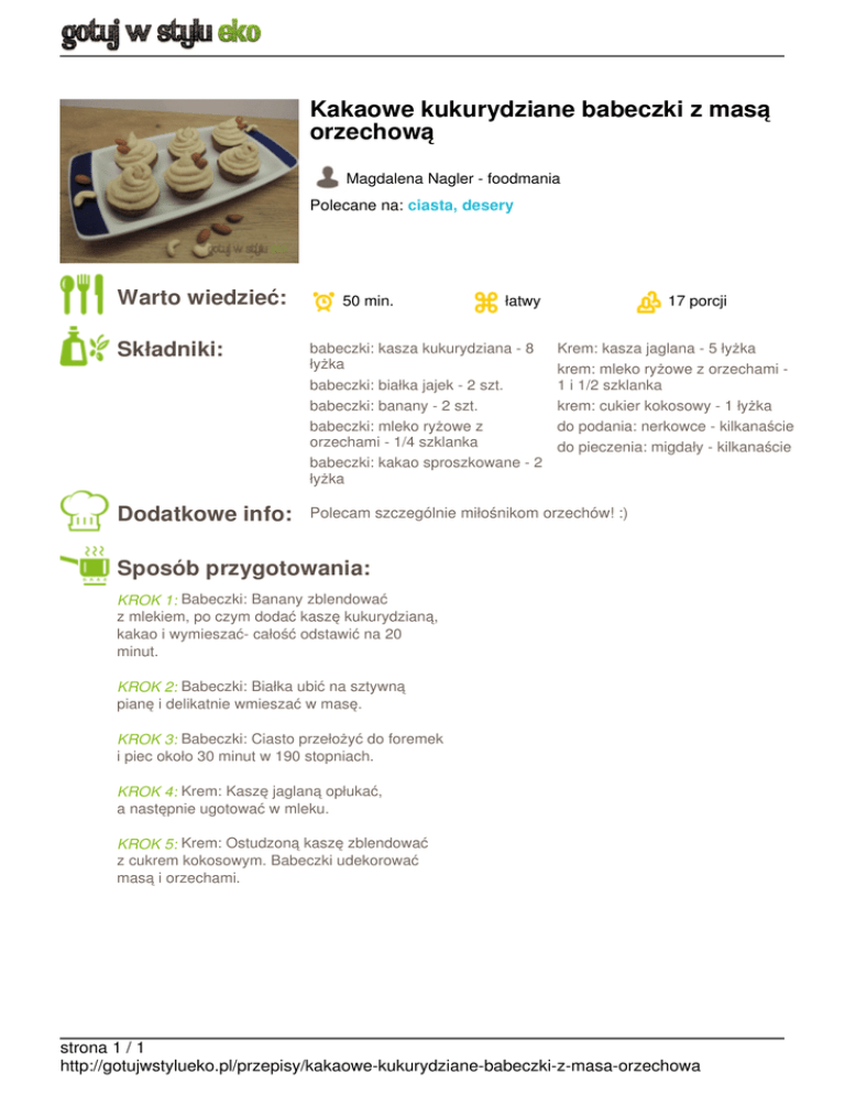 Kakaowe kukurydziane babeczki z masą orzechową Magdalena Nagler - foodmania Polecane na: ciasta, desery Warto wiedzieć: 50 min. łatwy 17 porcji Składniki: babeczki: kasza kukurydziana - 8 łyżka babeczki: białka jajek - 2 szt. babeczki: banany - 2 szt. babeczki: mleko ryżowe z orzechami - 1/4 szklanka babeczki: kakao sproszkowane - 2 łyżka Dodatkowe info: Polecam szczególnie miłośnikom orzechów! :) Krem: kasza jaglana - 5 łyżka krem: mleko ryżowe z orzechami 1 i 1/2 szklanka krem: cukier kokosowy - 1 łyżka do podania: nerkowce - kilkanaście do pieczenia: migdały - kilkanaście Sposób przygotowania: KROK 1: Babeczki: Banany zblendować z mlekiem, po czym dodać kaszę kukurydzianą, kakao i wymieszać- całość odstawić na 20 minut. KROK 2: Babeczki: Białka ubić na sztywną pianę i delikatnie wmieszać w masę. KROK 3: Babeczki: Ciasto przełożyć do foremek i piec około 30 minut w 190 stopniach. KROK 4: Krem: Kaszę jaglaną opłukać, a następnie ugotować w mleku. KROK 5: Krem: Ostudzoną kaszę zblendować z cukrem kokosowym. Babeczki udekorować masą i orzechami. strona 1 / 1 http://gotujwstylueko.pl/przepisy/kakaowe-kukurydziane-babeczki-z-masa-orzechowa Powered by TCPDF (www.tcpdf.org)