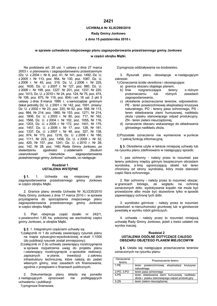 2421 UCHWAŁA Nr XLIX/299/2010 Rady Gminy Jonkowo z dnia 15 października 2010 r. w sprawie uchwalenia miejscowego planu zagospodarowania przestrzennego gminy Jonkowo w części obrębu Mątki. Na podstawie art. 20 ust. 1 ustawy z dnia 27 marca 2003 r. o planowaniu i zagospodarowaniu przestrzennym (Dz. U. z 2004 r. Nr 6, poz. 41, Nr 141, poz. 1492, Dz. U. z 2005 r. Nr 113, poz. 954, Nr 130, poz. 1087, Dz. U. z 2006 r. Nr 45, poz. 319, Dz. U. z 2006 r. Nr 225, poz. 1635, Dz. U. z 2007 r. Nr 127, poz. 880, Dz. U. z 2008 r. Nr 199, poz. 1227, Nr 201, poz. 1237, Nr 220, poz. 1413, Dz. U. z 2010 r. Nr 24, poz. 124, Nr 75, poz. 474, Nr 106, poz. 675, Nr 119, poz. 804) i art. 18 ust. 2 pkt 5 ustawy z dnia 8 marca 1990 r. o samorządzie gminnym (tekst jednolity Dz. U. z 2001 r. Nr 142, poz. 1591, zmiany: Dz. U. z 2002 r. Nr 23, poz. 220, Nr 62, poz. 558, Nr 113, poz. 984, Nr 214, poz. 1860, Nr 153, poz. 1271, Nr 214, poz. 1806, Dz. U. z 2003 r. Nr 80, poz. 717, Nr 162, poz. 1568, Dz. U. z 2004 r. Nr 102, poz. 1055, Nr 116, poz. 1203, Dz. U. z 2005 r. Nr 172, poz. 1441, Nr 175, poz. 1457, Dz. U. z 2006 r. Nr 17, poz. 128, Nr 181, poz. 1337, Dz. U. z 2007 r. Nr 48, poz. 327, Nr 138, poz. 974, Nr 173, poz. 1218, Dz. U. z 2008 r. Nr 180, poz. 1111, Nr 223, poz. 1458, Dz. U. z 2009 r. Nr 52, poz. 420, Nr 157, poz. 1241, Dz. U. z 2010 r. Nr 28, poz. 142, Nr 28, poz. 146) Rada Gminy Jonkowo, po stwierdzeniu zgodności z ustaleniami „Studium uwarunkowań i kierunków zagospodarowania przestrzennego gminy Jonkowo” uchwala, co następuje: Rozdział 1 USTALENIA WSTĘPNE § 1. 1. Uchwala się miejscowy plan zagospodarowania przestrzennego gminy Jonkowo w części obrębu Mątki. 2. Granice planu określa Uchwała Nr XLI/235/2010 Rady Gminy Jonkowo z dnia 17 marca 2010 r. w sprawie przystąpienia do sporządzenia miejscowego planu zagospodarowania przestrzennego gminy Jonkowo w części obrębu Mątki. 3. Plan obejmuje część działki nr 242/1, o powierzchni 1,85 ha, położonej we wschodniej części gminy Jonkowo, w obrębie Mątki. § 2. 1. Integralnymi częściami uchwały są: 1) załącznik nr 1 do uchwały zawierający rysunek planu na mapie sytuacyjno-wysokościowej w skali 1:1000 (do publikacji rysunek został zmniejszony); 2) załącznik nr 2 do uchwały zawierający rozstrzygnięcia w sprawie rozpatrzenia uwag do projektu planu i zawierający rozstrzygnięcie o sposobie realizacji, zapisanych w planie, inwestycji z zakresu infrastruktury technicznej, które należą do zadań własnych gminy, oraz zasadach ich finansowania, zgodnie z przepisami o finansach publicznych. 2. Dokumentacja planu z następujących opracowań uchwaleniu i publikacji: 1) prognoza finansowa; składa nie się ponadto podlegających 2) prognoza oddziaływania na środowisko. 3. Rysunek planu obowiązuje w następującym zakresie: 1) Oznaczenia ściśle określone i obowiązujące: a) granica obszaru objętego planem, b) linie rozgraniczające tereny o różnym przeznaczeniu lub różnych zasadach zagospodarowania, c) określenie przeznaczenia terenów, odpowiednio: PE - teren powierzchniowej eksploatacji kruszywa naturalnego, PO - tereny pasa ochronnego, PS teren składowania ziemi humusowej, nadkładu złoża i piasku stanowiącego odpad produkcyjny, ZN - teren zieleni nieurządzonej, d) oznaczenie obszaru wskazanego do składowania gliniastego nadkładu złoża, 2) Pozostałe oznaczenia nie wymienione w punkcie 1 pełnią funkcję informacyjną. § 3. Określenia użyte w tekście niniejszej uchwały lub na rysunku planu zdefiniowano w następujący sposób: 1. pas ochronny - należy przez to rozumieć pas terenu położony między górnym bezpiecznym obrzeżem wyrobiska, a linią ograniczającą obiekt lub teren chroniony od strony wyrobiska, który może stanowić część filara ochronnego. 2. filar ochronny - należy przez to rozumieć obszar, w granicach którego, ze względu na ochronę oznaczonych dóbr, wydobywanie kopalin nie może być prowadzone albo może być dozwolone tylko w sposób zapewniający ochronę tych dóbr. 3. wyrobisko górnicze - należy przez to rozumieć przestrzeń w nieruchomości gruntowej lub w górotworze powstałą w wyniku robót górniczych. 4. uchwała - należy przez to rozumieć niniejszą uchwałę Rady Gminy Jonkowo, jeżeli z treści ustaleń nie wynika inaczej. Rozdział 2 USTALENIA OGÓLNE DOTYCZĄCE CAŁEGO OBSZARU OBJĘTEGO PLANEM MIEJSCOWYM § 4. Ustala się następujące przeznaczenie terenów oznaczonych na rysunku planu: Oznaczenie terenu 1.PE 2.PO, 3.PO 4.PS 5.ZN Przeznaczenie terenu teren powierzchniowej eksploatacji kruszywa naturalnego teren pasa ochronnego teren składowania ziemi humusowej, nadkładu złoża i piasku stanowiącego odpad produkcyjny teren zieleni nieurządzonej § 5. Zasady przestrzennego: ochrony i kształtowania ładu 1. Eksploatacja odkrywkowa powinna odbywać się zgodnie z przepisami prawa geologicznego i górniczego. 2. Eksploatacja powinna być prowadzona, z uwzględnieniem wymogów technologicznych oraz w sposób minimalizujący wpływ prowadzonego wydobycia na krajobraz. 3. Ustala się pas ochronny, którego szerokość określa się w ustaleniach szczegółowych, zawartych w Rozdziale III. 7. W obszarze planu nie wskazuje się terenów podlegających ograniczeniom dopuszczalnego poziomu hałasu z tytułu przepisów ochrony środowiska. § 7. Zasady ochrony dziedzictwa kulturowego i zabytków oraz dóbr kultury współczesnej. 1. Na terenie objętym planem nie występują obiekty podlegające lub mogące podlegać ochronie. 2. W przypadku natrafienia na zabytki archeologiczne należy niezwłocznie powiadomić Wojewódzkiego Konserwatora Zabytków o znalezisku. 4. Ustala się kierunek rekultywacji terenów po zakończeniu eksploatacji złoża: rolniczy lub leśny. § 8. Zasady kształtowania przestrzeni publicznych na terenie nie występują przestrzenie publiczne w rozumieniu art. 2 pkt 6 ustawy o planowaniu i zagospodarowaniu przestrze