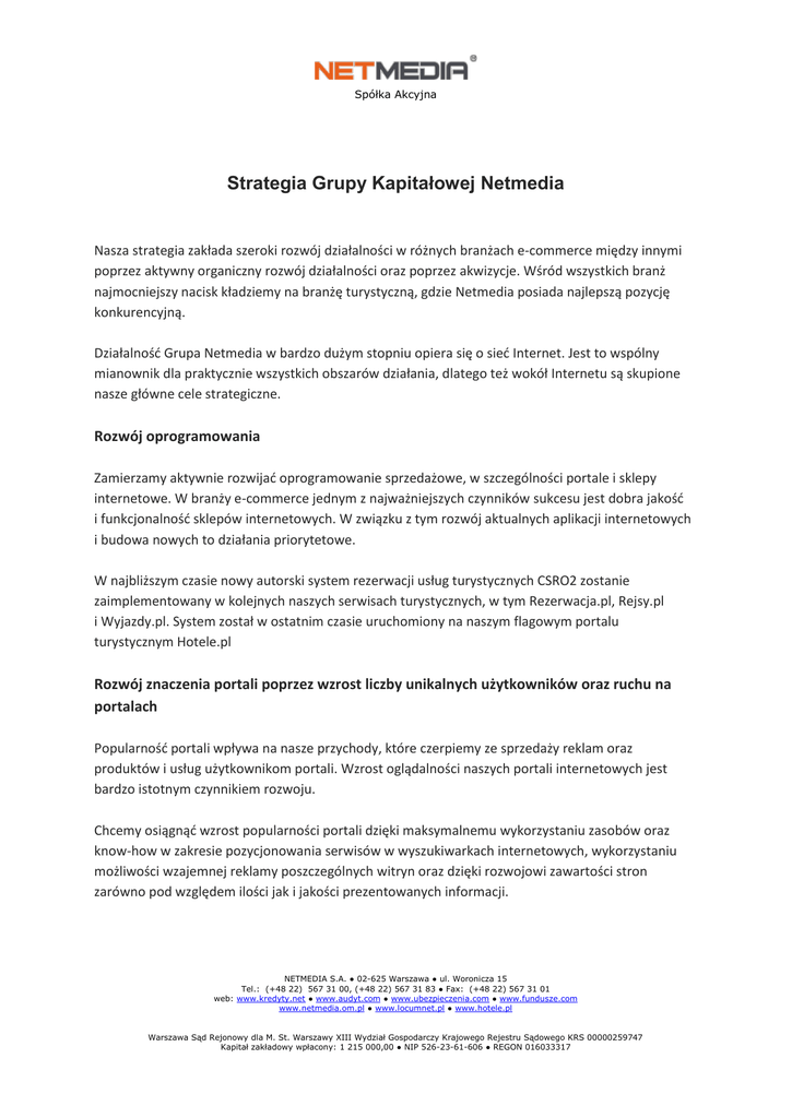 Spółka Akcyjna Strategia Grupy Kapitałowej Netmedia Nasza strategia zakłada szeroki rozwój działalności w różnych branżach e-commerce między innymi poprzez aktywny organiczny rozwój działalności oraz poprzez akwizycje. Wśród wszystkich branż najmocniejszy nacisk kładziemy na branżę turystyczną, gdzie Netmedia posiada najlepszą pozycję konkurencyjną. Działalnośd Grupa Netmedia w bardzo dużym stopniu opiera się o sied Internet. Jest to wspólny mianownik dla praktycznie wszystkich obszarów działania, dlatego też wokół Internetu są skupione nasze główne cele strategiczne. Rozwój oprogramowania Zamierzamy aktywnie rozwijad oprogramowanie sprzedażowe, w szczególności portale i sklepy internetowe. W branży e-commerce jednym z najważniejszych czynników sukcesu jest dobra jakośd i funkcjonalnośd sklepów internetowych. W związku z tym rozwój aktualnych aplikacji internetowych i budowa nowych to działania priorytetowe. W najbliższym czasie nowy autorski system rezerwacji usług turystycznych CSRO2 zostanie zaimplementowany w kolejnych naszych serwisach turystycznych, w tym Rezerwacja.pl, Rejsy.pl i Wyjazdy.pl. System został w ostatnim czasie uruchomiony na naszym flagowym portalu turystycznym Hotele.pl Rozwój znaczenia portali poprzez wzrost liczby unikalnych użytkowników oraz ruchu na portalach Popularnośd portali wpływa na nasze przychody, które czerpiemy ze sprzedaży reklam oraz produktów i usług użytkownikom portali. Wzrost oglądalności naszych portali internetowych jest bardzo istotnym czynnikiem rozwoju. Chcemy osiągnąd wzrost popularności portali dzięki maksymalnemu wykorzystaniu zasobów oraz know-how w zakresie pozycjonowania serwisów w wyszukiwarkach internetowych, wykorzystaniu możliwości wzajemnej reklamy poszczególnych witryn oraz dzięki rozwojowi zawartości stron zarówno pod względem ilości jak i jakości prezentowanych informacji. NETMEDIA S.A. ● 02-625 Warszawa ● ul. Woronicza 15 Tel.: (+48 22) 567 31 00, (+48 22) 567 31 83 ● Fax: (+48 22) 567 31 01 web: www.kredyty.net ● www.audyt.com ● www.ubezpieczenia.com ● www.fundusze.com www.netmedia.om.pl ● www.locumnet.pl ● www.hotele.pl Warszawa Sąd Rejonowy dla M. St. Warszawy XIII Wydział Gospodarczy Krajowego Rejestru Sądowego KRS 00000259747 Kapitał zakładowy wpłacony: 1 215 000,00 ● NIP 526-23-61-606 ● REGON 016033317 Spółka Akcyjna Powiększanie bazy reklamodawców Nasze portale są atrakcyjnym miejscem do prezentowania reklam. Zamierzamy zintensyfikowad swoje działania związane z dotarciem do potencjalnych klientów, w tym nawiązad ściślejsze relacje z sieciami reklamowymi, brokerami internetowymi, domami mediowymi oraz bezpośrednio z reklamodawcami. Poszerzanie asortymentu oferowanych produktów i usług Zwiększenie asortymentu oferowanych produktów i usług wpłynie na zwiększenie atrakcyjności poszczególnych witryn dla ich użytkowników. W szczególności będziemy dążyd do budowy na polskim rynku najszerszej oferty obiektów hotelowych, których miejsca noclegowe sprzedawane będą poprzez własny system rezerwacji CSRO2. Umacnianie pozycji marek Zamierzamy umocnid posiadane marki (znaki towarowe) poprzez odpowiednio dobrane działania marketingowe w różnych mediach, również poza siecią Internet. Działania będą miały na celu zwiększenie rozpoznawalności oraz zasięgu oddziaływania posiadanych marek, w szczególności tych związanych z rynkiem nieruchomości oraz rynkiem turystycznym. Dodatkowo zamierzamy zwiększyd działania promocyjne i sprzedażowe, w tym pozycjonowanie w wyszukiwarkach Internetowych oraz kampanie reklamowe w Internecie na własnych oraz zewnętrznych portalach. Istnieją wszelkie przesłanki dla dalszego dynamicznego rozwoju Spółki w kolejnych latach. Spółka w przeważającej większości działa na bardzo perspektywicznych i szybko rozwijających się rynkach. Spółce sprzyja również sam rozwój Internetu w Polsce, w szczególności szerokopasmowego dostępu do Internetu, oraz rynku e-commerce, gdzie szybko zwiększa się liczba osób regularnie dokonujących zakupów poprzez sied Internet. Dodatkowo w Polsce cały czas dynamicznie rozwija się dostęp ludności do kart kredytowych oraz innych produktów bankowych co ułatwia dokonywania zakupów poprzez sied Internet. NETMEDIA S.A. ● 02-625 Warszawa ● ul. Woronicza 15 Tel.: (+48 22) 567 31 00, (+48 22) 567 31 83 ● Fax: (+48 22) 567 31 01 web: www.kredyty.net ● www.audyt.com ● www.ubezpieczenia.com ● www.fundusze.com www.netmedia.om.pl ● www.locumnet.pl ● www.hotele.pl Warszawa Sąd Rejonowy dla M. St. Warszawy XIII Wydział Gospodarczy Krajowego Rejestru Sądowego KRS 00000259747 Kapitał zakładowy wpłacony: 1 215 000,00 ● NIP 526-23-61-606 ● REGON 016033317