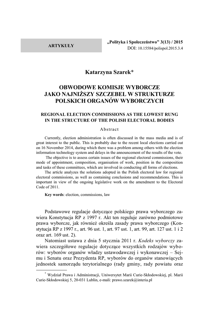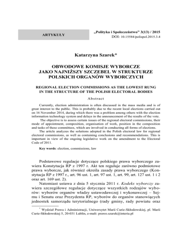 46 KATARZYNA SZAREK ARTYKUŁY „Polityka i Społeczeństwo” 3(13) / 2015 DOI: 10.15584/polispol.2015.3.4 Katarzyna Szarek* OBWODOWE KOMISJE WYBORCZE JAKO NAJNIŻSZY SZCZEBEL W STRUKTURZE POLSKICH ORGANÓW WYBORCZYCH REGIONAL ELECTION COMMISSIONS AS THE LOWEST RUNG IN THE STRUCTURE OF THE POLISH ELECTORAL BODIES Ab s tr a ct Currently, election administration is often discussed in the mass media and is of great interest to the public. This is probably due to the recent local elections carried out on 16 November 2014, during which there was a problem among others with the election information technology system and delays in the announcement of the results of the vote. The objective is to assess certain issues of the regional electoral commissions, their mode of appointment, composition, organisation of work, position in the composition and tasks of these committees, which are involved in conducting all forms of elections. The article analyzes the solutions adopted in the Polish electoral law for regional electoral commissions, as well as containing conclusions and recommendations. This is important in view of the ongoing legislative work on the amendment to the Electoral Code of 2011. Key words: election, commissions, law Podstawowe regulacje dotyczące polskiego prawa wyborczego zawiera Konstytucja RP z 1997 r. Akt ten reguluje zarówno podmiotowe prawa wyborcze, jak również określa zasady prawa wyborczego (Konstytucja RP z 1997 r., art. 96 ust. 1, art. 97 ust. 1, art. 99, art. 127 ust. 1 i 2 oraz art. 169 ust. 2). Natomiast ustawa z dnia 5 stycznia 2011 r. Kodeks wyborczy zawiera szczegółowe regulacje dotyczące wszystkich rodzajów wyborów: wyborów organów władzy ustawodawczej i wykonawczej – Sejmu i Senatu oraz Prezydenta RP, wyborów do organów stanowiących jednostek samorządu terytorialnego (rady gminy, rady powiatu oraz * Wydział Prawa i Administracji, Uniwersytet Marii Curie-Skłodowskiej, pl. Marii Curie-Skłodowskiej 5, 20-031 Lublin, e-mali: [email protected] Obwodowe komisje wyborcze jako najniższy szczebel w strukturze... 47 sejmiku województwa samorządowego) i wyborów organu wykonawczego w gminie (wójta, burmistrza, prezydenta miasta), a także wyborów do Parlamentu Europejskiego. Kodeks wyborczy jest de facto aktem wykonawczym do Konstytucji RP, pozwalającym na zrealizowanie określonych zasad wyłaniania organów przedstawicielskich (Czaplicki 2014). Art. 152 Kodeksu wyborczego określa ogólny zarys ustroju organów wyborczych w Polsce. W myśl tego przepisu należy wyróżnić organy o stałym charakterze i takie, które powoływane są ad hoc, w związku z zarządzonymi wyborami. Do organów o stałym charakterze zalicza się Państwową Komisję Wyborczą, jak również komisarzy wyborczych. Natomiast do organów wyborczych o niestałym charakterze należy zaliczyć: okręgowe komisje wyborcze, rejonowe komisje wyborcze, terytorialne komisje wyborcze oraz obwodowe komisje wyborcze. Organy te powoływane są na czas wykonania powierzonych im zadań (Kisielewicz 2014). Podział zadań i kompetencji pomiędzy poszczególne komisje wyborcze ma charakter ustawowy. W myśl art. 152 § 4 Kodeksu wyborczego właściwość rzeczową oraz miejscową komisji określają przepisy szczególne kodeksu. Okręgowe komisje wyborcze biorą udział w każdych wyborach, z wyjątkiem wyborów samorządowych (wyborów organów stanowiących poszczególnych jednostek samorządu terytorialnego i wyborów wójta, burmistrza, prezydenta miasta). Rejonowe komisje wyborcze są powoływane do przeprowadzenia wyborów do Parlamentu Europejskiego (Kisielewicz 2014). Natomiast terytorialne komisje wyborcze funkcjonują wyłącznie w wyborach samorządowych, a więc w wyborach do rad gmin, rad powiatów i sejmików województw, jak również w wyborach wójta, burmistrza i prezydenta miasta (Sokala 2010: 184). Z kolei obwodowe komisje wyborcze stanowią najniższy szczebel w strukturze organów wyborczych. Uczestniczą w przeprowadzaniu wszystkich rodzajów wyborów. Zajmują się głównie zorganizowaniem głosowania w obwodzie, a następnie ustalaniem wyników głosowania i podaniem ich do publicznej wiadomości (Kisielewicz 2014). Rozpoczynając jednak rozważania na temat obwodowych komisji wyborczych, należy wyjść od definicji organu wyborczego. „Organ wyborczy” to w rozumieniu ustrojowym „organ administracji publicznej, który utworzono głównie lub wyłącznie w celu organizowania oraz przeprowadzania wyborów i w związku z tym wyposażono go w kompetencje do podejmowania określonych czynności prawnych zwanych czynnościami wyborczymi” (Michalak, Sokala 2010). 48 KATARZYNA SZAREK Skład, powoływanie i rozwiązywanie obwodowych komisji wyborczych W myśl art. 182 § 1 Kodeksu wyborczego obwodową komisję wyborczą powołuje spośród wyborców w wyborach do Sejmu i do Senatu, w wyborach Prezydenta Rzeczypospolitej oraz w wyborach do Parlamentu Europejskiego w Rzeczypospolitej Polskiej – wójt (odpowiednio burmistrz lub prezydent miasta). Czyni to najpóźniej w 21. dniu przed dniem wyborów (dniem głosowania). Natomiast w wyborach do organów stanowiących jednostek samorządu terytorialnego oraz w wyborach wójtów powołuje ją właściwa terytorialna komisja wyborcza. Odbywa się to również najpóźniej w 21. dniu przed dniem wyborów (dniem głosowania). To rozwiązanie wydaje się zasadne z uwagi na fakt, iż organ wykonawczy samorządu terytorialnego z reguły jest najbardziej zainteresowany wynikiem przeprowadzanych wyborów samorządowych. Pozbawienie go w tym przypadku prawa powoływania składu komisji obwodowych w naturalny sposób uwalnia go od pokus, jak i zarzutu oddziaływania na wynik wyborów (Skotnicki 2007: 156). Z kolei obwodowe komisje wyborcze w obwodach głosowania utworzonych na polskich statkach morskich i za granicą powołują spośród wyborców odpowiednio kapitanowie tych statków oraz konsulowie. Tryb i termin powołani