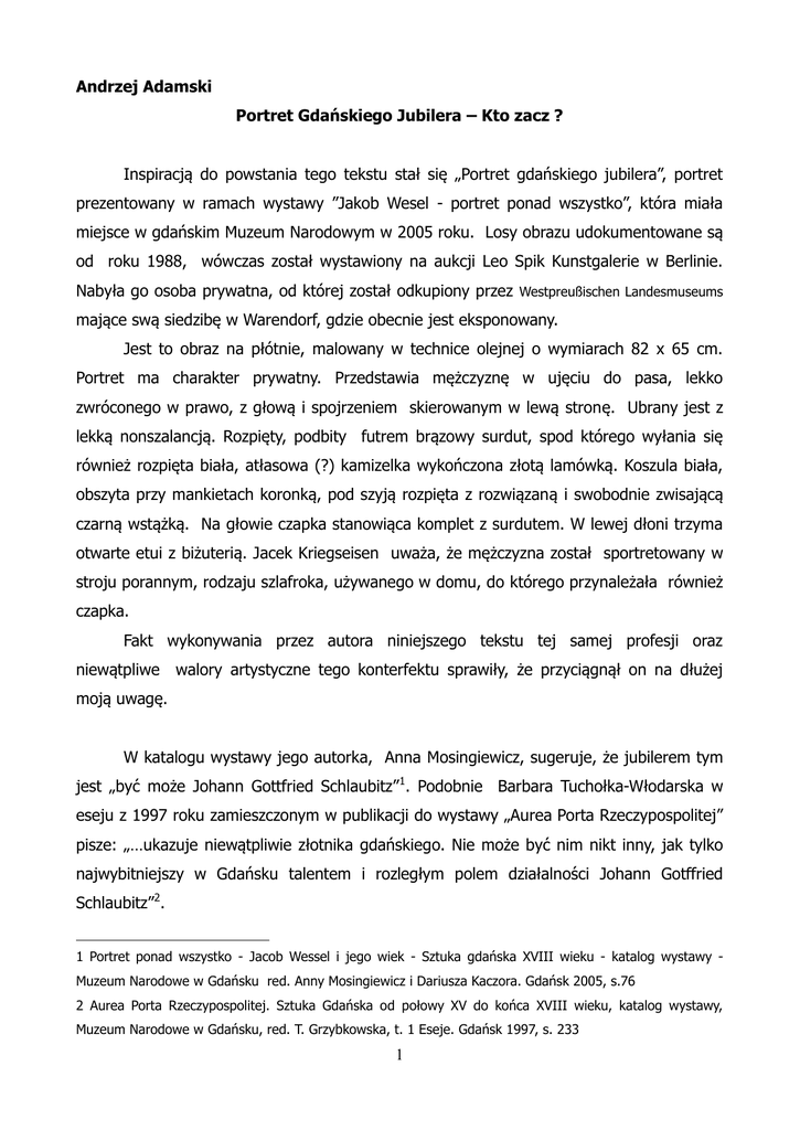 Andrzej Adamski Portret Gdańskiego Jubilera – Kto zacz ? Inspiracją do powstania tego tekstu stał się „Portret gdańskiego jubilera”, portret prezentowany w ramach wystawy ”Jakob Wesel - portret ponad wszystko”, która miała miejsce w gdańskim Muzeum Narodowym w 2005 roku. Losy obrazu udokumentowane są od roku 1988, wówczas został wystawiony na aukcji Leo Spik Kunstgalerie w Berlinie. Nabyła go osoba prywatna, od której został odkupiony przez Westpreußischen Landesmuseums mające swą siedzibę w Warendorf, gdzie obecnie jest eksponowany. Jest to obraz na płótnie, malowany w technice olejnej o wymiarach 82 x 65 cm. Portret ma charakter prywatny. Przedstawia mężczyznę w ujęciu do pasa, lekko zwróconego w prawo, z głową i spojrzeniem skierowanym w lewą stronę. Ubrany jest z lekką nonszalancją. Rozpięty, podbity futrem brązowy surdut, spod którego wyłania się również rozpięta biała, atłasowa (?) kamizelka wykończona złotą lamówką. Koszula biała, obszyta przy mankietach koronką, pod szyją rozpięta z rozwiązaną i swobodnie zwisającą czarną wstążką. Na głowie czapka stanowiąca komplet z surdutem. W lewej dłoni trzyma otwarte etui z biżuterią. Jacek Kriegseisen uważa, że mężczyzna został sportretowany w stroju porannym, rodzaju szlafroka, używanego w domu, do którego przynależała również czapka. Fakt wykonywania przez autora niniejszego tekstu tej samej profesji oraz niewątpliwe walory artystyczne tego konterfektu sprawiły, że przyciągnął on na dłużej moją uwagę. W katalogu wystawy jego autorka, Anna Mosingiewicz, sugeruje, że jubilerem tym jest „być może Johann Gottfried Schlaubitz”1. Podobnie Barbara Tuchołka-Włodarska w eseju z 1997 roku zamieszczonym w publikacji do wystawy „Aurea Porta Rzeczypospolitej” pisze: „…ukazuje niewątpliwie złotnika gdańskiego. Nie może być nim nikt inny, jak tylko najwybitniejszy w Gdańsku talentem i rozległym polem działalności Johann Gotffried Schlaubitz”2. 1 Portret ponad wszystko - Jacob Wessel i jego wiek - Sztuka gdańska XVIII wieku - katalog wystawy Muzeum Narodowe w Gdańsku red. Anny Mosingiewicz i Dariusza Kaczora. Gdańsk 2005, s.76 2 Aurea Porta Rzeczypospolitej. Sztuka Gdańska od połowy XV do końca XVIII wieku, katalog wystawy, Muzeum Narodowe w Gdańsku, red. T. Grzybkowska, t. 1 Eseje. Gdańsk 1997, s. 233 1 Hipoteza ta jednak wydaje się mało prawdopodobna. Obraz posiada sygnaturę z roku 1771, jest to również rok śmierci Schlaubitza, a biorąc pod uwagę fakt, że zmarł on w wieku 64 lat, nie jest to na pewno jego wizerunek. Portret przedstawia bowiem mężczyznę znacznie młodszego, przypuszczalnie w czwartej dekadzie życia. Ocena wieku jest zawsze kwestią subiektywną. Szukając punktu odniesienia, prześledziłem portrety mężczyzn autorstwa Jacoba Wessela. Wybrałem dwa, przedstawiające mężczyzn między 30-tym a 45 rokiem życia: Friedricha Muhla - 34 lata, oraz Ernsta Augusta Bertlinga - 41 lat. Ze względu na wiek, postać jubilera możemy usytuować w pobliżu wizerunku Friedricha Muhla. Nie znajduje też żadnego uzasadnienia teza, by Jacob Wessel stworzył wizerunek Schlaubitza sprzed lat. Innymi słowy, założenie to wydało mi się oparte na wątpliwych przesłankach i zainspirowało mnie do własnych poszukiwań. Starałem się uwzględnić wszystkie, istotne dla identyfikacji postaci na portrecie uwarunkowania dotyczące gdańskiego złotnictwa w XVIII w. - o których poniżej - oraz pojawiające się nowe watki. Mimo, że do nauki zawodu złotnika w XVIII w. - po okresie próby - przyjmowani byli wszyscy mogący udokumentować swoje pochodzenie czyli urodzeni z legalnego związku oraz spełniający postawione przez władze gdańskiego cechu pozostałe warunki. Bardzo istotne były względy ekonomiczne. Uzyskanie tytułu wiązało się z poniesieniem znacznych nakładów finansowych. Władze cechowe określały nawet niezbędne minimum, jakim powinien dysponować przyszły mistrz. Uprzywilejowani byli zatem kandydaci wywodzący się z zamożnych rodzin lub dzieci czynnych złotników. Ci ostatni dodatkowo korzystali z licznych przywilejów, takich jak niższe opłaty cechowe, krótszy staż, pierwszeństwo wyzwoleniu na mistrza. Złotników jako przedstawicieli rzemiosł luksusowych, w w tym czasie zaliczyć możemy do grupy ludzi zamożnych niejednokrotnie właścicieli znacznych fortun oraz o ustabilizowanej pozycji społecznej. Drugą ważną przesłankę, na którą warto zwrócić uwagę, stanowią ówczesne przepisy statutowe. Nakładały one na nowego członka cechu otwierającego własną pracownię moralny i prawny obowiązek zawarcia związku małżeńskiego w przeciągu roku od uzyskania dyplomu. Ponadto jedynie żonaty mistrz miał prawo szkolenia uczniów i zatrudniania czeladników – a był to istotny czynnik decydujący o możliwościach produkcyjnych pracowni. Po trzecie spróbujmy rozważyć z jaką profesją w ramach cechu związany był mężczyzna z portretu. Należy pamiętać o podziale wewnątrzcechowym, jaki dokonał się 2 na początku XVIII wieku, ze względu na wytwarzany asortyment oraz metal, jakim się posługiwano. Tu pojawia się problem z nazewnictwem, spotykamy różne opinie. Michał Woźniak pisze ”... nazwa złotnik (Goldschmied), jako tradycyjna, dotycząca właściwie produkcji w całym zakresie typów i technik, stała się określeniem ogólnym; ci spośród nich, którzy pracowali w srebrze, zwani byli Silberarbejter, operujący złotem – Goldarbeiter; praktycznie podział ten przebiegał nie tylko materiałowo, ale i rzeczowo: pierwsi wykonywali przede wszystkim wyroby korpusowe, drudzy – biżuterię.”3 Natomiast Jacek Kriegseisen jest zdania, że pod koniec XVIII w. określenia: Goldarbeiter i Silberarbejter, odnoszą się raczej do czeladników. Najwłaściwsze według niego, byłoby używanie w stosunku do złotników-jubilerów określenia "biżu