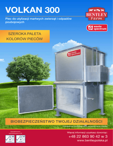 VOLKAN 300 Piec do utylizacji martwych zwierząt i odpadów poubojowych SZEROKA PALETA KOLORÓW PIECÓW BIOBEZPIECZEŃSTWO TWOJEJ DZIAŁALNOŚCI Przedstawione kolory mogą różnić się nieznacznie od oryginału Zaprojektowane i wyprodukowane w UK QM S ISO 9001 REGISTERED FIRM QM S ISO 14001 REGISTERED FIRM Więcej informacji uzyskasz dzwoniąc: +48 22 863 90 42 w 3 www.bentleypolska.pl ŚREDNIEJ POJEMNOŚCI PIEC DO SPOPIELANIA MARTWYCH ZWIERZĄT VOLKAN 300 Piece Volkan to seria wysoce wydajnych urządzeń do usuwania poprzez spopielanie niewielkich gatunków zwierząt oraz wszystkich rodzajów odpadów zwierzęcych. Piece Volkan są niezwykle wytrzymałe. Wykonane zostały przy użyciu materiałów o bardzo wysokiej jakości. Urządzenia zaprojektowane zostały w taki sposób aby odpowiadać każdej potrzebie utylizacji odpadów zwierzęcych. Volkan 300 to wydajny i bardzo wytrzymały piec, wyposażony w zintegrowany palnik “dopalacza”, dzięki czemu jest w pełni zgodny z normami i prawem UE. Urządzenie jest idealnym rozwiązaniem do spopielania trzody chlewnej, dużych psów, owiec lub dużych odpadów zwierzęcych. Piec jest świetnym rozwiązaniem również dla krematoriów dla zwierząt oraz małych zakładów przetwórstwa mięsnego. oraz specjalny panel kontrolny. To wszystko tworzy piec o niewzykle niskim koszcie obsługi. Palniki wyposażone w automatyczny wyłącznik termostatyczny wyłączają się w momencie osiągnięcia zadanej temperatury, co znacznie wpływa na zmniejszenie zużycia paliwa, a co za tym idzie ostatecznego kosztu działania pieca. Urządzenie jest tak zaprojektowane, aby maksymalnie wykorzystać energię tłuszczu spopielanych zwierząt w celu poprawy samego procesu spalania. Piec prosty w montażu, wymaga ustawienia na twardej, stabilnej powierzchni, a także połączenia z siecią elektryczną (230 V) oraz paliwem. Wraz z urządzeniem dostarczana jest instrukcja obsługi zawierająca szczegóły na temat użytkowania, pielęgnacji oraz konserwacji sprzętu. Kompaktowy, łatwy w obsłudze, ładowany od przodu jest w stanie pomieścić odpady zwierzęce o średniej wielkości. Istnieje opcja wykorzystania wózka do wprowadzania ładunku, a także wybrania programu automatycznego spalania, co daje możlwość pozostawienia pieca bez nadzoru do momentu zakończenia procesu spopielania. Dzięki szybkości spalania wynoszącej do 50 kg na godzinę, Volkan 300 wymaga uzyskania jedynie uproszczonej wersji pozwolenia na pracę. Urządzenie jest niezwykle wydajne, wyposażone w wysokotemperaturowe palniki, lar ge Bentley Polska Sp. z o.o. ul. Czereśniowa 98, 02-456 Warszawa tel. 22 863 90 42, Fax +48 22 863 90 13 e-mail: [email protected], www.bentleypolska.pl DLACZEGO WARTO KUPIĆ PIEC VOLKAN? • BIO-bezpieczeństwo działalności • Bezpieczeństwo środowiska • • Ekonomiczne usuwanie odpadów • Niski koszt utrzymania • Prosta i szybkie usuwanie odpadów Volkan 300 CAŁKOWITA DŁUGOŚĆ 1940 mm CAŁKOWITA SZEROKOŚĆ 1672 mm CAŁKOWITA WYSOKOŚĆ 5585 mm MASA 2303 kg OBJĘTOŚĆ KOMORY GŁÓWNEJ 0,75 m³ WIELKOŚĆ WSADU do 300 kg SPOSÓB ZAŁADUNKU od przodu TEMPO SPOPIELANIA 50 kg/h STOSOWANE RODZAJE PALIWA TYPOWE ZUŻYCIE PALIWA* DRUGA KOMORA DOPALACZA PODŁĄCZENIE ENERGII ELEKTRYCZNEJ PANEL KONTROLNY KONTROLA Diesel, LPG, Gaz ziemny Diesel: 6-8 l/h, LPG: 6-8 l/h, Gaz ziemny: 7-9 Nm³/h ✓ 230 V X Odczyt RUSZT BETONOWY X USUWANIE POPIOŁU ✓ METODA ODPOPIELANIA Od frontu ZGODNOŚĆ Z ROZP. EU 1069/2009 ✓ MOŻLIWA OPCJA MOBILNA ✓ GWARANCJA 12 miesięcy Volkan 300 jest kompaktowym, oszczędnym i łatwym w obsłudze piecem dopuszczonym do użytku w calej Europie, zaprojektowanym tak aby osiągnąć optymalną temperaturę spopielania niezwykle szybko. Urządzenie jest idealym rozwiązaniem dla utylizacji materiałów odpadowych o niewielkiej objętości. Stworzony w Wielkiej Brytanii, przy wykorzystaniu materiałów wysokiej jakości, objęty jest 12 miesięczną gwarancją z polskim serwisem. W piecu zastosowane są dwie komory: komora główna i tzw. komora dopalacza, które są ze sobą połączone specjalnym łącznikem. Temperatura 850°C gazów w piecu osiągana jest niezwykle szybko i utrzymywana, aż do zakonczenia procesu. Dzięki zastosowaniu niezwykle wydajnych, automatycznych palnikow i systemu kontroli czasu pracy uzyskano minimalną emisję gazów. Dzięki temu również piec jest zgodny z normami UE 1069/2009 odnośnie emisji gazów. Piec został zaprojektowany do spopielania: • trzody • owiec • zwierząt domowych (kotów i średnich psów) • odpadów z rzeźni i sklepów mięsnych Kontrola Wewnętrzny system PLC System kontrolujący pracę: • proces rozgrzewania drugiej komory • pelen cykl spopielania • proces schładzania Palniki W pełni automatyczne, wysokowydajne palniki z zapłonem elektrycznym, systemem rozpoznania płomienia oraz urządzeniem kontroli spalania, zapewniającym maksymalną oszczędność paliwa. Konstrukcja: Konstrukcja stalowa, spawane elementy blachy stalowej z miejscowymi wzmocnieniami. Sposób odpopielania Ręczne usuwanie popiołu z pierwszej komory. * Podane wyliczenia sa uśrednionymi wartościami zużycia paliwa, pochodzącymi z typowych instalacji pieców VOLKAN 300. Średnia dotyczy pojedynczego cyklu spalania. Waste Spectrum Environmental LTD i Bentley Polska dokładaja wszelkich starań aby dostarczać najnowocześniejsze rozwiązania zgodne z podanymi danymi. Dlatego też zastrzegamy mozliwość zmian technicznych bez wcześniejszej informacji. Wnętrze komór: Ogniotrwały beton monolityczny wysokiej jakości z podkładem o wysokim stopniu izolacji. Konstrukcja niezwykle trwała i wytrzymała - brak zastosowania cegieł. Wysoka wydajność termiczna. Gwarancja: 12 miesięcy / Rozszerzona gwarancja / Umowy serwisowe dostosowywane indywidualnie. Wykończenie zewnętrzne: Warstwowo powlekana powierzchnia przy zastosowaniu wysokiej jakości, odpornej na wysokie temperatury emal