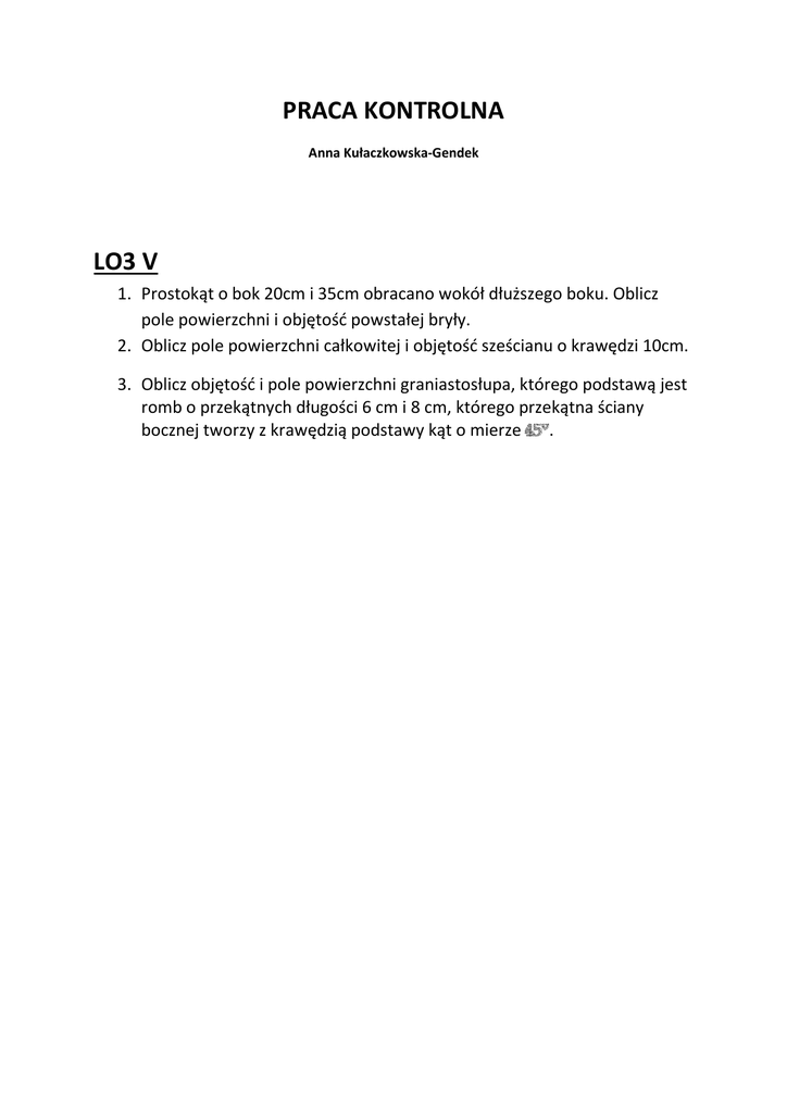 PRACA KONTROLNA Anna Kułaczkowska-Gendek LO3 V 1. Prostokąt o bok 20cm i 35cm obracano wokół dłuższego boku. Oblicz pole powierzchni i objętość powstałej bryły. 2. Oblicz pole powierzchni całkowitej i objętość sześcianu o krawędzi 10cm. 3. Oblicz objętość i pole powierzchni graniastosłupa, którego podstawą jest romb o przekątnych długości 6 cm i 8 cm, którego przekątna ściany bocznej tworzy z krawędzią podstawy kąt o mierze .