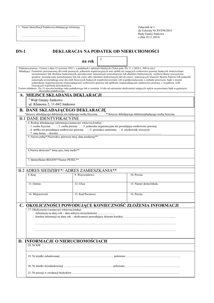 DN-1 DEKLARACJA NA PODATEK OD NIERUCHOMOŚCI na rok A