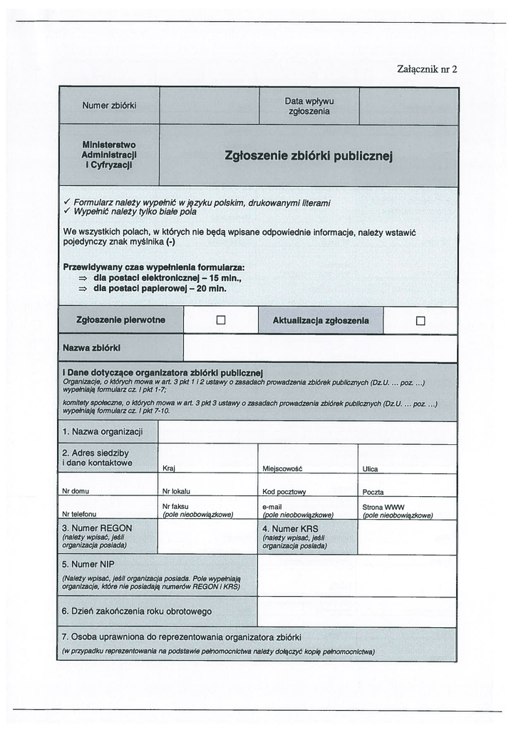 Załącznik nr 2 Data wpływu Numer zbiórki zgłoszenia Ministerstwo Administracji Zgłoszenie zbiórki publicznej i Cyfryzacji V Formularz należy wypełnić W języku polskim, drukowanymi literami V Wypełnić należy tylko białe pola We wszystkich polach, w których nie będą wpisane odpowiednie informacje, należy wstawić pojedynczy znak myślnika (-) Przewidywany czas wypełnienia formularza: dla postaci elektronicznej 15 min., = dla postaci papierowej —20 mln. — Zgłoszenie pierwotne EJ Aktualizacja zgłoszenia Nazwa zbiórki I Dane dotyczące organizatora zbiórki publicznej Organizacje, o któ,ych mowa wart. 3 pkt 112 ustawy o zasadach prowadzenia zbiórek publicznych (Dz. U. yyypelniają formularz cz. lpkt 1-7; ... poz. ...) komitety społeczne, o któtych mowa w art. 3pkt 3 ustawy o zasadach prowadzenia zbiórek publicznych (Dz. U. wypełniają formularz oz. lpkt 7-10. 1. ... poz. ...) Nazwa organizacji 2. Adres siedziby i dane kontaktowe . . Kraj Miejscowosc Ulica Nr domu Nr lokalu Kod pocztowy Poczta Nr telefonu Nr faksu (pole nieobowiązkowe) e-mail (pole nieobowiązkowe) Strona WWW (pole nieobowiązkowe) 3. Numer REGON 4. Numer KRS (należy wpisać, jeśli organizacja posiada) (należy wpisać, jeśli organizacja posiada) 5. Numer NIP (Należy wpisać, jeśli organizacja posiada. Pole wypełniają organizacje, które nie posiadają numerów REGON i KRS) 6. Dzień 7. zakończenia roku obrotowego Osoba uprawniona do reprezentowania organizatora zbiórki (w przypadku reprezentowania na podstawie pełnomocnictwa należy dołączyć kopię pełnomocnictwa) Imię i nazwisko PESEL (w przypadku braku seria i nr dokumentu potwierdzającego tożsamość) Kraj Miejscowość Ulica Nr lokalu Nr domu Kod pocztowy Poczta Nr telefonu Nr faksu (pole nieobowiązkowe) e-mail (pole nieobowiązkowe) Kraj Miejscowość Ulica Nr domu Nr lokalu Kod pocztowy Poczta Nr telefonu Nr faksu (pole nieobowiązkowe) e-mail (pole nieobowiązkowe) WWW (pole nieobowiązkowe) Imię i nazwisko PESEL (w przypadku braku seria i nr dokumentu potwierdzającego tożsamość) Kraj Miejscowość Ulica Nr domu Nr lokalu Kod pocztowy Poczta Dodatkowe informacje ułatwiające kontakt (telefon, e-mail) (pole nieobowiązkowe) 8. Nazwa komitetu społecznego 9. Siedziba komitetu i dane kontaktowe 10. Członkowie komitetu społecznego 10.1. Przewodniczący komitetu społecznego (Dane osobowe i adres zamieszkania) 10 2 Pozostali członkowie komitetu społecznego (Dane osobowe i adres zamieszkania) Imię i nazwisko PESEL (w przypadku braku seria i nr dokumentu potwierdzającego tożsamość) Kraj Miejscowość Ulica Nr domu Nr lokalu Kod pocztowy Poczta Dodatkowe informacje ułatwiające kontakt (telefon, e-mail) (pole nieobowiązkowe) Imię i nazwisko PESEL (w przypadku braku seria i nr dokumentu potwierdzającego tożsamość) Kraj Miejscowość Ulica Nr domu Nr lokalu Kod pocztowy Poczta Dodatkowe informacje ułatwiające kontakt (telefon, e-mail) pole nieobowiązkowe Imię i nazwisko PESEL (w przypadku braku seria i nr dokumentu potwierdzającego tożsamość) Kraj Miejscowość Ulica Nr domu Nr lokalu Kod pocztowy Poczta Dodatkowe informacje ułatwiające kontakt (telefon, e-mail) (pole nieobowiązkowe) II Dane dotyczące zbiórki publicznej 1. Sposób przeprowadzenia zbiórki publicznej: np. zbiórka do puszek, skarbon itp. 2. Miejsce przeprowadzenia zbiórki publicznej 3. Termin przeprowadzenia . .. . . zbiorki publicznej (ogoinopolska/woiewodztwo/powiat/gm na) DD/MM/RRRR DD/MM/RRRR Data rozpoczęcia Data zakonczenia W przypadku zbiórki permanentnej należy wstawić pojedynczy znak myślnika (-) 4. Liczba osób zaangażowanych w zbiórkę, w tym wolontariuszy 5. Cel zlórki cel pierwotny LI cel zmieniony El pomocy społecznej, w tym pomocy rodzinom i osobom w trudnej sytuacji życiowej oraz wyrównywania szans tych rodzin i osób wspierania rodziny i systemu pieczy zastępczej fl działalności na rzecz integracji i reintegracji zawodowej i społecznej osób zagrożonych wykluczeniem społecznym 5.1 Cel pozostaje w sferze zadań publicznych w zakresie: El działalności charytatywnej LI podtrzymywania i upowszechniania tradycji narodowej, pielęgnowania polskości oraz rozwoju świadomości narodowej, obywatelskiej i kulturowej LI działalności na rzecz mniejszości narodowych regionalnego El ochrony promocji zdrowia i etnicznych oraz języka i:i działalności na rzecz osób niepełnosprawnych El promocji zatrudnienia aktywizacji zawodowej osób pozostających bez pracy i zagrożonych zwolnieniem z pracy El działalności na rzecz równych praw kobiet i mężczyzn El działalnosci na rzecz osob w wieku emerytalnym El działalności wspomagającej rozwój gospodarczy, w tym rozwój przedsiębiorczosci El działalności wspomagającej rozwój techniki, wynatazczości i innowacyjności oraz rozpowszechnianie i wdrażanie nowych rozwiązań technicznych w praktyce gospodarczej El działalności wspomagającej rozwój wspólnot i społeczności lokalnych El nauki, szkolnictwa wyższego, edukacji, oświaty i wychowania El wypoczynku dzieci i młodziezy El kultury, sztuki, ochrony dóbr kultury i dziedzictwa narodowego El wspierania i El ekologii upowszechniania kultury fizycznej i ochrony zwierząt oraz ochrony dziedzictwa przyrodniczego El turystyki i krajoznawstwa El porządku i bezpieczeństwa publicznego El ratownictwa i ochrony ludności El obronności państwa i działalności Sił Zbrojnych Rzeczypospolitej Polskiej El upowszechniania i ochrony wolności i praw człowieka oraz swobód obywatelskich a takze działan wspomagających rozwoj demokracji El pomocy ofiarom katastrof, klęsk żywiołowych, konfliktów zbrojnych i wojen w kraju i za granicą El upowszechniania i ochrony praw konsumentów El działalności na rzecz integracji europejskiej oraz rozwijania kontaktów i współpracy między społeczeństwami El promocji i organizacji wolontariatu El pomocy Polonu i Polakom za granicą El działalności na