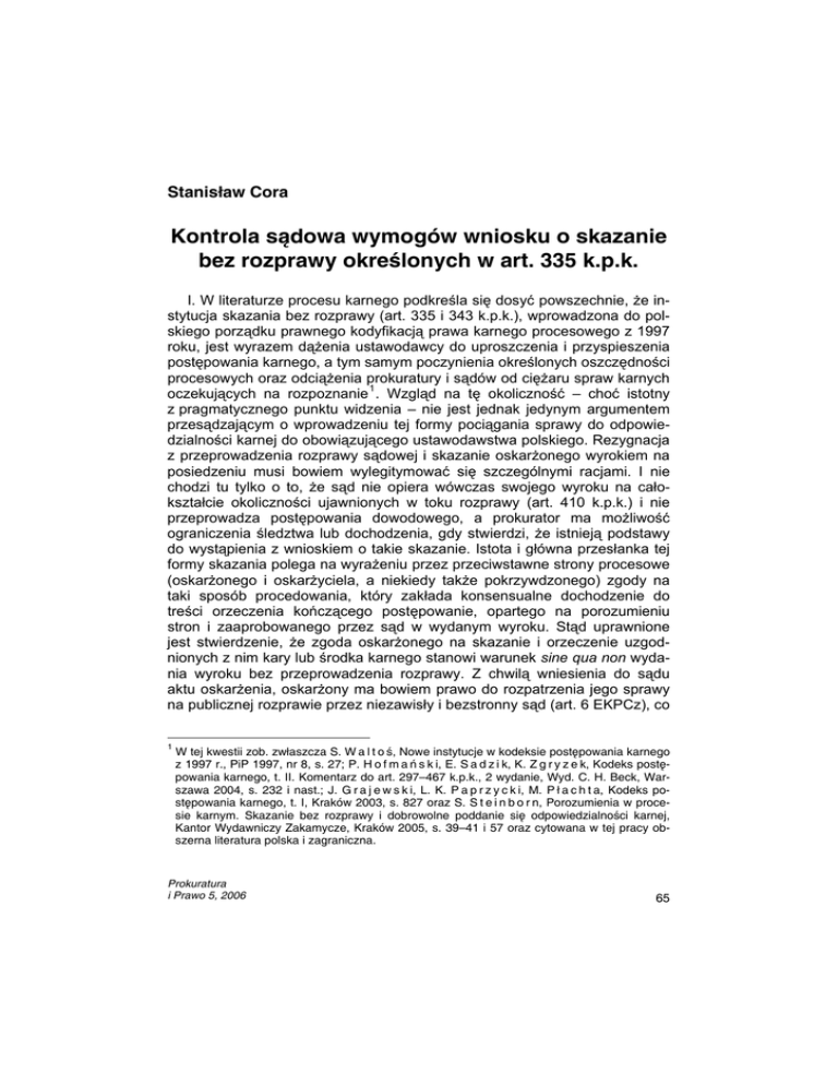 Kontrola sądowa wymogów wniosku... Stanisław Cora Kontrola sądowa wymogów wniosku o skazanie bez rozprawy określonych w art. 335 k.p.k. I. W literaturze procesu karnego podkreśla się dosyć powszechnie, że instytucja skazania bez rozprawy (art. 335 i 343 k.p.k.), wprowadzona do polskiego porządku prawnego kodyfikacją prawa karnego procesowego z 1997 roku, jest wyrazem dążenia ustawodawcy do uproszczenia i przyspieszenia postępowania karnego, a tym samym poczynienia określonych oszczędności procesowych oraz odciążenia prokuratury i sądów od ciężaru spraw karnych oczekujących na rozpoznanie 1 . Wzgląd na tę okoliczność – choć istotny z pragmatycznego punktu widzenia – nie jest jednak jedynym argumentem przesądzającym o wprowadzeniu tej formy pociągania sprawy do odpowiedzialności karnej do obowiązującego ustawodawstwa polskiego. Rezygnacja z przeprowadzenia rozprawy sądowej i skazanie oskarżonego wyrokiem na posiedzeniu musi bowiem wylegitymować się szczególnymi racjami. I nie chodzi tu tylko o to, że sąd nie opiera wówczas swojego wyroku na całokształcie okoliczności ujawnionych w toku rozprawy (art. 410 k.p.k.) i nie przeprowadza postępowania dowodowego, a prokurator ma możliwość ograniczenia śledztwa lub dochodzenia, gdy stwierdzi, że istnieją podstawy do wystąpienia z wnioskiem o takie skazanie. Istota i główna przesłanka tej formy skazania polega na wyrażeniu przez przeciwstawne strony procesowe (oskarżonego i oskarżyciela, a niekiedy także pokrzywdzonego) zgody na taki sposób procedowania, który zakłada konsensualne dochodzenie do treści orzeczenia kończącego postępowanie, opartego na porozumieniu stron i zaaprobowanego przez sąd w wydanym wyroku. Stąd uprawnione jest stwierdzenie, że zgoda oskarżonego na skazanie i orzeczenie uzgodnionych z nim kary lub środka karnego stanowi warunek sine qua non wydania wyroku bez przeprowadzenia rozprawy. Z chwilą wniesienia do sądu aktu oskarżenia, oskarżony ma bowiem prawo do rozpatrzenia jego sprawy na publicznej rozprawie przez niezawisły i bezstronny sąd (art. 6 EKPCz), co 1 W tej kwestii zob. zwłaszcza S. W a l t o ś, Nowe instytucje w kodeksie postępowania karnego z 1997 r., PiP 1997, nr 8, s. 27; P. H o f m a ń s k i, E. S a d z i k, K. Z g r y z e k, Kodeks postępowania karnego, t. II. Komentarz do art. 297–467 k.p.k., 2 wydanie, Wyd. C. H. Beck, Warszawa 2004, s. 232 i nast.; J. G r a j e w s k i, L. K. P a p r z y c k i, M. P ł a c h t a, Kodeks postępowania karnego, t. I, Kraków 2003, s. 827 oraz S. S t e i n b o r n, Porozumienia w procesie karnym. Skazanie bez rozprawy i dobrowolne poddanie się odpowiedzialności karnej, Kantor Wydawniczy Zakamycze, Kraków 2005, s. 39–41 i 57 oraz cytowana w tej pracy obszerna literatura polska i zagraniczna. Prokuratura i Prawo 5, 2006 65 S. Cora oznacza nie tylko prawo do publicznej rehabilitacji w wypadku braku podstaw do skazania 2 , ale również prawo do wyroku skazującego po rzetelnie przeprowadzonym procesie sądowym, z zachowaniem gwarancji procesowych, w tym zwłaszcza prawa do obrony i udziału w postępowaniu dowodowym w toku rozprawy (art. 6 ust. 3 EKPCz). Ustawodawca polski – w ślad za niektórymi systemami procesowymi państw zachodnioeuropejskich i USA – słusznie dopuszcza jednak możliwość rezygnacji przez oskarżonego z przysługujących mu praw w toku rozprawy w zamian za realny wpływ na ostateczne rozstrzygnięcie sprawy przez przedstawienie sądowi uzgodnionych z oskarżycielem propozycji co do treści skazania 3 . Rzecz tylko w tym, że wola oskarżonego w tej kwestii musi być wyrażona osobiście w sposób dobrowolny i całkowicie swobodny, a oświadczenie woli nie może być dotknięte wadami budzącymi wątpliwości co do zamiaru zawarcia porozumienia o treści przedstawionej we wniosku. II. Elementem kluczowym dla analizy normatywnych uwarunkowań funkcjonowania instytucji skazania bez rozprawy jest unormowanie art. 335 k.p.k., a zwłaszcza § 1 tego przepisu. Stanowi on, że prokurator może umieścić w akcie oskarżenia wniosek o wydanie wyroku skazującego i orzeczenie uzgodnionych z oskarżonym kary lub środka karnego za występek zagrożony karą nie przekraczającą 10 lat pozbawienia wolności bez przeprowadzenia rozprawy, jeżeli okoliczności popełnienia przestępstwa nie budzą wątpliwości, a postawa oskarżonego wskazuje, że cele postępowania zostaną osiągnięte. Na tle takiego brzmienia art. 335 § 1 k.p.k. łatwo zauważyć że przepis ten reguluje kwestię wniosku prokuratora o skazanie oskarżonego bez przeprowadzenia rozprawy, formułując wymagania, jakim musi on odpowiadać, aby mógł być uwzględniony przez sąd. Z punktu widzenia kontroli sądowej wymagań wniosku o skazanie powyższe brzmienie art. 335 k.p.k., jak również kontekst normatywny tego przepisu, a zwłaszcza art. 397 i 339 § 3 pkt 1 k.p.k., nasuwają szereg pytań i wątpliwości, które będą przedmiotem niniejszego opracowania. III. Najpierw kilka kwestii związanych z określeniem charakteru prawnego (istoty) wniosku, o którym mowa w § 1 art. 335 k.p.k. Na tle tego przepisu zauważyć od razu należy, że wniosek ten nie stanowi już odrębnego pisma procesowego, dołączonego przez prokuratora do aktu oskarżenia kierowanego do sądu (jak było to w stanie prawnym przed wejściem w życie noweli z dnia 10 stycznia 2003 r.), lecz jest integralną częścią aktu oskarżenia. Przekonuje o tym nie tylko sformułowanie „prokurator może zamieść w akcie oskarżenia wniosek o wydanie wyroku skarżącego” zawarte w § 1 tego przepisu, ale również art. 397 § 1 k.p.k., który wymagania, określone w art. 2 Por. S. C o r a, Instytucja zwrotu sprawy do uzupełnienia postępowania przygotowawczego a art. 397 k.p.k., PiP 2005, nr 10. 3 Por. S. S t e i n b o r n, op. cit., s. 55. 66 Prokuratura i Prawo 5, 2006 Kontrola sądowa wymogów wniosku... 335 k.p.k. traktuje jako 