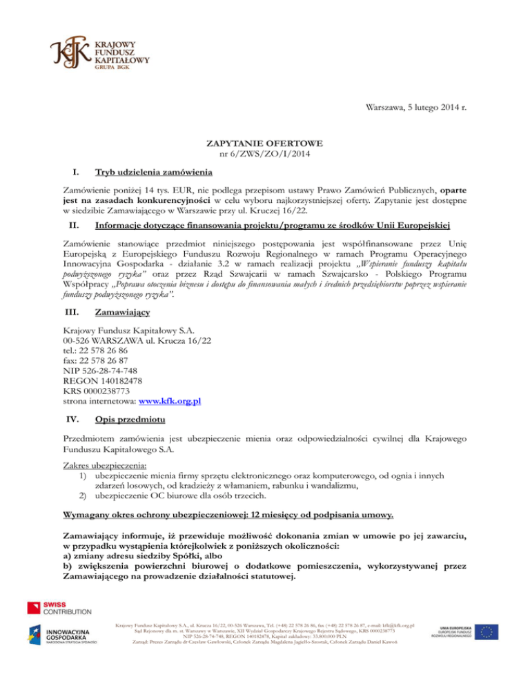 Warszawa, 5 lutego 2014 r. ZAPYTANIE OFERTOWE nr 6/ZWS/ZO/I/2014 I. Tryb udzielenia zamówienia Zamówienie poniżej 14 tys. EUR, nie podlega przepisom ustawy Prawo Zamówień Publicznych, oparte jest na zasadach konkurencyjności w celu wyboru najkorzystniejszej oferty. Zapytanie jest dostępne w siedzibie Zamawiającego w Warszawie przy ul. Kruczej 16/22. II. Informacje dotyczące finansowania projektu/programu ze środków Unii Europejskiej Zamówienie stanowiące przedmiot niniejszego postępowania jest współfinansowane przez Unię Europejską z Europejskiego Funduszu Rozwoju Regionalnego w ramach Programu Operacyjnego Innowacyjna Gospodarka - działanie 3.2 w ramach realizacji projektu „Wspieranie funduszy kapitału podwyższonego ryzyka” oraz przez Rząd Szwajcarii w ramach Szwajcarsko - Polskiego Programu Współpracy „Poprawa otoczenia biznesu i dostępu do finansowania małych i średnich przedsiębiorstw poprzez wspieranie funduszy podwyższonego ryzyka”. III. Zamawiający Krajowy Fundusz Kapitałowy S.A. 00-526 WARSZAWA ul. Krucza 16/22 tel.: 22 578 26 86 fax: 22 578 26 87 NIP 526-28-74-748 REGON 140182478 KRS 0000238773 strona internetowa: www.kfk.org.pl IV. Opis przedmiotu Przedmiotem zamówienia jest ubezpieczenie mienia oraz odpowiedzialności cywilnej dla Krajowego Funduszu Kapitałowego S.A. Zakres ubezpieczenia: 1) ubezpieczenie mienia firmy sprzętu elektronicznego oraz komputerowego, od ognia i innych zdarzeń losowych, od kradzieży z włamaniem, rabunku i wandalizmu, 2) ubezpieczenie OC biurowe dla osób trzecich. Wymagany okres ochrony ubezpieczeniowej: 12 miesięcy od podpisania umowy. Zamawiający informuje, iż przewiduje możliwość dokonania zmian w umowie po jej zawarciu, w przypadku wystąpienia którejkolwiek z poniższych okoliczności: a) zmiany adresu siedziby Spółki, albo b) zwiększenia powierzchni biurowej o dodatkowe pomieszczenia, wykorzystywanej przez Zamawiającego na prowadzenie działalności statutowej. Krajowy Fundusz Kapitałowy S.A., ul. Krucza 16/22, 00-526 Warszawa, Tel. (+48) 22 578 26 86, fax (+48) 22 578 26 87, e-mail: [email protected] Sąd Rejonowy dla m. st. Warszawy w Warszawie, XII Wydział Gospodarczy Krajowego Rejestru Sądowego, KRS 0000238773 NIP 526-28-74-748, REGON 140182478, Kapitał zakładowy: 33.800.000 PLN Zarząd: Prezes Zarządu dr Czesław Gawłowski, Członek Zarządu Magdalena Jagiełło-Szostak, Członek Zarządu Daniel Kawoń Zmiana umowy zostanie dokonana w drodze aneksu do umowy, po uprzednim uzgodnieniu warunków przez Zamawiającego i Wykonawcę. Oferta Wykonawcy złożona w odpowiedzi na zapytanie ofertowe powinna uwzględniać możliwość zmiany warunków umowy w trakcie jej obowiązywania. V. 1. Specyfikacja Ubezpieczenie sprzętu elektronicznego, komputerowego, wyposażenia Zakres ubezpieczenia ( w tym oprogramowanie oraz dane) obejmuje wszystkie szkody powstałe w wyniku nagłego, nieprzewidzianego i niezależnego od woli ubezpieczającego zniszczenia, uszkodzenia lub straty przedmiotu ubezpieczenia objętego ochroną z rozszerzeniem o szkody spowodowane kradzieżą w stosunku do sprzętu przenośnego. Zakres ubezpieczenia sprzętu przenośnego musi obejmować również odpowiedzialność za sprzęt pozostawiony w pojeździe w niewidocznym miejscu z zewnątrz, np. w bagażniku samochodu, nie znajdującego się na parkingu strzeżonym). Miejsce ubezpieczenia: dla sprzętu stacjonarnego– 00-526 Warszawa, ul. Krucza 16/22, dla sprzętu przenośnego – cała Polska z rozszerzeniem na Europę. Informacje dodatkowe: Zamawiający wynajmuje pomieszczenia biurowe na piętrze 6 i 7. Sprzęt komputerowy przechowywany jest w zamkniętych pomieszczeniach. Budynek w którym znajdują się pomieszczenia Krajowego Funduszu Kapitałowego S.A. są całodobowo dozorowane. Konserwacja sprzętu komputerowego stanowiącego własność Zamawiającego dokonywana jest przez informatyka zatrudnionego na podstawie umowy o pracę. Źródłem zasilania sprzętu komputerowego są zasilacze awaryjne UPS. Szkodliwość w ostatnich latach nie wystąpiła. Ubezpieczenie mienia firmy od ognia i innych zdarzeń losowych, od kradzieży z włamaniem i rabunku, wandalizmu. Ubezpieczenie pozostałego wyposażenia (meble, podstawowe wyposażenie techniczne biur). Zakres ubezpieczenia: odpowiedzialność za szkody powstałe przez ogień, uderzenie pioruna, eksplozję, pożar, upadek statku powietrznego, huragan, deszcz nawalny, zalanie, grad, dym, huk ponaddźwiękowy, lawina, powódź, śnieg, uderzenia drzew, konarów oraz innych przedmiotów, uderzenie pojazdu lądowego, trzęsienie ziemi. Szkody wodno-kanalizacyjne powstałe w skutek bezpośredniego działania wody lub innych cieczy jeżeli przyczyną szkód było wydostanie się ich z przewodów i urządzeń wodociągowych, kanalizacyjnych, centralnego ogrzewania znajdujących się w budynku jak też na terenie posesji objętej ubezpieczeniem. Szkody powstałe poprzez cofnięcie się wody, ścieków z urządzeń kanalizacyjnych, nieumyślne pozostawienie otwartych kranów i zaworów, szkody powstałe podczas awarii urządzeń i instalacji wod-kan i c.o. Szkody powstałe na skutek przepięcia prądu elektrycznego, w tym też powstałe w czasie wyładowań atmosferycznych. Klauzula automatycznego pokrycia do 10 % sumy ubezpieczenia nowych środków trwałych. W wycenie Wykonawca musi uwzględnić koszty dodatkowe: - klauzula automatycznego pokrycia nowych nabytych rzeczy, . - system ubezpieczenia na pierwsze ryzyko, - klauzula ubezpieczenia przedmiotów osobistych pracowników, - klauzula automatycznego pokrycia do 10 % sumy ubezpieczenia nowych środków trwałych, 2/5 Krajowy Fundusz Kapitałowy S.A., ul. Krucza 16/22, 00-526 Warszawa, Tel. (+48) 22 578 26 86, fax (+48) 22 578 26 87, e-mail: [email protected] Sąd Rejonowy dla m. st. Warszawy w Warszawie, XII Wydział Gospodarczy Krajowego Rejestru Sądowego, KRS 0000238773 NIP 526-28-74-748, REGON 140182478, Kapitał zakła