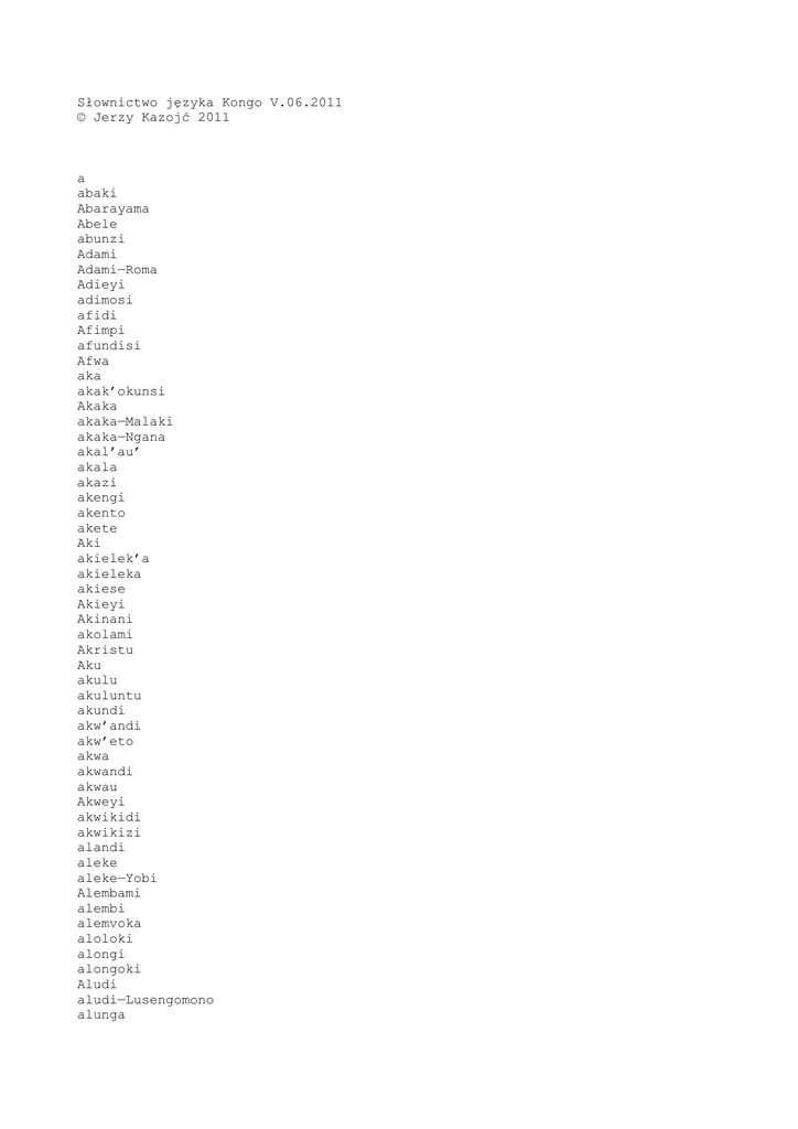 Słownictwo języka Kongo V.06.2011 © Jerzy Kazojć 2011 a abaki Abarayama Abele abunzi Adami Adami—Roma Adieyi adimosi afidi Afimpi afundisi Afwa aka akak’okunsi Akaka akaka—Malaki akaka—Ngana akal’au’ akala akazi akengi akento akete Aki akielek’a akieleka akiese Akieyi Akinani akolami Akristu Aku akulu akuluntu akundi akw’andi akw’eto akwa akwandi akwau Akweyi akwikidi akwikizi alandi aleke aleke—Yobi Alembami alembi alemvoka aloloki alongi alongoki Aludi aludi—Lusengomono alunga aluvunu Alweyi amafwa amakento Amase ambaninu ambasi Ambasi—Adieyi ambatakani Ambevo ambi ambi’ ambote ambuta ame ame’ amen Amerika Ameyi amieyi amimpanga-mayi amimponda-wantu aminta-zumba amosi amoyo ampa Ampangi ampasi AMPEMBA ampemba—akweyi ampemba—Etuku ampungu ampwena ana anani andi andia andi—Etuku andumba anene Aneyisaele angangu angunza Aniversários ankento ankolami ankulu ankulu’ ankunzu ankwinti ansona ansongi antente antete Antumwa anunu anwani anzodi anzolwa anzolwa—Ngana Aparasi Apollo Aprenda Armangedo Armangedo’ as asakalala Asambidi Aselo ASIA Asiaweek asompa Asoneki Asongi asumuki atantu atatu ateleki atinu atunda au au—Efeso au—Tito avangi avati avelela Avo avungudi awana awaya Aweyi Awonso awonso’ aya ayadi ayadi’ ayeyi Ayib Ayibere ayingi ayingi’ Ayitu Ayuda aziku azikuka azodi azola Azolw’aku azolw’au Azolw’eto azolwa b ba babadikilanga babadikilwanga babak’o babaka babakilwa babakula babangamanga babangikwa babanzanga Babele Babele—Yesaya Babembola babimbana babu babubika babwididi babwisa badi badianga badidi Badika badikanga badiki badikil’o badikila badikilang’e badikilang’o badikilanga badilanga bafidisa bafimpa Bafimpanga bafulwa bafwa bafwan’o bafwana bafwanga bafwete bafwila Bagdá BAK’E baka bakadila bakal’akwa bakal’avauki bakala bakalanga bakangama bakangwa bakatula bakazala bakazalanga bakemba BAKEMBELANGA bakembelelanga bakingulwa bakituka bakitukidi bakitukila bakiyala bakiyekwele bakolama bakolamena bakondelo bakondwa bakotela baku Bakubamena bakula bakulanga bakulula bakulwa bakunina bakutakana bakutikidi Bakwamanana bakwikila bakwikilanga balanda balandanga balele balembele balembi balemvokela balemvokelanga balenda balendele balendi balomba balongang’o balonganga balongoka balongokanga balundidi balunga bamana bamene bamengang’o bamenganga bamona bamonanene bamonanga bamvovesa bamvukumuna bamwenanga bamwene bamwesanga bangika bangikila bangikwa bankolamena bankolamene bankwikilanga banlwakilanga bansadila bansambila banuna banungunukini banwananga banyikama banyikamene banyuvula banza basadila basadilanga basadisa basakalela basakalelang’akazi basakalele basalanga basambanga basambila basambilanga basamun’e basauka basemwa basianga basikila basimanga Basisa basola basolele basolwa basompanga basoneka basonga basongang’o basonganga basumbuka basumuka basumukanga basunda basundidi batantananga batekele bateza batoma batomene batuba batubwa batuka batulokele Batumbwa batusadisa batuvang’e batuvangidi batuwidi bavaikiswa bavambana bavananga bavang’owu bavanga bavanganga bavangi bavangidi bavangidinge bavangwa Bavauka bavavang’o bavelela bavene bavenga bavewa Baveza Bavezwanga bavila bavitila bavondwa bavova bavovela bavoveswa bavuidi bavuluka bavumunwinwa bavutuka bavutukila bavwa bavwamina bavwang’o bavwata bavwidi bawa bawanga bawut’o bawutana baya bayambula bayambulanga bayambulwa bayanga bayangalala bayangalalanga bayantika bayendanga bayengoloka bayibadikilanga bayibongele Bayikama bayikilwanga bayindulanga bayingwa bayisia bayisolela bayisonga bayisonganga bayiyala bayiyikila bayoka bayokèle bayoya bayuvula bayuvulanga bazadiswa bazala bazaya bazayakene bazayanga bazayisa bazeye bazikwa bazinga bazinganga bazingila bazingilanga bazitisa bazitisanga bazol’akazi bazola bazolananga bazolanga bazolele bebadikaziananga bebadikilanga bebadikilwanga bebakanga bebakula bebalukila bebanzanga bebanzilanga BEBUNDANGA bebwilwanga bediatisanga bedimunwa befiaulwisanga befidilang’o befilakesa befilanga befula befuluka befulukanga befuluka—Yoane befulukila befulwa befundisilwa befundiswa befwa befwang’o befwanga befwasakana befwasanga befwaswa BEFWILANGA befwilwanga bekal’akwa Bekala bekalanga bekangwa bekasakeswanga bekatikisanga bekembelanga bekendalalanga bekendalalanga’ bekituka bekitukanga beko bekotanga bekotela bekubabangikanga bekubakwikilanga bekubamwesanga bekubavananga bekubikanga bekukitulanga bekumbokela bekumbokelanga bekumbokelela bekumvavanga bekumvumina bekunsadilanga bekunsambilanga bekunsianga bekupitakesanga bekusianga bekutumonanga bekutusadisanga bekuyifwanisanga bekuyisianga bekuyiswaswanisanga—Efeso bekuyivananga bekuyivuninanga bekuzayisa bekuzola bekwamanananga bekwenda bekwendanga bekwendanga’ bekwikila bekwikilanga belandang’o belandanga bele belemvokelanga belendanga belokang’e belombanga belonganga belonganga—Tito belongokanga belongwa Belongwanga belundanga belungananga belunganenanga belunganiswa belungisanga belungisilanga belungiswa beluta bembola bemenganga bemokenanga bemona bemonang’o bemonanga bemonekanga bemwanganesa Bemwenanga ben’o ben’ova Bena bengi benuanga benuninanga benwananga besadilang’e besadilanga besadisanga Besadiswanga besakumuka besala Besalaziananga besambanga besambilanga besambilwanga besamunanga besaul’o besaulwa besengomoken’o besiang’e besianga besikila besikilanga besimbanga besinga besolang’o besolanga besolola besompananga besonganga besongelanga besumbilanga besunzulanga beswekanga betambula betambulanga betanga betangininanga Betania betaninanga betela Beteleme betezanga Betokananga betoma betondanga betondwa betondwanga Betukanga betumbanga betumbikwanga betumbilanga bevaika bevaika’ bevananga bevangang’e bevangang’o Bevanganga bevavanga bevenganga bevewanga beveza bevezanga bevezelanga bevilakanwa bevingilanga bevitang’o bevondananga bevondanga bevovanga bevovelanga bevovelelang