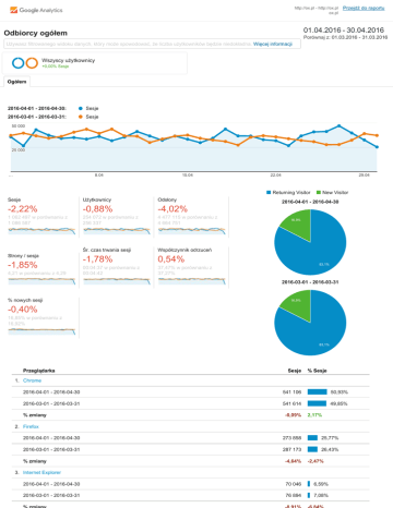 http://ox.pl http://ox.pl ox.pl Przejdź do raportu 01.04.2016 30.04.2016 Odbiorcy ogółem Porównaj z: 01.03.2016 31.03.2016 Używasz filtrowanego widoku danych, który może spowodować, że liczba użytkowników będzie niedokładna. Więcej informacji Wszyscy użytkownicy +0,00% Sesje Ogółem 20160401 20160430: Sesje 20160301 20160331: Sesje 50 000 25 000 … 8.04 15.04 22.04 29.04 Returning Visitor Sesje Użytkownicy Odsłony 2,22% 0,88% 4,02% 1 062 497 w porównaniu z 1 086 587 254 072 w porównaniu z 256 337 4 477 115 w porównaniu z 4 664 751 Śr. czas trwania sesji Współczynnik odrzuceń 1,78% 0,54% 00:04:37 w porównaniu z 00:04:42 37,47% w porównaniu z 37,27% Strony / sesja 1,85% 4,21 w porównaniu z 4,29 New Visitor 20160401 20160430 16,9% 83,1% 20160301 20160331 % nowych sesji 16,9% 0,40% 16,85% w porównaniu z 16,92% 83,1% Przeglądarka Sesje % Sesje 1. Chrome 20160401 20160430 541 106 50,93% 20160301 20160331 541 614 49,85% % zmiany 0,09% 2,17% 2. Firefox 20160401 20160430 273 858 25,77% 20160301 20160331 287 173 26,43% % zmiany 4,64% 2,47% 3. Internet Explorer 20160401 20160430 70 046 6,59% 20160301 20160331 76 894 7,08% % zmiany 8,91% 6,84% 4. Opera 20160401 20160430 58 546 5,51% 20160301 20160331 62 004 5,71% % zmiany 5,58% 3,44% 5. Safari 20160401 20160430 54 616 5,14% 20160301 20160331 54 497 5,02% % zmiany 0,22% 2,49% 6. Android Browser 20160401 20160430 40 104 3,77% 20160301 20160331 42 756 3,93% % zmiany 6,20% 4,08% 7. Edge 20160401 20160430 13 409 1,26% 20160301 20160331 10 974 1,01% % zmiany 22,19% 24,96% 8. Opera Mini 20160401 20160430 4 078 0,38% 20160301 20160331 4 277 0,39% % zmiany 4,65% 2,49% 9. Safari (inapp) 20160401 20160430 3 114 0,29% 20160301 20160331 3 068 0,28% % zmiany 1,50% 3,80% 10. Maxthon 20160401 20160430 1 554 0,15% 20160301 20160331 1 691 0,16% % zmiany 8,10% © 2016 Google 6,02%
