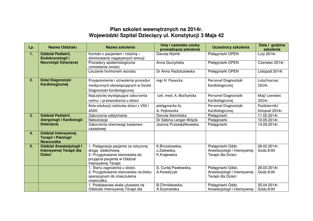 Plan szkoleń wewnętrznych na 2014r. Wojewódzki Szpital Dziecięcy