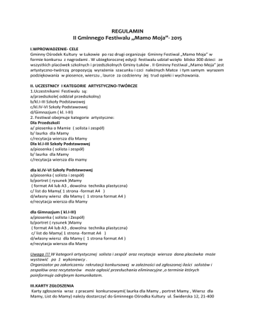 REGULAMIN II Gminnego Festiwalu „Mamo Moja”‐ 2015 I.WPROWADZENIE‐ CELE Gminny Ośrodek Kultury w Łukowie po raz drugi organizuje Gminny Festiwal „Mamo Moja” w formie konkursu z nagrodami . W ubiegłorocznej edycji festiwalu udział wzięło blisko 300 dzieci ze wszystkich placówek szkolnych i przedszkolnych Gminy Łuków . II Gminny Festiwal „Mamo Moja” jest artystyczno‐twórczą propozycją wyrażenia szacunku i czci należnych Matce i tym samym wyrazem podziękowania w piosence, wierszu , laurce za codzienny Jej trud opieki i wychowania. II. UCZESTNICY I KATEGORIE ARTYSTYCZNO‐TWÓRCZE 1.Uczestnikami Festiwalu są: a/przedszkole( oddział przedszkolny) b/kl.I‐III Szkoły Podstawowej c/kl.IV‐VI Szkoły Podstawowej d/Gimnazjum ( kl. I‐III) 2. Festiwal obejmuje kategorie artystyczne: Dla Przedszkoli a/ piosenka o Mamie ( solista i zespół) b/ laurka dla Mamy c/recytacja wiersza dla Mamy Dla kl.I‐III Szkoły Podstawowej a/piosenka ( solista i zespół) b/ laurka dla Mamy c/recytacja wiersza dla mamy dla kl.IV‐VI Szkoły Podstawowej a/piosenka ( solista i zespół) b/portret ( rysunek )Mamy ( format A4 lub A3 , dowolna technika plastyczna) c/ list do Mamy( 1 strona ‐format A4 ) d/własny wiersz dla Mamy ( 1 strona format A4 ) e/recytacja wiersza dla Mamy dla Gimnazjum ( kl.I‐III) a/piosenka ( solista i Zespół) b/portret ( rysunek )Mamy ( format A4 lub A3 , dowolna technika plastyczna) c/ list do Mamy( 1 strona ‐format A4 ) d/własny wiersz dla Mamy ( 1 strona format A4 ) e/recytacja wiersza dla Mamy Uwaga !!! W kategorii artystycznej solista i zespół oraz recytacja wiersza dana placówka może wystawić po 1 wykonawcy . Organizator po zakończeniu rekrutacji konkursowej w zależności od zgłoszonej ilości solistów i zespołów oraz recytatorów może ogłosić przesłuchania eliminacyjne ,o terminie których poinformuje odrębnym komunikatem. III.KARTY ZGŁOSZENIA Karty zgłoszenia wraz z pracami konkursowymi( laurka dla Mamy , portret Mamy , Wiersz dla Mamy, List do Mamy) należy dostarczyć do Gminnego Ośrodka Kultury ul. Świderska 12, 21‐400 Łuków ( budynek Urzędu Gminy) pok. nr 1 ( parter) lub do Sekretariatu Urzędu Gminy Łuków ‐ piętro I, w nieprzekraczalnym terminie do dnia 22 maja 2015 do godz.16.00. IV. JURY ‐ NAGRODY 1.Wykonania wokalne i recytatorskie oraz prace artystyczno‐twórcze oceniać będzie jury powołane przez Organizatora. Werdykt jury nie podlega odwołaniu. 2. W każdej kategorii wiekowej i artystyczno‐twórczej za zajęcie I miejsca zostaną przyznane nagrody rzeczowe i statuetki . Jury przyzna również wyróżnienia. Wszyscy uczestnicy Gali Finałowej Festiwalu otrzymają dyplomy i słodkie upominki . V. FINAŁ FESTIWALU 1.Finałowa Gala II Gminnego Festiwalu „Mamo Moja” odbędzie się 29 maja 2015 ( piątek) o godz. 16.00 w Świetlicy Wiejskiej w Wólce Świątkowej . W trakcie Gali ogłoszone zostaną wyniki wszystkich kategorii Festiwalu i wręczone zostaną nagrody oraz słodkie upominki. 2. Po zakończeniu Finałowej Gali II Gminnego Festiwalu „Mamo Moja” Organizator zapewnia poczęstunek . VI. POSTANOWIENIA KOŃCOWE 1.Organizator nie zwraca kosztów dojazdu . 2.Wykonawcy do lat 14 winni przybyć z opiekunami lub rodzicami. VII. ZAPROSZENIE Organizator zaprasza wszystkie Mamy dzieci uczestniczących w Festiwalu .