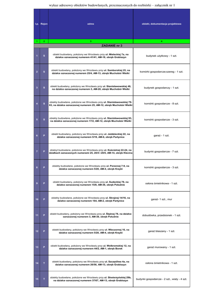 wykaz adresowy obiektów budowlanych, przeznaczonych do rozbiórki – załącznik nr 1 l.p. Rejon 1 2 adres obiekt, dokumentacja projektowa 3 4 ZADANIE nr 3 1 S obiekt budowlany, położony we Wrocławiu przy ul. Mieleckiej 7a, na działce oznaczonej numerem 41/41, AM-18, obręb Grabiszyn budynek użytkowy - 1 szt. 2 S obiekt budowlany, położony we Wrocławiu przy ul. Samborskiej 25, na działce oznaczonej numerem 25/4, AM-13, obręb Muchobór Wielki komórki gospodarcze;szereg - 1 szt. 3 S obiekt budowlany, położony we Wrocławiu przy ul. Stanisławowskiej 48, na działce oznaczonej numerem 3, AM-20, obręb Muchobór Wielki budynek gospodarczy - 1 szt. 4 S obiekty budowlane, położone we Wrocławiu przy ul. Stanisławowskiej 7983, na działce oznaczonej numerem 25, AM-12, obręb Muchobór Wielki komórki gospodarcze - 8 szt. 5 S obiekty budowlane, położone we Wrocławiu przy ul. Stanisławowskiej 93, na działce oznaczonej numerem 17/2, AM-12, obręb Muchobór Wielki komórki gospodarcze - 3 szt. 6 P obiekt budowlany, położony we Wrocławiu przy ul. Jeździeckiej 22, na działce oznaczonej numerem 5/19, AM-6, obręb Partynice garaż - 1 szt. 7 P obiekyt budowlane, położone we Wrocławiu przy ul. Kościelnej 22-24, na działkach oznaczonych numerami 25, 20/4 i 20/5, AM-14, obręb Klecina budynki gospodarcze - 7 szt. 8 P obiekty budowlane, położone we Wrocławiu przy ul. Porannej 7-9, na działce oznaczonej numerem 5/20, AM-4, obręb Krzyki komórki gospodarcze - 3 szt. 9 P obiekt budowlany, położony we Wrocławiu przy ul. Sudeckiej 78, na działce oznaczonej numerem 15/8, AM-36, obręb Południe osłona śmietnikowa - 1 szt. 10 P obiekty budowlane, położone we Wrocławiu przy ul. Skrajnej 14/16, na działce oznaczonej numerem 164, AM-2, obręb Partynice garaż- 1 szt., mur 11 P obiekt budowlany, położony we Wrocławiu przy ul. Ślężnej 78, na działce oznaczonej numerem 3, AM-38, obręb Południe dobudówka, przedsionek - 1 szt. 12 P obiekt budowlany, położony we Wrocławiu przy ul. Wieczornej 16, na działce oznaczonej numerem 5/20, AM-4, obręb Krzyki garaż blaszany - 1 szt. 13 P obiekt budowlany, położony we Wrocławiu przy ul. Wolbromskiej 12, na działce oznaczonej numerem 44/2, AM-1, obręb Borek garaż murowany - 1 szt. 14 T obiekt budowlany, położony we Wrocławiu przy ul. Szczęśliwa 4a, na działce oznaczonej numerem 26/56, AM-13, obręb Grabiszyn osłona śmietnikowa - 1 szt. 15 T obiekty budowlane, położone we Wrocławiu przy ul. Skwierzyńskiej 29b, na działce oznaczonej numerem 37/67, AM-13, obręb Grabiszyn budynki gospodarcze - 2 szt., wiaty - 4 szt.