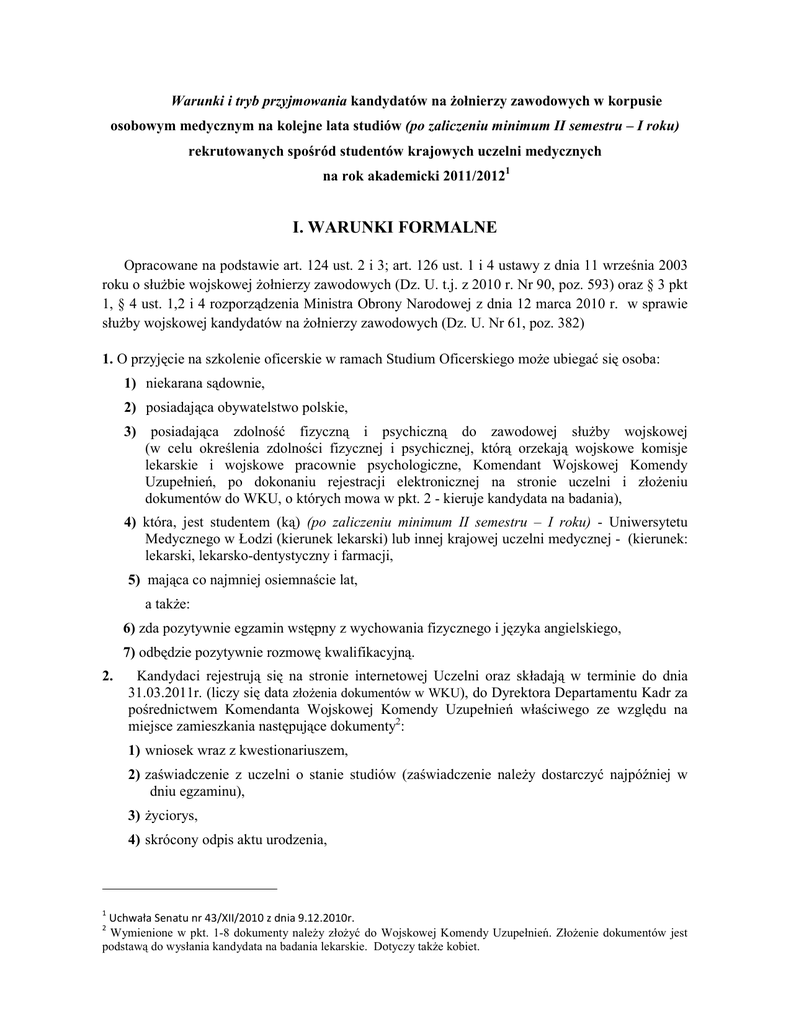 Warunki i tryb przyjmowania kandydatów na Ŝołnierzy zawodowych w korpusie osobowym medycznym na kolejne lata studiów (po zaliczeniu minimum II semestru – I roku) rekrutowanych spośród studentów krajowych uczelni medycznych na rok akademicki 2011/20121 I. WARUNKI FORMALNE Opracowane na podstawie art. 124 ust. 2 i 3; art. 126 ust. 1 i 4 ustawy z dnia 11 września 2003 roku o słuŜbie wojskowej Ŝołnierzy zawodowych (Dz. U. t.j. z 2010 r. Nr 90, poz. 593) oraz § 3 pkt 1, § 4 ust. 1,2 i 4 rozporządzenia Ministra Obrony Narodowej z dnia 12 marca 2010 r. w sprawie słuŜby wojskowej kandydatów na Ŝołnierzy zawodowych (Dz. U. Nr 61, poz. 382) 1. O przyjęcie na szkolenie oficerskie w ramach Studium Oficerskiego moŜe ubiegać się osoba: 1) niekarana sądownie, 2) posiadająca obywatelstwo polskie, 3) posiadająca zdolność fizyczną i psychiczną do zawodowej słuŜby wojskowej (w celu określenia zdolności fizycznej i psychicznej, którą orzekają wojskowe komisje lekarskie i wojskowe pracownie psychologiczne, Komendant Wojskowej Komendy Uzupełnień, po dokonaniu rejestracji elektronicznej na stronie uczelni i złoŜeniu dokumentów do WKU, o których mowa w pkt. 2 - kieruje kandydata na badania), 4) która, jest studentem (ką) (po zaliczeniu minimum II semestru – I roku) - Uniwersytetu Medycznego w Łodzi (kierunek lekarski) lub innej krajowej uczelni medycznej - (kierunek: lekarski, lekarsko-dentystyczny i farmacji, 5) mająca co najmniej osiemnaście lat, a takŜe: 6) zda pozytywnie egzamin wstępny z wychowania fizycznego i języka angielskiego, 7) odbędzie pozytywnie rozmowę kwalifikacyjną. 2. Kandydaci rejestrują się na stronie internetowej Uczelni oraz składają w terminie do dnia 31.03.2011r. (liczy się data złoŜenia dokumentów w WKU), do Dyrektora Departamentu Kadr za pośrednictwem Komendanta Wojskowej Komendy Uzupełnień właściwego ze względu na miejsce zamieszkania następujące dokumenty2: 1) wniosek wraz z kwestionariuszem, 2) zaświadczenie z uczelni o stanie studiów (zaświadczenie naleŜy dostarczyć najpóźniej w dniu egzaminu), 3) Ŝyciorys, 4) skrócony odpis aktu urodzenia, 1 Uchwała Senatu nr 43/XII/2010 z dnia 9.12.2010r. Wymienione w pkt. 1-8 dokumenty naleŜy złoŜyć do Wojskowej Komendy Uzupełnień. ZłoŜenie dokumentów jest podstawą do wysłania kandydata na badania lekarskie. Dotyczy takŜe kobiet. 2 5) potwierdzenie dokonania opłaty rekrutacyjnej (wysokość opłaty rekrutacyjnej ustala rektorkomendant, uwzględniając zapisy rozporządzenia MNiSW w sprawie maksymalnej wysokości opłat za postępowanie związane z przyjęciem na studia w roku akademickim – 50 zł). Opłata rekrutacyjna nie podlega zwrotowi. a takŜe: 6) kserokopię dowodu osobistego, 7) 1 zdjęcie legitymacyjne, 8) kopie innych dokumentów (poświadczenia) rozpatrywane w trakcie rozmowy kwalifikacyjnej, np. prawo jazdy, tytuł skoczka spadochronowego, świadectwa znajomości języków obcych, świadectwa instruktorskie, sportowe klasy mistrzowskie, ponadto: 9) w dniu stawiennictwa na egzamin - informację o osobie z Krajowego Rejestru Karnego (KRK) aktualną na dzień rozpoczęcia postępowania rekrutacyjnego – waŜna 1 miesiąc od dnia wystawienia. 3. Do przeprowadzenia postępowania rekrutacyjnego rektor - komendant powołuje Komisję Rekrutacyjną oraz Uczelnianą Komisję Rekrutacyjną. 4. Limit miejsc. L.p. 1. 2. Dotyczy studentów (tek) Uniwersytetu Medycznego w Łodzi Innych krajowych uczelni medycznych Kierunek studiów cywilnych Korpus medyczny grupy osobowe Limit miejsc lekarski lekarzy 25 lekarki lekarzy 10 * lekarskodentystyczny lekarzy dentystów 3 farmacja farmaceutów 2 Ogółem w Uczelni 40 * Podziału ilości miejsc na określone grupy osobowe dokona Szef Inspektoratu Wojskowej SłuŜby Zdrowia WP przed rozpoczęciem procesu kwalifikacyjnego, uwzględniając potrzeby Sił Zbrojnych 5. Kształcenie specjalistyczne (wojskowe i medyczno-wojskowe) prowadzone będzie na bazie Uniwersytetu Medycznego i Centrum Szkolenia Wojskowych SłuŜb Medycznych w Łodzi. II. POSTĘPOWANIE REKRUTACYJNE 1. O terminie przeprowadzenia postępowania rekrutacyjnego osoby zainteresowane zostaną powiadomione co najmniej na 14 dni przed jego rozpoczęciem. 2. Postępowanie rekrutacyjne ma charakter konkursowy i obejmuje trzy etapy: ETAP I - postępowanie wstępne polegające na skompletowaniu Teczki Akt Personalnych (TAP) kandydata. 1. Po otrzymaniu dokumentów wymienionych w pkt. 2, Dyrektor Departamentu Kadr przesyła je do rektora – komendanta WSOWL we Wrocławiu. 2. W WSOWL dokumenty podlegają weryfikacji. W przypadku braku dokumentów wymienionych w pkt. 2 z wyjątkiem zaświadczenia z KRK (które naleŜy dostarczyć w dniu stawiennictwa na egzamin) – uczelnia nie będzie ich rozpatrywała w dalszym postępowaniu rekrutacyjnym. 3. W dniu egzaminu Komisja Rekrutacyjna podczas rejestracji kandydatów dokonuje weryfikacji następujących dokumentów: - zaświadczenie z uczelni o stanie studiów; - zaświadczenie z KRK - oryginał, - potwierdzenie wniesienia opłaty rekrutacyjnej – oryginał, - otrzymane orzeczenia o zdolności do zawodowej słuŜby wojskowej. Orzeczenia lekarskie określające zdolność do zawodowej słuŜby wojskowej przesyła Komendant macierzystego WKU do rektora – komendanta najpóźniej do dnia 31 maja 2011r. Brak orzeczeń w dniu egzaminu, bądź otrzymanie przez kandydata negatywnego orzeczenia wojskowej komisji lekarskiej lub wojskowej pracowni psychologicznej skutkuje niedopuszczeniem do egzaminów wstępnych i dyskwalifikacją w dalszym procesie rekrutacyjnym. UWAGA! Brak ww. dokumentów w dniu stawiennictwa skutkuje niedopuszczeniem do egzaminów wstępnych i dyskwalifikacją w dalszym procesie rekrutacyjnym. ETAP II - egzamin wstępny Kandydaci w ramach egzaminu wstępnego zdają: a) Test z języka angielskiego Ocena znajomości języka angielskiego kandydata przeprowadzana jest przy pomocy testu wielokrotnego wyb