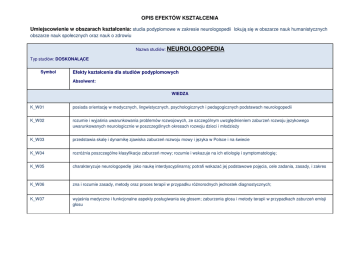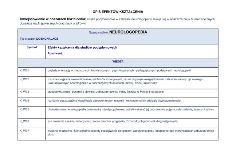 OPIS EFEKTÓW KSZTAŁCENIA Umiejscowienie w obszarach kształcenia: studia podyplomowe w zakresie neurologopedii lokują się w obszarze nauk humanistycznych obszarze nauk społecznych oraz nauk o zdrowiu Nazwa studiów: NEUROLOGOPEDIA Typ studiów: DOSKONALĄCE Symbol Efekty kształcenia dla studiów podyplomowych Absolwent: WIEDZA K_W01 posiada orientację w medycznych, lingwistycznych, psychologicznych i pedagogicznych podstawach neurologopedii K_W02 rozumie i wyjaśnia uwarunkowania problemów rozwojowych, ze szczególnym uwzględnieniem zaburzeń rozwoju językowego uwarunkowanych neurologicznie w poszczególnych okresach rozwoju dzieci i młodzieży K_W03 przedstawia skalę i dynamikę zjawiska zaburzeń rozwoju mowy i języka w Polsce i na świecie K_W04 rozróżnia poszczególne klasyfikacje zaburzeń mowy; rozumie i wskazuje na ich etiologię i symptomatologię; K_W05 charakteryzuje neurologopedię jako naukę interdyscyplinarną; potrafi wskazać jej podstawowe pojęcia, cele zadania, zasady, i zakres K_W06 zna i rozumie zasady, metody oraz proces terapii w przypadku różnorodnych jednostek diagnostycznych; K_W07 wyjaśnia medyczne i funkcjonalne aspekty posługiwania się głosem; zaburzenia głosu i metody terapii w przypadkach zaburzeń emisji głosu K_W08 zna podstawowe regulacje prawne dotyczące rehabilitacji logopedycznej w systemie oświaty, służbie zdrowia i sektorze usług prywatnych K_W09 posiada podstawową wiedzę z zakresu anatomii i fizjologii słuchu; elementów otolaryngologii i audiologii; protezowania słuchu i rodzajów oraz zastosowania protez słuchowych oraz organizacji procesu terapeutycznego dzieci niesłyszących K_W10 Ma wiedzę dotyczącą organizacji i metodyki zajęć neurologopedycznych w odniesieniu do uczniów/pacjentów z różnorodnymi zaburzeniami w szpitalu, placówce medycznej czy w placówkach edukacyjnych K_W11 Charakteryzuje proces wspomagania rozwoju językowego dziecka w warunkach wczesnego wspomagania K_W12 Rozumie wpływ wad słuchu, zaburzeń neurologicznych, problemów anatomicznych i innych na kształtowanie się procesów poznawczych, języka i osobowości dzieci i młodzieży, oraz osób dorosłych; potrafi rozpoznać skutki deprywacji sensorycznej u poszczególnych uczniów K_W013 Posiada wiedzę na temat wpływu środowiska na rozwój i funkcjonowanie językowe; wie w jaki sposób organizować środowisko terapeutyczne i społeczne sprzyjające wszechstronnemu rozwojowi dziecka K_W014 Rozumie specyfikę procesu terapeutycznego osób z zaburzeniami mowy i języka; potrafi dobrać odpowiednie metody, formy i środki dla osiągnięcia założonych celów edukacyjnych, rewalidacyjnych i wychowawczych UMIEJĘTNOŚCI K_U01 potrafi zaplanować i przeprowadzić diagnozę neurologopedyczną ucznia/pacjent aw każdym wieku i różnorodnymi zaburzeniami K_U02 ma umiejętność przeprowadzenia orientacyjnego badania słuchu oraz badania sprawności narządów artykulacyjnych K_U03 Potrafi wybrać i zastosować odpowiednia metody terapii w odniesieniu do uczniów i pacjentów z: afazją (afazją wczesnodziecięcą, alalią, dyslalią, dysglosją, dyzartrią/anartrią, jąkaniem, nerwicami mowy, oligofazją; zaburzeniami integracji sensorycznej K_U04 Wybiera adekwatne metody kształcenia językowego uczniów niesłyszących i słabo słyszących; projektuje programy kształcenia językowego z zastosowaniem wybranych metod K_U05 Potrafi sporządzić dokumenty służące organizacji pomocy psychologiczno- pedagogicznej dziecka z zaburzeniami językowymi (kartę indywidualnych potrzeb dziecka, plan działań wspierających, indywidualny program edukacyjno- terapeutyczny) K_U06 Projektuje terapię dzieci z wykorzystaniem alternatywnych metod komunikacji; ma wiedzę odnośnie AAC i rozumie uwarunkowania ich stosowania K_U07 Stosuje wczesną naukę czytana i teksty pisane jako środek kształtowania systemu językowego dzieci z zaburzeniami rozwoju językowego, zagrożonych autyzmem, z ryzyka dysleksji, niesłyszących, z alalią i innych K_U08 Potrafi organizować działania wspierające i prowadzić zajęcia z zakresu kształtowania systemu językowego z małymi dziećmi w ramach wczesnego wspomagania rozwoju; inicjuje i organizuje współprace z rodziną i instytucjami środowiska zewnętrznego mająca na celu optymalne wspomaganie rozwoju dziecka KOMPETENCJE SPOŁECZNE K_K01 ma świadomość ważności wczesnego wychowania słuchowego, kształcenia językowego, edukacji i rehabilitacji dzieci z zaburzeniami rozwoju językowego K_K02 wykazuje gotowość do doskonalenia się przez całe życie, podejmuje trud i odznacza się wytrwałością w realizacji indywidualnych i zespołowych zadań zawodowych wynikających z roli logopedy .K_K03 .jest przekonany o sensie, wartości i potrzebie podejmowania działań pedagogicznych wobec osób z zaburzeniami językowymi i ich rodzin w środowisku społecznym, jest gotowy do podejmowania wyzwań zawodowych,