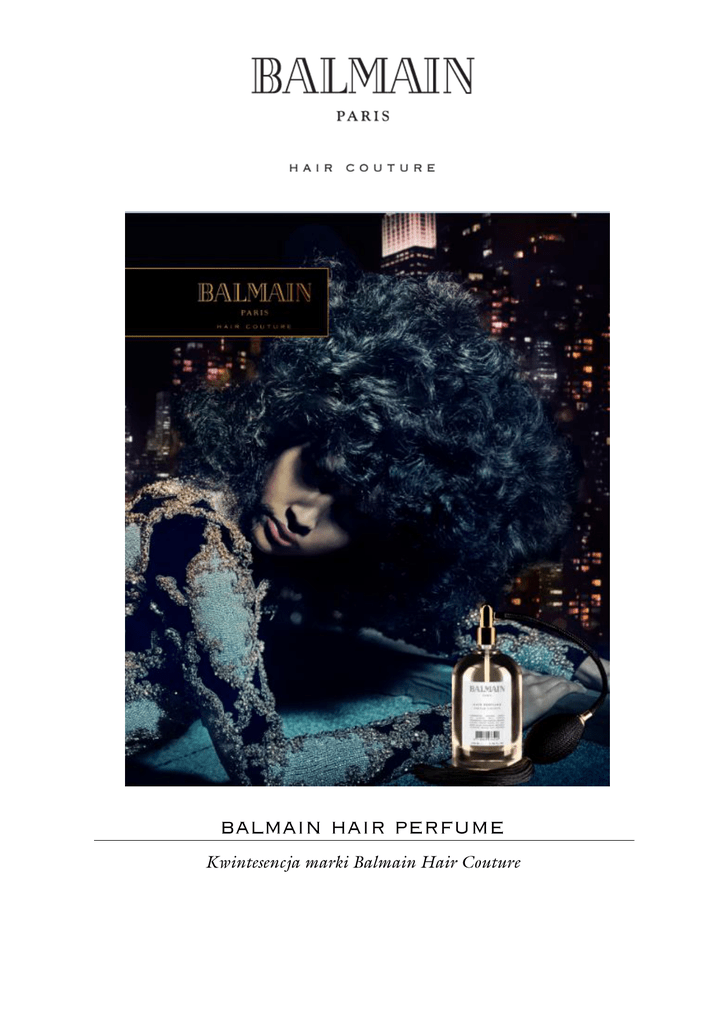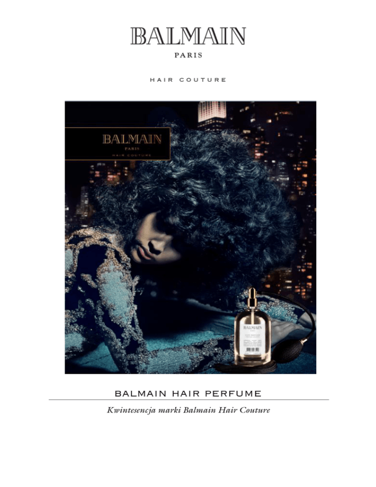BALMAIN HAIR www.balmainhair.com; sklep.balmainhairpoland.pl Balamin Hair przedstawia HAIR PERFUME - delikatną i wyrafinowaną mgiełkę do włosów, która zapewni fryzurze świeży, harmonijny zapach oraz pobudzi zmysły. Super trik! By uzyskać na włosach delikatny zapach, spryskaj perfumami szczotkę. Dzięki temu zapach perfum będzie stopniowo się uwalniał podczas ich rozczesywania.. Charakterystyczny dla kosmetyków marki Balmain zapach perfum uwalnia się przez cały dzień i zostaje jeszcze bardziej wzmocniony naturalnym ruchem włosów. Unikalna mieszanka kluczowych składników stworzona dzięki doświadczeniu grupy specjalistów Balmain, przypadnie do gustu każdemu. Główne nuty zapachowe utrzymujące się w perfumach to anyż, estragon, drzewo sosnowe, kwiat brzoskwini, maliny, gardenia, kwiat pomarańczy, goździki, jaśmin, róża, ylang-ylang, morela, wanilia, drzewo sandałowe, drzewo cedrowe, i białe piżmo. HAIR PERFUME można kupić w sklepie internetowym sklep.balmainhairpoland.pl. Zawarte w HAIR PERFUME proteiny jedwabiu i arganowy elixire odżywiają włosy i poprawiają ich kondycję, a także zapewniają długotrwale unoszący się zapach. Wydobywająca się z eleganckiej pompki nuta zapachowa tworzy na włosach niewidzialny welon. ę ż Cena: 449 zł Pojemność: 100 ml