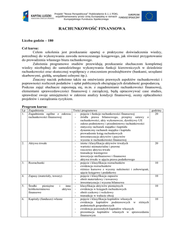RACHUNKOWOŚĆ FINANSOWA Liczba godzin – 180 Cel kursu: Celem szkolenia jest przekazanie opartej o praktyczne doświadczenia wiedzy, potrzebnej do wykonywania zawodu nowoczesnego księgowego, jak równieŜ przygotowanie do prowadzenia własnego biura rachunkowego. ZałoŜenia programowe studiów przewidują przekazanie słuchaczom kompletnej wiedzy niezbędnej do samodzielnego wykonywania funkcji kierowniczych w dziedzinie rachunkowości oraz skutecznej współpracy z otoczeniem przedsiębiorstw (bankami, urzędami skarbowymi, giełdą, urzędami celnymi itp.). Znaczny nacisk połoŜono takŜe na omówienie prawnych aspektów rachunkowości i poprawności rozliczeń podatków i opłat publicznych obciąŜających działalność gospodarczą. Podczas zajęć słuchacze zapoznają się, m.in. z zagadnieniami rachunkowości finansowej, elementami sprawozdawczości finansowej i zarządczej, będą opracowywać case studies, sprawdzać swoje umiejętności w zakresie analizy kondycji finansowej, oceny opłacalności projektów i zarządzania ryzykiem. Program kursu: Lp 1. 2. 3. 4. 5. 6. Zagadnienia Treści programowe godziny 20 Zagadnienia ogólne z zakresu - pojęcie i funkcje rachunkowości finansowej rachunkowości finansowej - źródła prawa bilansowego, przepisy ustawy o rachunkowości, akty wykonawcze, dyrektywy UE - zakres podmiotowy i przedmiotowy rachunkowości - statyczny rachunek majątku i kapitału - dynamiczny rachunek majątku i kapitału - prowadzenie ksiąg rachunkowych - inwentaryzacja aktywów i pasywów - wycena w rachunkowości finansowej 20 Aktywa trwałe - istota i klasyfikacja aktywów trwałych - wartości niematerialne i prawne - rzeczowe aktywa trwałe - transakcje leasingowe - inwestycje niefinansowe i finansowe - aktywa trwałe w ujęciu prawa podatkowego 10 Rozrachunki - pojęcie i klasyfikacja rozrachunków - ewidencja rozrachunków - róŜnice kursowe z wyceny naleŜności i zobowiązań, ujęcie księgowe i podatkowe 10 Zapasy (materiały, towary) - pojęcie i klasyfikacja zapasów - obrót materiałowy i towarowy - inwentaryzacja i wycena bilansowa 10 Środki pienięŜne i inne - klasyfikacja aktywów pienięŜnych krótkoterminowe aktywa - ewidencja w księgach rachunkowych - obrót czekowy i wekslowy finansowe - transakcje w walucie obcej 10 Kapitały (fundusze) własne - pojęcie i klasyfikacja kapitałów własnych - ewidencja kapitałów podstawowych w róŜnych podmiotach gospodarczych - ewidencja pozostałych kapitałów własnych - prezentacja kapitałów własnych w sprawozdaniu finansowym 7. Rezerwy i międzyokresowe rozliczenia 8. Przychody i koszty 9. Sprawozdawczość finansowa - 10. Rozliczenia podatkowe - 11. Cło i opłaty obciąŜające obrót towarowy i usługi z zagranicą 11. Ewidencja unijnych księgowa środków - 12. Księgowość komputerowa - - klasyfikacja rezerw rezerwy i aktywa z tytułu podatku odroczonego rozliczenia międzyokresowe kosztów i przychodów inwentaryzacja rezerw i rozliczeń międzyokresowych prezentacja w sprawozdaniu finansowym definicje ustawowe przychody i koszty działalności podstawowej przychody i koszty działalności finansowej zyski i straty nadzwyczajne wynik finansowy brutto i obowiązkowe jego obciąŜenia wynik finansowy netto i jego rozliczenie sporządzanie bilansu sporządzanie rachunku zysków i strat w wariancie kalkulacyjnym i porównawczym badanie o ogłaszanie sprawozdań finansowych jednostek gospodarczych elementy analizy finansowej podatek dochodowy od osób prawnych, elementy konstrukcji podatku i sporządzanie zeznania CIT podatek od towarów i usług, rejestry VAT podatek dochodowy od osób fizycznych, obowiązki płatnika podatki kosztowe ustalanie wysokości naleŜności celnych i podatkowych od importowanych towarów wartość celna towarów dokumenty stosowane w rozliczeniach celnych Narodowy Plan Rozwoju – podstawowa regulacja prawna wydatki kwalifikowane – prawidłowe kwalifikowanie wydatków ustawa Prawo o zamówieniach publicznych procedury do prawidłowego rozliczania środków unijnych ewidencja księgowa środków pomocowych zasady prowadzenia ewidencji księgowej na podstawie przygotowanych zadań tematycznych, definiowanie planu kont, księgowanie przykładowych operacji gospodarczych, tworzenie rejestrów VAT-owskich analiza poprawności wprowadzonych danych księgowych sporządzanie obligatoryjnych elementów rocznego sprawozdania finansowego Razem: 10 20 20 10 5 15 20 180 Literatura: 1. Krzywda D., Rewizja sprawozdań finansowych, Stowarzyszenie Księgowych, Poznań 2005 2. Molenda W., Rachunkowość instrumentów finansowych, Stowarzyszenie Księgowych, Poznań 2004 3. Rachunkowość instrumentów finansowych. Standardy, interpretacje, objaśnienia stosowania, uzasadnienia wniosków, wytyczne implementacyjne, Stowarzyszenie Księgowych, Poznań 2005