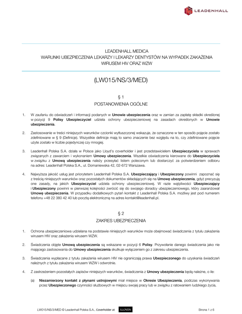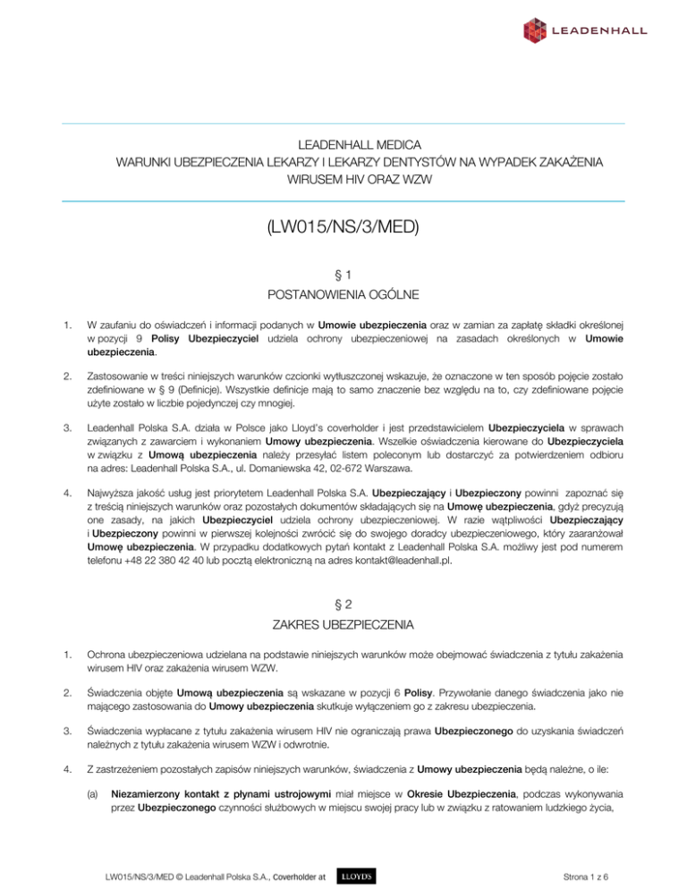 LEADENHALL MEDICA WARUNKI UBEZPIECZENIA LEKARZY I LEKARZY DENTYSTÓW NA WYPADEK ZAKAŻENIA WIRUSEM HIV ORAZ WZW (LW015/NS/3/MED) §1 POSTANOWIENIA OGÓLNE 1. W zaufaniu do oświadczeń i informacji podanych w Umowie ubezpieczenia oraz w zamian za zapłatę składki określonej w pozycji 9 Polisy Ubezpieczyciel udziela ochrony ubezpieczeniowej na zasadach określonych w Umowie ubezpieczenia. 2. Zastosowanie w treści niniejszych warunków czcionki wytłuszczonej wskazuje, że oznaczone w ten sposób pojęcie zostało zdefiniowane w § 9 (Definicje). Wszystkie definicje mają to samo znaczenie bez względu na to, czy zdefiniowane pojęcie użyte zostało w liczbie pojedynczej czy mnogiej. 3. Leadenhall Polska S.A. działa w Polsce jako Lloyd’s coverholder i jest przedstawicielem Ubezpieczyciela w sprawach związanych z zawarciem i wykonaniem Umowy ubezpieczenia. Wszelkie oświadczenia kierowane do Ubezpieczyciela w związku z Umową ubezpieczenia należy przesyłać listem poleconym lub dostarczyć za potwierdzeniem odbioru na adres: Leadenhall Polska S.A., ul. Domaniewska 42, 02-672 Warszawa. 4. Najwyższa jakość usług jest priorytetem Leadenhall Polska S.A. Ubezpieczający i Ubezpieczony powinni zapoznać się z treścią niniejszych warunków oraz pozostałych dokumentów składających się na Umowę ubezpieczenia, gdyż precyzują one zasady, na jakich Ubezpieczyciel udziela ochrony ubezpieczeniowej. W razie wątpliwości Ubezpieczający i Ubezpieczony powinni w pierwszej kolejności zwrócić się do swojego doradcy ubezpieczeniowego, który zaaranżował Umowę ubezpieczenia. W przypadku dodatkowych pytań kontakt z Leadenhall Polska S.A. możliwy jest pod numerem telefonu +48 22 380 42 40 lub pocztą elektroniczną na adres [email protected]. §2 ZAKRES UBEZPIECZENIA 1. Ochrona ubezpieczeniowa udzielana na podstawie niniejszych warunków może obejmować świadczenia z tytułu zakażenia wirusem HIV oraz zakażenia wirusem WZW. 2. Świadczenia objęte Umową ubezpieczenia są wskazane w pozycji 6 Polisy. Przywołanie danego świadczenia jako nie mającego zastosowania do Umowy ubezpieczenia skutkuje wyłączeniem go z zakresu ubezpieczenia. 3. Świadczenia wypłacane z tytułu zakażenia wirusem HIV nie ograniczają prawa Ubezpieczonego do uzyskania świadczeń należnych z tytułu zakażenia wirusem WZW i odwrotnie. 4. Z zastrzeżeniem pozostałych zapisów niniejszych warunków, świadczenia z Umowy ubezpieczenia będą należne, o ile: (a) Niezamierzony kontakt z płynami ustrojowymi miał miejsce w Okresie Ubezpieczenia, podczas wykonywania przez Ubezpieczonego czynności służbowych w miejscu swojej pracy lub w związku z ratowaniem ludzkiego życia, LW015/NS/3/MED © Leadenhall Polska S.A., Coverholder at Strona 1 z 6 (b) testy wykonane niezwłocznie po Niezamierzonym kontakcie z płynami ustrojowymi wykażą, że bezpośrednio przed Niezamierzonym kontaktem z płynami ustrojowymi Ubezpieczony był wolny od zakażenia danym wirusem. §3 ZAKAŻENIE WIRUSEM HIV 1. Zakażenie wirusem HIV oznacza zakażenie Zespołem Nabytego Niedoboru Odporności (AIDS), Zespołem Zaburzeń Związanych z AIDS (ARC), Ludzkim Wirusem Niedoboru Odporności (HIV) - niezależnie od tego jak zostaną nazwane. 2. W granicach limitu wynoszącego 5 000 złotych na cały Okres Ubezpieczenia Ubezpieczyciel zwróci Ubezpieczonemu koszty terapii antyretrowirusowej, której Ubezpieczony obowiązany jest poddać się w następstwie Niezamierzonego kontaktu z płynami ustrojowymi. 3. Jeżeli, mimo przejścia przez Ubezpieczonego kuracji antyretrowirusowej, testy na obecność wirusa HIV przeprowadzone po upływie sześciu miesięcy od Niezamierzonego kontaktu z płynami ustrojowymi wykażą, że Ubezpieczony został zakażony wirusem HIV, to Ubezpieczyciel wypłaci Ubezpieczonemu jednorazowe świadczenie określone w punkcie A pozycji 6 Polisy. 4. W granicach limitu wynoszącego 2 000 złotych na cały Okres Ubezpieczenia Ubezpieczyciel zwróci Ubezpieczonemu koszty konsultacji lekarskich po Niezamierzonym kontakcie z płynami ustrojowymi i wykonania badań na obecność wirusa HIV. §4 ZAKAŻENIE WIRUSEM WZW 1. Zakażenie wirusem WZW oznacza zakażenie Wirusowym Zapaleniem Wątroby typu B (WZW B) lub zakażenie Wirusowym Zapaleniem Wątroby typu C (WZW C). 2. Jeżeli którykolwiek z testów na obecność wirusa przeprowadzonych po upływie trzech oraz sześciu miesięcy od daty Niezamierzonego kontaktu z płynami ustrojowymi wykaże, że Ubezpieczony został zakażony wirusem WZW B lub WZW C, to rozpoczyna bieg okres wyczekiwania wynoszący dwanaście miesięcy od daty przeprowadzenia testu dającego pozytywny wynik badania na obecność wirusa WZW B lub WZW C. 3. Jeżeli po upływie okresu wyczekiwania, o którym mowa w ust. 2, testy na obecność wirusa potwierdzą, że Ubezpieczony pozostaje zakażony wirusem WZW B lub WZW C, to Ubezpieczyciel wypłaci Ubezpieczonemu jednorazowe świadczenie określone w punkcie B pozycji 6 Polisy. 4. Świadczenie określone w punkcie B pozycji 6 Polisy może być wypłacone tylko jeden raz w Okresie ubezpieczenia, niezależnie od liczby i rodzaju wirusów WZW, które pojawią się po Niezamierzonym kontakcie z płynami ustrojowymi. 5. W granicach limitu wynoszącego 2 000 złotych na cały Okres Ubezpieczenia Ubezpieczyciel zwróci Ubezpieczonemu koszty konsultacji lekarskich po Niezamierzonym kontakcie z płynami ustrojowymi i wykonania badań na obecność wirusa WZW B i WZW C. LW015/NS/3/MED © Leadenhall Polska S.A., Coverholder at Strona 2 z 6 §5 WYŁĄCZENIA 1. 2. 3. Umowa ubezpieczenia nie pokrywa roszczeń w jakikolwiek sposób spowodowanych przez, lub do których przyczyniły się: (a) przyjmowanie leków stosowanych w leczeniu uzależnień, (b) samobójstwo, jego usiłowanie, albo celowe samookaleczenie Ubezpieczonego, (c) pozostawanie przez Ubezpieczonego pod wpływem alkoholu lub pod wpływem narkotyków, środków odurzających albo innych substancji fa