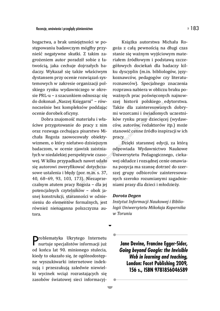 183 Recenzje, omówienia i przeglądy piśmiennictwa e U ni w er sy te tu M ik oł aj a Ko pe rn ik a Książka autorstwa Michała Rogoża z całą pewnością na długi czas stanie się ważnym wyjściowym materiałem źródłowym i podstawą szczegółowych dociekań dla badaczy kilku dyscyplin (m.in. bibliologów, językoznawców, pedagogów czy literaturoznawców). Specjalnego znaczenia rozprawa nabiera w obliczu braku poważnych prac poświęconych najnowszej historii polskiego edytorstwa. Także dla zainteresowanych dobrymi wzorcami i świadomych uczestników rynku prasy dziecięcej (wydawców, autorów, redaktorów itp.) może stanowić cenne źródło inspiracji w ich pracy. Dzięki starannej edycji, za którą odpowiada Wydawnictwo Naukowe Uniwersytetu Pedagogicznego, ciekawej okładce i rozsądnej cenie omawiana pozycja ma szansę dotrzeć do szerszej grupy odbiorców zainteresowanych szeroko rozumianymi zagadnieniami prasy dla dzieci i młodzieży. © C op yr ig ht by W yd aw ni ct w o N au ko w bogactwa, a brak umiejętności w postępowaniu badawczym mógłby przynieść negatywne skutki. Z takim zagrożeniem autor poradził sobie z łatwością, jaka cechuje dojrzałych badaczy. Wykazał się także właściwym dystansem przy ocenie rozwiązań systemowych w zakresie organizacji polskiego rynku wydawniczego w okresie PRL-u − z szacunkiem odnosząc się do dokonań „Naszej Księgarni” − równocześnie bez kompleksów poddając ocenie dorobek oficyny. Dobra znajomość materiału i właściwe przygotowanie do pracy z nim oraz rozwaga cechująca pisarstwo Michała Rogoża zaowocowały obiektywizmem, o który niełatwo dzisiejszym badaczom, w ocenie zjawisk zaistniałych w niedalekiej perspektywie czasowej. W kilku przypadkach nawet udało się autorowi zweryfikować dotychczasowe ustalenia i błędy (por. m.in. s. 37, 40, 68−69, 93, 103, 173). Niezaprzeczalnym atutem pracy Rogoża − dla jej potencjalnych czytelników − obok jasnej konstrukcji, staranności w odniesieniu do elementów formalnych, jest również nienaganna polszczyzna autora. P roblematyka Ukrytego Internetu nurtuje specjalistów informacji już od końca lat 90. minionego stulecia, kiedy to okazało się, że ogólnodostępne wyszukiwarki internetowe indeksują i przeszukują zaledwie niewielki wycinek wciąż rozrastających się zasobów światowej sieci informacyj- Dorota Degen Instytut Informacji Naukowej i Bibliologii Uniwersytetu Mikołaja Kopernika w Toruniu Jane Devine, Francine Egger-Sider, Going beyond Google: the Invisible Web in learning and teaching, London: Facet Publishing 2009, 156 s., ISBN 9781856046589 184 Recenzje, omówienia i przeglądy piśmiennictwa © C op yr ig ht by W yd aw ni ct w o N 1 J. Devine, F. Egger-Sider, Beyond Google: The Invisible Web [on-line]. LaGuardia Community College. Library Media Resources Center [dostęp 10 sierpnia 2010]. Dostępny w World Wide Web: http://library.laguardia.edu/invisibleweb. U ni w er sy te tu M ik oł aj a Ko pe rn ik a zycji szkoleń studentów2 z zakresu Ukrytego Internetu, przygotowanych zgodnie ze standardami kształcenia informacyjnego (ang. information literacy) opracowanymi przez Association of College and Research Libraries i American Association of School Librarians. Pozwala to określić, jakich kompetencji i umiejętności powinni nabyć użytkownicy w wyniku tak przeprowadzonego szkolenia. Zarówno w rozdziale trzecim, jak i czwartym autorki podają przykłady zastosowania sieci WWW do zbierania informacji oraz udzielają wskazówek dotyczących odpowiednich metod odnajdywania i wykorzystywania danych zgromadzonych w ten sposób. Szczególnie cenne są przykładowe zadania, ćwiczenia dla studentów wraz z sugerowanymi propozycjami ich rozwiązywania – wskazują na często popełniane błędy i zaniechania, co w prosty sposób pozwala na wyeliminowanie ich w procesie kształcenia. W rozdziale piątym Devine i Egger-Sider prezentują różne rodzaje strategii wyszukiwawczych pomocne w przeszukiwaniu zasobów Sieci Głębokiej (ang. Deep Web, Hidden Web). Wykorzystywanie Ukrytego Internetu w procesie zbierania informacji zostało tu zobrazowane na podstawie studium przypadku, tj. z zastosowaniem konkretnych narzędzi wyszukiwawczych, strategii i metod selekcji zgromadzonego materiału. Kolejny rozdział książki przybliża przykładowe narzędzia do eksplo- e au ko w nej. Problem narastał wraz z pojawieniem się i szybką monopolizacją rynku przez wyszukiwarkę Google. Wówczas zaczęły ukazywać się publikacje charakteryzujące zjawisko, opisujące możliwe rozwiązania, w których postulowano upowszechnienie wiedzy o Ukrytym Internecie i alternatywach wyszukiwawczych wśród użytkowników sieci. Brakowało jednak wzorów i standardów kształcenia w tej materii. Publikacja Jane Devine i Francine Egger-Sider doskonale wypełnia tę lukę. Obie autorki są długoletnimi pracownicami biblioteki LaGuardia Community College w Nowym Jorku, gdzie od lat szkolą użytkowników w zakresie wyszukiwania informacji. Przykładem działań autorek na tym polu może być cykl warsztatów z zakresu przeszukiwania Ukrytego Internetu prowadzony w 2003 r., którego następstwem jest aktualizowane szkolenie zamieszczone na stronach internetowych macierzystej biblioteki1. Recenzowana pozycja składa się z siedmiu rozdziałów. Mimo że przybliża ona problematykę Ukrytego Internetu (rozdział pierwszy) oraz zachowania użytkowników poszukujących informacji za pomocą narzędzi dostępnych w sieci (rozdział drugi), to merytorycznie wykracza jednak poza charakterystykę samego zjawiska. Najciekawszą częścią książki jest rozdział trzeci, tj. zestawienie propo- 2 Autorki skupiają się na studentach college’ów i uczelni wyższych. 185 Recenzje, omówienia i przeglądy piśmiennictwa © C op yr ig ht by W yd aw ni ct w o N U ni w er sy te tu M ik oł aj a Ko pe rn ik a Omawiana pozycja została uzupełniona trzema aneksami.