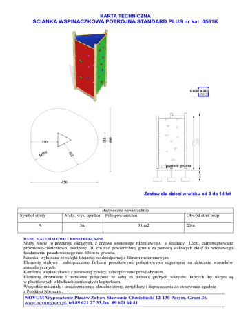 KARTA TECHNICZNA ŚCIANKA WSPINACZKOWA POTRÓJNA STANDARD PLUS nr kat. 0581K Zestaw dla dzieci w wieku od 3 do 14 lat Symbol strefy A Bezpieczna nawierzchnia Maks. wys. upadku Pole powierzchni 3m 31 m2 Obwód stref bezp. 20m DANE MATERIAŁOWO – KONSTRUKCYJNE Słupy nośne o przekroju okrągłym, z drzewa sosnowego rdzeniowego, o średnicy 12cm, zaimpregnowane próżniowo-ciśnieniowo, osadzone 10 cm nad powierzchnią gruntu za pomocą stalowych okuć do betonowego fundamentu posadowionego min 60cm w gruncie. Ścianka wykonana ze sklejki liściastej wodoodpornej z filmem melaminowym. Elementy stalowe zabezpieczone farbami proszkowymi poliestrowymi odpornymi na działanie warunków atmosferycznych. Kamienie wspinaczkowe z porowatej żywicy, zabezpieczone przed obrotem. Elementy drewniane i metalowe połączone ze sobą za pomocą grubych wkrętów, których łby ukryte są w plastikowych wkładkach zamkniętych kapturkiem. Wszystkie materiały i urządzenia mają aktualne atesty, certyfikaty i dopuszczenia do stosowania zgodnie z Polskimi Normami. NOVUM Wyposażenie Placów Zabaw Sławomir Chmieliński 12-130 Pasym. Grom 36 www.novumgrom.pl, tel.89 621 27 33,fax 89 621 64 41