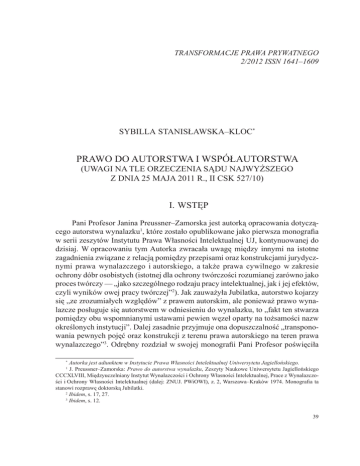 Transformacje Prawa Prywatnego 2/2012 ISSN 1641–1609 Sybilla Stanisławska–Kloc* Prawo do autorstwA i współautorstwa (uwagi na tle orzeczenia Sądu Najwyższego z dnia 25 maja 2011 r., II CSK 527/10) I. Wstęp Pani Profesor Janina Preussner–Zamorska jest autorką opracowania dotyczącego autorstwa wynalazku, które zostało opublikowane jako pierwsza monografia w serii zeszytów Instytutu Prawa Własności Intelektualnej UJ, kontynuowanej do dzisiaj. W opracowaniu tym Autorka zwracała uwagę między innymi na istotne zagadnienia związane z relacją pomiędzy przepisami oraz konstrukcjami jurydycznymi prawa wynalazczego i autorskiego, a także prawa cywilnego w zakresie ochrony dóbr osobistych (istotnej dla ochrony twórczości rozumianej zarówno jako proces twórczy — „jako szczególnego rodzaju pracy intelektualnej, jak i jej efektów, czyli wyników owej pracy twórczej”). Jak zauważyła Jubilatka, autorstwo kojarzy się „ze zrozumiałych względów” z prawem autorskim, ale ponieważ prawo wynalazcze posługuje się autorstwem w odniesieniu do wynalazku, to „fakt ten stwarza pomiędzy obu wspomnianymi ustawami pewien węzeł oparty na tożsamości nazw określonych instytucji”. Dalej zasadnie przyjmuje ona dopuszczalność „transponowania pewnych pojęć oraz konstrukcji z terenu prawa autorskiego na teren prawa wynalazczego”. Odrębny rozdział w swojej monografii Pani Profesor poświęciła Autorka jest adiunktem w Instytucie Prawa Własności Intelektualnej Uniwersytetu Jagiellońskiego. J. Preussner–Zamorska: Prawo do autorstwa wynalazku, Zeszyty Naukowe Uniwersytetu Jagiellońskiego CCCXLVIII, Międzyuczelniany Instytut Wynalazczości i Ochrony Własności Intelektualnej, Prace z Wynalazczości i Ochrony Własności Intelektualnej (dalej: ZNUJ. PWiOWI), z. 2, Warszawa–Kraków 1974. Monografia ta stanowi rozprawę doktorską Jubilatki. Ibidem, s. 17, 27. Ibidem, s. 12. * 39 Transformacje Prawa Prywatnego 2/2012 współautorstwu, w którym wspominała między innymi o nagannej praktyce polegającej na „dopisywaniu współautorów”. Uważa ona, że przy ustalaniu współautorstwa istotne znaczenie mają nie tylko wielkość wkładu, lecz także stopień twórczego przyczynienia się osoby do dokonania wynalazku. Dlatego w tym opracowaniu złożonym w hołdzie Pani Profesor odnoszę się do kwestii autorstwa (współautorstwa), co prawda w dużej mierze dotyczącego prawa autorskiego, ale z pewnymi uwagami, które mogą być stosowane szerzej w sferze twórczości intelektualnej. Sama instytucja prawa do autorstwa nie była przedmiotem licznych opracowań ani kontrowersji. Wydaje się uprawniona teza, iż dotąd większym zainteresowaniem naukowców, praktyków cieszyła się w sferze twórczości problematyka praw majątkowych — zarówno autorskich praw majątkowych, jak i patentu. Jest to o tyle uzasadnione, że gospodarcze znaczenie praw osobistych jest mniejsze, i przypadków naruszeń tych praw w praktyce było zdecydowanie mniej, a co za tym idzie — orzecznictwo nie obfitowało w interesujące rozstrzygnięcia. Obecnie sytuacja się zmieniła; w sferze prawa autorskiego — „zainteresowanie” prawem do autorstwa nabiera znaczenia między innymi w związku z: – nasileniem się występowania zjawiska plagiatu — stanowiącego najpoważniejsze naruszenie prawa do autorstwa, polegające na przywłaszczeniu sobie prawa do autorstwa cudzego utworu (elementów twórczych cudzego utworu lub wkładu do utworu współtwórczego); – instytucją współautorstwa, która coraz częściej ma miejsce (nie tylko w stosunkach pracowniczych) i rodzi problemy w zakresie oznaczania autorstwa wkładów poszczególnych autorów (wykonywanie prawa do autorstwa przez każdego ze współautorów ma moim zdaniem charakter samodzielny); uhonorowywania tego ze współautorów, który wniósł najważniejszy wkład poprzez „instytucję” tzw. pierwszego autora; – wykonywaniem praw osobistych, a szczególnie prawa do autorstwa w odniesieniu do utworów pracowniczych; chociaż właściwsze byłoby określenie, iż tak naprawdę problem stanowi określenie granic, zasad wyrażania zgody na niewykonywanie tych praw w odniesieniu do utworów, w stosunku do których pracodawca nabył autorskie prawa majątkowe na podstawie art. 12 pr. aut.; innym zagadnieniem jest relacja między prawem do autorstwa a instytucją afiliacji (w tym ustalaniem zasad afiliacji w regulaminach własności intelektual nej, np. obowiązujących na uczelniach); Ibidem, s. 65. Ibidem, s. 128. Zwraca na to uwagę J. Preussner–Zamorska, pisząc: „problematyka osobistych praw twórców projektów wynalazczych (…) pozostaje w cieniu problematyki praw majątkowych”; ibidem, s. 5. Por. J. Barta: Artystyczna twórczość pracownicza a prawo autorskie, Kraków 1988, Rozprawy habilitacyjne nr 137. 40 Sybilla Stanisławska–Kloc: Prawo do autorstwa i współautorstwa… – rozwojem ruchu Creative Commons (CC), promowaniem idei otwartej kultury, której zwolennicy, „dzieląc” się z użytkownikami swoimi prawami majątkowymi, pozostawiają na swoją rzecz tylko niektóre prawa („some rights reserved”, w wolnym tłumaczeniu „niektóre prawa zastrzeżone”, przy czym pierwszym wśród tych „niektórych” praw zastrzeżonych jest prawo do autorstwa, do oznaczenia autorstwa — attribution rights); – autorstwem „zbiorowym” — oznaczaniem autorstwa nowej, zarówno specyficznej kategorii utworów, na przykład haseł w encyklopedii internetowej, że w procesie ich tworzenia (i/lub edytowania) bierze udział niekiedy kilkadziesiąt osób10; jak i kategorii już od dawna funkcjonującej, tj. niektórych utworów naukowych (będących wynikiem pracy zespołów licznych naukowców, o bardzo zróżnicowanym stopniu zaangażowania); w pewnym sensie tego zagadnienia dotyczy orzeczenie, które będzie omawiane po niżej. Trudno chyba mówić o pełnym renesansie praw osobistych,