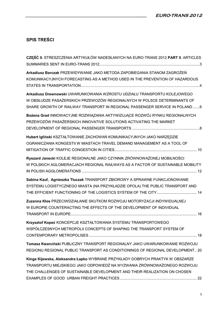 EURO-TRANS 2012 SPIS TREŚCI CZĘŚĆ II. STRESZCZENIA ARTYKUŁÓW NADESŁANYCH NA EURO-TRANS 2012 PART II. ARTICLES SUMMARIES SENT IN EURO-TRANS 2012..................................................................................................3 Arkadiusz Barczak PRZEWIDYWANIE JAKO METODA ZAPOBIEGANIA STANOM ZAGROŻEŃ KOMUNIKACYJNYCH FORECASTING AS A METHOD USED IN THE PREVENTION OF HAZARDOUS STATES IN TRANSPORTATION ....................................................................................................................4 Arkadiusz Drewnowski UWARUNKOWANIA WZROSTU UDZIAŁU TRANSPORTU KOLEJOWEGO W OBSŁUDZE PASAŻERSKICH PRZEWOZÓW REGIONALNYCH W POLSCE DETERMINANTS OF SHARE GROWTH OF RAILWAY TRANSPORT IN REGIONAL PASSENGER SERVICE IN POLAND .......6 Bożena Grad INNOWACYJNE ROZWIĄZANIA AKTYWIZUJĄCE ROZWÓJ RYNKU REGIONALNYCH PRZEWOZÓW PASAŻERSKICH INNOVATIVE SOLUTIONS ACTIVATING THE MARKET DEVELOPMENT OF REGIONAL PASSENGER TRANSPORTS ..................................................................8 Hubert Igliński KSZTAŁTOWANIE ZACHOWAŃ KOMUNIKACYJNYCH JAKO NARZĘDZIE OGRANICZANIA KONGESTII W MIASTACH TRAVEL DEMAND MANAGEMENT AS A TOOL OF MITIGATION OF TRAFFIC CONGESTION IN CITIES ................................................................................ 10 Ryszard Janecki KOLEJE REGIONALNE JAKO CZYNNIK ZRÓWNOWAŻONEJ MOBILNOŚCI W POLSKICH AGLOMERACJACH REGIONAL RAILWAYS AS A FACTOR OF SUSTAINABLE MOBILITY IN POLISH AGGLOMERATIONS ................................................................................................................ 12 Sabina Kauf, Agnieszka Tłuczak TRANSPORT ZBIOROWY A SPRAWNE FUNKCJONOWANIE SYSTEMU LOGISTYCZNEGO MIASTA (NA PRZYKŁADZIE OPOLA) THE PUBLIC TRANSPORT AND THE EFFICIENT FUNCTIONING OF THE LOGISTICS SYSTEM OF THE CITY....................................... 14 Zuzanna Kłos PRZECIWDZIAŁANIE SKUTKOM ROZWOJU MOTORYZACJI INDYWIDUALNEJ W EUROPIE COUNTERACTING THE EFFECTS OF THE DEVELOPMENT OF INDIVIDUAL TRANSPORT IN EUROPE........................................................................................................................... 16 Krzysztof Kopeć KONCEPCJE KSZTAŁTOWANIA SYSTEMU TRANSPORTOWEGO WSPÓŁCZESNYCH METROPOLII CONCEPTS OF SHAPING THE TRANSPORT SYSTEM OF CONTEMPORARY METROPOLISES ......................................................................................................... 18 Tomasz Kwarciński PUBLICZNY TRANSPORT REGIONALNY JAKO UWARUNKOWANIE ROZWOJU REGIONU REGIONAL PUBLIC TRANSPORT AS CONDITIONINGS OF REGIONAL DEVELOPMENT.. 20 Kinga Kijewska, Aleksandra Łapko WYBRANE PRZYKŁADY DOBRYCH PRAKTYK W OBSZARZE TRANSPORTU MIEJSKIEGO JAKO ODPOWIEDŹ NA WYZWANIA ZRÓWNOWAŻONEGO ROZWOJU THE CHALLENGES OF SUSTAINABLE DEVELOPMENT AND THEIR REALIZATION ON CHOSEN EXAMPLES OF GOOD URBAN FREIGHT PRACTICES ........................................................................... 22 1 Anna Mężyk KOLEJOWE PRZEWOZY PASAŻERSKIE W UNII EUROPEJSKIEJ - STAN I PERSPEKTYWY ROZWOJU RAILWAY PASSENGER SERVICES IN THE EU - STATE OF THE ART AND PERSPECTIVES FOR THE FUTURE ................................................................................................. 24 Jana Pieriegud ZMIANY W OTOCZENIU ORAZ OCZEKIWANIA SPOŁECZEŃSTWA EUROPEJSKIEGO WOBEC PASAŻERSKIEGO TRANSPORTU KOLEJOWEGO CHANGES IN THE BUSINESS ENVIRONMENT AND THE EXPECTATIONS OF EUROPEAN SOCIETY FOR PASSENGER RAIL TRANSPORT ................................................................................................................................................ 26 Adam Przybyłowski ZINTEGROWANA MOBILNOŚĆ W MIASTACH NA PRZYKŁADZIE LYONU I TRÓJMIASTA URBAN INTEGRATED MOBILITY AT THE EXAMPLE OF LYON AND TRICITY CONURBATIONS ......................................................................................................................................... 28 Michał Suchanek PUBLICZNY TRANSPORT ZBIOROWY W ŚWIETLE DIAGNOSTYCZNYCH BADAŃ PROCESÓW METROPOLIZACJI OBSZARÓW AGLOMERACJI TRÓJMIASTO PUBLIC TRANSPORT IN LIGHT OF DIAGNOSTIC RESEARCH ON METROPOLITAN PROCESSES IN “TRÓJMIASTO” AGGLOMERATION ...................................................................................................................................... 30 Jolanta Sułek, Krystyna Araszkiewicz PERSPEKTYWY ROZWOJU JACHTINGU W REGIONIE POMORZA ZACHODNIEGO PROSPECTS OF THE DEVELOPMENT OF YACHTING IN THE REGION OF WESTERN POMERANIA ....................................................................................................................... 32 Krzysztof Szałucki EKONOMICZNA EFEKTYWNOŚĆ PRZEDSIĘBIORSTW PUBLICZNEGO TRANSPORTU ZBIOROWEGO W ŚWIETLE POWIERZENIOWEJ FORMUŁY WYKONYWANIA ZADAŃ PRZEWOZOWYCH ECONOMIC EFFECTIVENESS OF THE PUBLIC TRANSPORT ENTERPRISES IN LIGHT OF THE ENDOWMENT FORMULA OF TRANSPORTATION ASSIGNMENTS ............................. 34 Blanka Tundys UWARUNKOWANIA IMPLEMENTACJI ZRÓWNOWAŻONEJ MOBILNOŚCI W MIASTACH – PERSPEKTYWA 2050 CONDITIONS FOR IMPLEMENTATION OF SUSTAINABLE URBAN MOBILITY - THE PERSPECTIVE OF 2050.................................................................................... 36 Beata Zagożdżon MIEJSCE OPERATORÓW PRYWATNYCH NA RYNKU TRANSPORTU ZBIOROWEGO W ASPEKCIE EFEKTYWNOŚCI SYSTEMÓW ZARZĄDCZO-ORGANIZACYJNYCH THE PLACE OF PRIVATE OPERATORS IN THE PUBLIC TRANSPORT MARKET IN TERMS OF EFFECTIVENESS OF THE MANAGERIAL-ORGANIZATIONAL SYSTEM ................................................ 38 Elżbieta Załoga WZORCE MOBILNOŚCI OSÓB W JEDNOLITYM EUROPEJSKIM OBSZARZE TRANSPORTU PATTERNS OF MOBILITY IN A SINGLE EUROPEAN TRANSPORT AREA ................... 40 Stanisława Zamkowska MOBILNOŚĆ W DOBIE GLOBALIZACJI MOBILTY IN THE AGE OF GLOBALIZATION ......................................................................................................................................... 42 Magdalena Zioło FINANSOWANIE USŁUG ZBIOROWEGO TRANSPORTU PUBLICZNEGO W WARUNKACH OGRANICZANIA MOŻLI