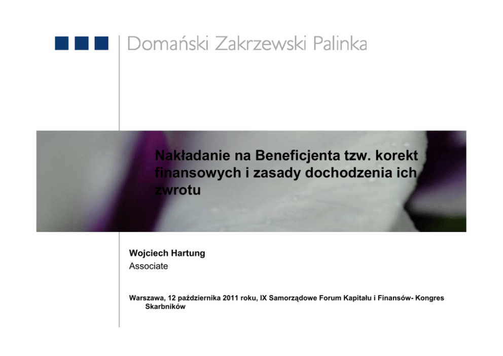 Nakładanie na Beneficjenta tzw. korekt finansowych i zasady dochodzenia ich zwrotu Wojciech Hartung Associate Warszawa, 12 października 2011 roku, IX Samorządowe Forum Kapitału i Finansów- Kongres Skarbników Plan wystąpienia • Zasady nakładania korekt finansowych – prawo europejskie/prawo polskie - nieprawidłowości indywidualne - nieprawidłowości systemowe • Tryb postępowania w przypadku nałoŜenia korekty indywidualnej w kontekście art. 207 Ustawy o finansach publicznych - droga odwoławcza w przypadku, gdy środki finansowe nie zostały zwrócone; - odzyskiwanie środków zwróconych przez Beneficjenta • Odpowiedzialność za naruszenia systemowe i tryb dochodzenia zwrotu nałoŜonej korekty Zasady nakładania korekt finansowych – prawo europejskie/prawo polskie „Działania finansowane przez fundusze lub otrzymujące wsparcie z EBI lub z innego instrumentu finansowego są zgodne z postanowieniami Traktatu, z instrumentami przyjętymi w ramach Traktatu oraz z politykami i działaniami Wspólnoty, włączając w to reguły konkurencji, udzielanie zamówień publicznych, ochrony i poprawy stanu środowiska naturalnego, zniesienia nierówności i wspierania równości kobiet i męŜczyzn.” art. 12 rozporządzenia 1260/1999/WE art. 9 ust. 5 rozporządzenia 1083/2006/WE Zasady nakładania korekt finansowych – prawo europejskie/prawo polskie Zgodnie z art. 39 ust 1 rozporządzenia 1260/1999 oraz art. 98 rozporządzenia 1083/2006 to Państwa Członkowskie w pierwszej kolejności ponoszą odpowiedzialność za wykrywanie nieprawidłowości w wydatkowaniu środków pochodzących z funduszy, m.in. dokonując korekt finansowych Państwo Członkowskie dokonuje wymaganych korekt finansowych w związku z indywidualnymi lub systemowymi nieprawidłowościami. Środki pochodzące z nałoŜonych korekt finansowych mogą zostać ponownie wykorzystane przez Państwo Członkowskie w programie operacyjnym, jeśli to ono zidentyfikuje i nałoŜy korektę Zasady nakładania korekt finansowych – prawo europejskie/prawo polskie art. 2 pkt 7 rozporządzenia 1083/2006 - „nieprawidłowość”: jakiekolwiek naruszenie przepisu prawa wspólnotowego wynikające z działania lub zaniechania podmiotu gospodarczego, które powoduje lub mogłoby spowodować szkodę w budŜecie ogólnym Unii Europejskiej w drodze finansowania nieuzasadnionego wydatku z budŜetu ogólnego. Nie kaŜde naruszenie moŜe być kwalifikowane jako nieprawidłowość Zasady nakładania korekt finansowych – prawo europejskie/prawo polskie korekta finansowa (dla projektu) – oznacza anulowanie całości lub części wkładu, który nie moŜe zostać wykorzystany ponownie na projekt lub projekty, które zostały poddane korekcie; korekta finansowa polega na pomniejszeniu maksymalnej kwoty dofinansowania o kwotę nieprawidłową; korekta finansowa jest nakładana tylko w sytuacji, gdy wydatek obarczony nieprawidłowością został rozliczony beneficjentowi; w sytuacji wykrycia nieprawidłowości przed rozliczeniem beneficjentowi wydatek uznawany jest za niekwalifikowalny (następuje obniŜenie kwoty zatwierdzonej do rozliczenia w ramach wniosku o płatność), nie jest natomiast poddawany korekcie finansowej. Zasady nakładania korekt finansowych – prawo europejskie/prawo polskie nieprawidłowość systemowa jest powtarzającym się błędem wynikającym z powaŜnych niedoskonałości systemów zarządzania i kontroli ustanowionych dla zapewnienia poprawnej rachunkowości oraz zgodności z zasadami i przepisami. nieprawidłowość systemowa będzie występować w przypadku łącznego wystąpienia poniŜszych czynników: a) stwierdzenie naruszenia polegającego na powaŜnej niedoskonałości systemu zarządzania i kontroli danego Programu, b) naruszenie ma potencjalnie powtarzający się charakter, czyli powinno obejmować większą ilość projektów (np. realizowanych w ramach danego działania), c) naruszenie powoduje naraŜenie budŜetu ogólnego UE na rzeczywiste ryzyko utraty środków poprzez moŜliwość finansowania projektów realizowanych niezgodnie z zasadami i przepisami Zasady nakładania korekt finansowych – prawo europejskie/prawo polskie Wytyczne do określania korekt finansowych nakładanych na wydatki ponoszone z funduszy strukturalnych i Funduszu Spójności w przypadku naruszenia przepisów prawa zamówień publicznych – dok. KE z dnia 29 listopada 2007 r. Komisja zaleca Państwom Członkowskim w Wytycznych stosowanie wskazanych poziomów korekt lub opracowanie własnego systemu regulującego tę kwestię – systemu nie mniej restrykcyjnego Krajowy dokument Wymierzanie korekt finansowych za naruszenia prawa zamówień publicznych związane z realizacją projektów współfinansowanych ze środków funduszy UE z 2008 r. uzupełniony w 2010 r. Zasady nakładania korekt finansowych – prawo europejskie/prawo polskie Metoda dyferencyjna (podstawowa) - oszacowanie wielkości szkody (stosowana w przypadkach, kiedy taki szacunek jest moŜliwy); Polega na porównaniu wysokości rzeczywiście wydatkowanych (lub zakontraktowanych) środków na sfinansowanie zamówienia udzielonego z naruszeniem zasad ze stanem, który istniałby, gdyby naruszenie nie wystąpiło; Metoda wskaźnikowa (pomocnicza) –obliczenie wielkości korekty z wykorzystaniem zaproponowanego w taryfikatorze poziomu korekty (stosowana w przypadkach, kiedy skutki finansowe szkody są pośrednie, a zatem trudne do oszacowania). Odpowiedzialność za naruszenia i tryb dochodzenia zwrotu nałoŜonej korekty Instytucje odpowiedzialne za informowanie o nieprawidłowościach zobowiązane są do weryfikowania otrzymanych informacji o stwierdzonych naruszeniach, w tym dokonywania oceny, czy wykryte naruszenie stanowi nieprawidłowość. Ocena stwierdzająca podejrzenie lub wystąpienie nieprawidłowości stanowi wstępne ustalenie. Dokonanie wstępnego ustalenia nie przesądza o istnieniu nieprawidłowości, poniewaŜ istnieje moŜliwoś