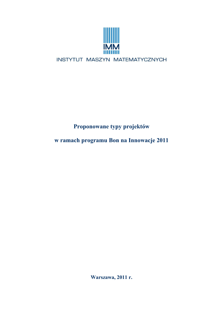 Proponowane typy projektów w ramach programu Bon na Innowacje 2011 Warszawa, 2011 r. Program Bon na Innowacje 2011 Spis treści 1. Projekt „Modernizacja firmowej strony WWW zwiększająca skuteczność jej oddziaływania” 5 2. Projekt „Modernizacja strony WWW i opracowanie jej wersji mobilnej” 5 3. Projekt „Opracowanie wersji mobilnej firmowej strony WWW” 6 4. Projekt „Optymalizacja firmowej strony WWW lokująca ją na pierwszych stronach wyników wyszukiwań” 7 5. Projekt „Internetowy interaktywny katalog produktów i usług z wykorzystaniem technologii e-learningowej” 8 6. Projekt „Internetowy katalog produktów wraz z możliwością zakupu” 9 7. Projekt „Semantyczny e-katalog produktów z możliwością zakupu” 9 8. Projekt „Indywidualne projektowanie produktu przez Internet” 10 10. Projekt „Semantyczny e-handel” 12 11. Projekt „System interaktywnych działań biznesowych na Twitter’ze (szkolenia/promocja/gry)” 13 12. Projekt „System interaktywnych działań biznesowych na Facebook’u (szkolenia/promocja/gry)” 14 13. Projekt „Wprowadzenie przedsiębiorstwa do wirtualnej rzeczywistości – mini-laboratorium szkoleniowe i/lub promocja przedsiębiorstwa” 16 14. Projekt „System zarządzania dokumentami w chmurze – dla mobilnych przedsiębiorców i pracowników” 17 15. Projekt „Wspomaganie obiegu korespondencji dla małych firm” 17 16. Projekt „Wiedza ze świata na zamówienie przedsiębiorstwa (mashup)” 18 17. Projekt „Promocja przedsiębiorstwa w mediach społecznych Web 2.0” 19 18. Projekt „Kontekstowa promocja przedsiębiorstwa w mobilnym Internecie dostosowana do lokalizacji użytkownika” 19 19. Projekt „System mobilnego rozszerzania informacji o przedsiębiorstwie i jego ofercie za pomocą kodów matrycowych QR” 20 20. Projekt „System Mobilny Menedżer 2.0” 21 21. Projekt „System Przenośne Biuro 2.0” 22 22. Projekt „Doradztwo i pilotażowe wdrożenie rozwiązania w zakresie wykorzystania przez przedsiębiorstwo technologii Web 2.0 i 3.0 dla interaktywnej promocji, marketingu i obsługi klientów” 24 2 Proponowane typy projektów… Program Bon na Innowacje 2011 23. Projekt „Zoptymalizowanie organizacyjno-informatyczne przedsiębiorstwa” 25 24. Projekt „Wspomaganie obiegu korespondencji dla małych firm przy pomocy urządzeń mobilnych” 25. Projekt „Mobilne szkolenia elektroniczne” 25 26 26. Projekt „ERP – mobilność w zarządzaniu – system zarządzania dla mobilnych przedsiębiorców i pracowników” 27. Projekt „Rejestracja i wspomaganie obiegu korespondencji dla małych firm” 27 28 28. Projekt „Podnoszenie wydajności pracy poprzez eliminowanie nieproduktywnego wykorzystania Internetu” 29. Projekt „Bezpieczny biznes w Internecie” 28 29 30. Projekt „Przetwarzanie danych zgodnie z przepisami jako fundament stabilnego wzrostu firmy” 31. Projekt „Uruchomienie innowacyjnych kanałów komunikacji z klientami” 30 31 32. Projekt „Stanowisko ABI wraz z wymaganymi przez prawo dokumentami Polityki Bezpieczeństwa Informacji i instrukcji zarządzania systemem informatycznym przetwarzającym dane osobowe” 31 33. Projekt „System inteligentnego wydruku w oparciu o metodologię optymalizacji” 32 34. Projekt „Bezpieczna archiwizacja w chmurze dla małych firm 33 3 Proponowane typy projektów… Program Bon na Innowacje 2011 Zaproszenie Przedsiębiorców do współpracy z Instytutem Szanowni Państwo, zbliża się termin ogłoszenia przez PARP IV Konkursu projektów w ramach programu Ministerstwa Gospodarki „Bon na Innowacje” (w połowie marca 2011 r.). Celem tego Programu jest zainicjowanie kontaktów mikro- lub małych przedsiębiorstw z jednostkami naukowymi. W ramach programu BNI mogą być realizowane usługi dotyczące wdrożenia lub rozwoju produktu lub technologii, świadczone przez jednostkę naukową, mające na celu np. opracowanie nowych lub udoskonalenie istniejących technologii lub wyrobów danego przedsiębiorstwa, w tym usługi doradcze świadczone przez jednostki naukowe. Wysokość dofinansowania (bonu) usługi świadczonej dla przedsiębiorstwa wynosi 15 tys. zł netto, a okres jej realizacji maksymalnie trzy miesiące. Koszty usługi przekraczające tę kwotę mogą być pokrywane przez samo przedsiębiorstwo. W celu uzyskania dofinansowania przedsiębiorstwo, po ogłoszeniu przez PARP konkursu, zgłasza wniosek o dofinansowanie usługi badawczej ze sformułowanym tematem, wskazując jako jej wykonawcę jednostkę naukową, uprzednio uzgadniając z jednostką zakres i charakter prac w ramach usługi. Więcej informacji o programie można znaleźć na stronie PARP http://www.parp.gov.pl/index/index/1415. W ciągu 2 ostatnich lat, 2009 r. i 2010 r., Instytut Maszyn Matematycznych brał udział w programie „Bon na Innowacje”, realizując usługi badawcze dla mikro- i małych przedsiębiorstw. Mieliśmy przyjemność zrealizować małe projekty dla potrzeb ok. 200 przedsiębiorstw. W tym roku, 2011, proponujemy Państwu zrealizowanie wspólnie małych projektów, które opracowaliśmy dla Państwa, z myślą, że będą interesujące i pożyteczne. Załączamy ich listę, krótkie streszczenia i argumenty przemawiające „za” ich realizacją. Wszystkie uwzględniają najnowsze trendy technologiczne i trendy społecznych potrzeb (czytaj: potrzeb Waszych klientów). Na pewno przysłużą się konkurencyjności prowadzonych przez Państwa firm! Przedsiębiorców zainteresowanych realizacją więcej niż jednego projektu, informujemy, że istnieje możliwość zrealizowania kompleksowego projektu, na który złożyłyby się działania dwóch mniejszych projektów z proponowanej listy. Jesteśmy jednak ograniczeni czasem narzuconym przez PARP – 3 miesiące. Więc większe projekty, w całości lub częściowo byłyby w takim przypadku realizowane poza programem „Bon na Innowacje”, ze środków przedsiębiorców. Chętnie też weź