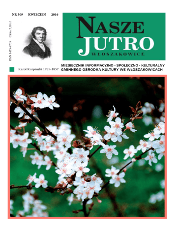 KWIECIEŃ 2016 ISSN 1425-4735 Cena 2,50 zł NR 309 MIESIĘCZNIK INFORMACYJNO - SPOŁECZNO - KULTURALNY Karol Kurpiński 1785-1857 GMINNEGO OŚRODKA KULTURY WE WŁOSZAKOWICACH OGŁOSZENIA i PODZIĘKOWANIE Ochotnicza Straż Pożarna we Włoszakowicach zaprasza na Nasze Jutro 3 Obchody Święta Konstytucji 3 Maja Drzwi Otwarte Impreza odbędzie się 1 maja 2016 roku o godzinie 13 w remizie OSP Włoszakowice. Podczas Dni Otwartych przewidziano wiele atrakcji, m.in.: - pokazy sprzętu pożarniczego, medycznego oraz chemicznego, - pokaz akcji ratownictwa technicznego, - wiele atrakcji dla dzieci. Serdecznie zapraszamy! OGŁOSZENIE Gmina Włoszakowice zatrudni 2 pracowników do prac melioracyjnych i porządkowych na terenie gminy. Osoby ubiegające się o pracę powinny spełniać następujące warunki: - dobry stan zdrowia - prawo jazdy kat. B - zdyscyplinowanie i sumienność - umiejętność posługiwania się prostymi narzędziami (np. łopata, kosa) i sprzętem mechanicznym (np. kosiarka i kosa spalinowa) - posiadać ogólną wiedzę na temat melioracji - dyspozycyjność - umiejętność pracy w zespole. Kandydaci do pracy proszeni są o zgłoszenie się w siedzibie Urzędu Gminy Włoszakowice pokój nr 116 w terminie do 30 kwietnia 2016 r. Bieżące relacje z wydarzeń w tym bezpośrednie transmisje obrad Rady Gminy na stronie wloszakowice.pl 3 maja (wtorek) godz. 10.00 Włoszakowice - boisko w parku Msza święta polowa w intencji Ojczyzny z udziałem władz samorządowych 3 maja (wtorek) godz. 13.00 Bukówiec Górny - boisko sportowe Zawody w Powożeniu Zaprzęgami Parokonnymi im. Józefa Lipowego Przypominamy o oflagowaniu ! Rada Rodziców Przedszkola nr 2 we Włoszakowicach dziękuje wszystkim, którzy przyczynili się do zorganizowania i uświetnienia Zabawy karnawałowej która odbyła się 23 stycznia 2016 r. w sali GOK we Włoszakowicach. Przede wszystkim dziękujemy uczestnikom zabawy, firmom jak i osobom prywatnym za zaangażowanie i ofiarowane dary. Dzięki Państwa życzliwości pozyskane środki finansowe zostaną przeznaczone dla przedszkolaków na wycieczki i doposażenie sal 4 Nasze Jutro URZĄD GMINY Inwestycje gminne Zakończono budowę nawierzchni asfaltowych na drogach dojazdowych do gruntów rolnych w miejscowościach Zbarzewo, Krzycko Wielkie i Charbielin. W Zbarzewie powstał odcinek o długości 0,46 km i szerokości nawierzchni 4,0 m. Odpowiednio: w Krzycku Wielkim jest to odcinek o długości 1,0 km i szerokości 4,5 m, a w Charbielinie o długości 0,22 km i szerokości 5,0 m. Generalnym wykonawcą wyłonionym w przetargu nieograniczonym była firma Przedsiębiorstwo Dróg i Ulic z Leszna. Całkowity koszt nowo wybudowanych dróg wyniósł 385.971,54 zł. Zadanie zostało współfinansowane ze środków Województwa Wielkopolskiego w formie dotacji celowej na dofinansowanie budowy lub przebudowy dróg dojazdowych do gruntów rolnych. J. Michalski Budowa drogi w Charbielinie Budowa drogi na Adamowie w Krzycku Wielkim Zakończyły się zebrania sprawozdawczo-wyborcze w OSP Zebranie OSP Włoszakowice w dniu 11 marca Zakończyły się trwające w lutym i marcu zebrania sprawozdawczo-wyborcze w jednostkach Ochotniczych Straży Pożarnych na terenie naszej gminy. Podczas zebrań przedstawiono sprawozdania z działalności OSP w roku 2015 oraz plany działalności i plany finansowe na rok 2016. Poza tym raz na 5 lat członkowie wybierają spośród siebie Zarząd oraz Komisję Rewizyjną i z taką sytuacją mieliśmy do czynienia w tym roku. W wyniku tegorocznych zebrań w zarządach OSP doszło do wielu zmian. Poniżej przedstawione zostają nowe władze w poszczególnych jednostkach. OSP Bukówiec Górny Prezes Bartosz Zając, Wiceprezes-Naczelnik - Jacek Marcinek, Wiceprezes - Grzegorz Poniży, Zastępca Naczelnika - Eryk Poniży, Sekretarz - Rafał Młynkowiak, Skarbnik - Jan Grygiel, Kronikarz - Monika Flieger, Gospodarz - Dawid Błaszkowski, Członek - Piotr Gnaciński. OSP Jezierzyce Kościelne Prezes - Jan Przydrożny, Wiceprezes-Naczelnik - Adam Kopeć, Wiceprezes - Marcin Żurek, Zastępca Naczelnika - Mateusz Gąd, Sekretarz - Wojciech Śliwiński, Skarbnik - Krystian Michalski, Kronikarz - Tomasz Prządka, Gospodarz - Krzysztof Hałupka, Członek Dominik Żurek. OSP Boszkowo Prezes - Zbigniew Schmidt, Wiceprezes-Naczelnik - Ines Piotrowska, Wiceprezes - Jan Błajet, Sekretarz - Krzysztof Olejniczak, Skarbnik - Karol Piotrowski, Kronikarz - Ines Piotrowska, Gospodarz - Karol Piotrowski. OSP Dłużyna Prezes - Bernadeta Szalewska-Konieczna, Wiceprezes-Naczelnik - Damian Łabędzki, Sekretarz - Daniel Jagodzik, Skarbnik - Bartosz Szymaniak, Kronikarz - Bernadeta Szalewska-Konieczna, Gospodarz - Michał Ratajczak, Członek - Stanisław Łabędzki. OSP Grotniki Prezes - Konrad Chałupka, Wiceprezes-Naczelnik - Tomasz Skorupiński, Wiceprezes - Sławomir Nowak, Sekretarz - Aleksander Hanusek, Skarbnik - Jan Chałupka. OSP Włoszakowice Prezes - Przemysław Konieczny, Wiceprezes-Naczelnik - Arkadiusz Pawlak, Prezes Honorowy - Sławomir Lis, Zastępca Naczelnika - Waldemar Świętek, Sekretarz -Leszek Bajon, Skarbnik - Bartosz Konieczny, Gospodarz -Leszek Wawrzyniak, Członek - Paweł Grochowczak. OSP Dominice Prezes - Jakub Hanusek, Wiceprezes-Naczelnik - Mieczysław Koziczyński, Wiceprezes - Paweł Zając, Sekretarz - Mateusz Krystians, Skarbnik - Andrzej Ratajczak, Członek - Mateusz Flieger. OSP Boguszyn Prezes - Marian Lipelt, Wiceprezes-Naczelnik - Zygmunt Nędza, Wiceprezes - Fabian Jakielczyk, Zastępca Naczelnika - Janusz Janowski, Sekretarz Dominik Konieczny, Skarbnik - Krzysztof Grześkowiak. OSP Zbarzewo Prezes - Wojciech Dworczak Wiceprezes-Naczelnik - Dawid Kuśnierek, Wiceprezes - Zbigniew Kuśnierek, Zastępca Naczelnika - Artur Turkowiak, Sekretarz - Dariusz Kuśnierek, Skarbnik - Piotr Lis, Kronikarz - Michalina Dworczak, Gospodarz - Zbigniew Marcinkowski. OSP Krzycko Wielkie Prezes - Henryk Simon, Wiceprezes-Naczelnik - Maciej Płócieniczak, W