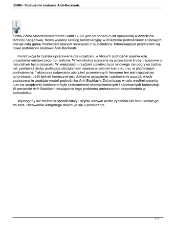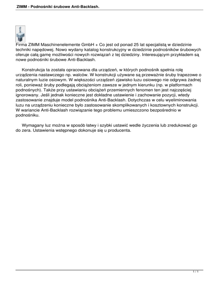 ZIMM - Podnośniki śrubowe Anti-Backlash. Firma ZIMM Maschinenelemente GmbH + Co jest od ponad 25 lat specjalistą w dziedzinie techniki napędowej. Nowo wydany katalog konstrukcyjny w dziedzinie podnośników śrubowych oferuje całą gamę możliwości nowych rozwiązań z tej dziedziny. Interesującym przykładem są nowe podnośniki śrubowe Anti-Backlash. Konstrukcja ta została opracowana dla urządzeń, w których podnośnik spełnia rolę urządzenia nastawczego np. walców. W konstrukcji używane są przeważnie śruby trapezowe o naturalnym luzie osiowym. W większości urządzeń zjawisko luzu osiowego nie odgrywa żadnej roli, ponieważ śruby podlegają obciążeniom zawsze w jednym kierunku (np. w platformach podnośnych). Także przy ustawianiu obciążeń przemiennych fenomen ten jest najczęściej ignorowany. Jeśli jednak konieczne jest dokładne ustawienie i zachowanie pozycji, wtedy zastosowanie znajduje model podnośnika Anti-Backlash. Dotychczas w celu wyeliminowania luzu na urządzeniu konieczne było zastosowanie skomplikowanych i kosztownych konstrukcji. W wariancie Anti-Backlash rozwiązanie tego problemu umieszczono bezpośrednio w podnośniku. Wymagany luz można w sposób łatwy i szybki ustawić wedle życzenia lub zredukować go do zera. Ustawienia wstępnego dokonuje się u producenta. 1/1