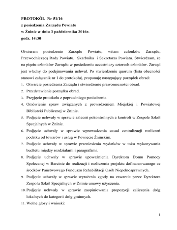 PROTOKÓŁ Nr 51/16 z posiedzenia Zarządu Powiatu w Żninie w