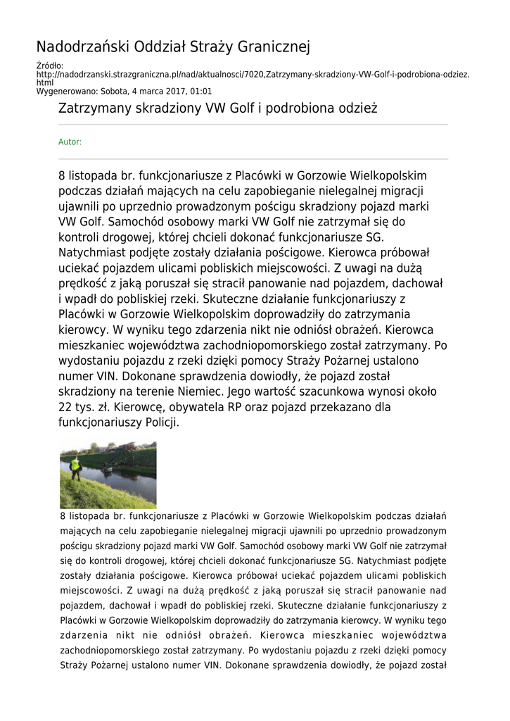 Nadodrzański Oddział Straży Granicznej Źródło: http://nadodrzanski.strazgraniczna.pl/nad/aktualnosci/7020,Zatrzymany-skradziony-VW-Golf-i-podrobiona-odziez. html Wygenerowano: Sobota, 4 marca 2017, 01:01 Zatrzymany skradziony VW Golf i podrobiona odzież Autor: 8 listopada br. funkcjonariusze z Placówki w Gorzowie Wielkopolskim podczas działań mających na celu zapobieganie nielegalnej migracji ujawnili po uprzednio prowadzonym pościgu skradziony pojazd marki VW Golf. Samochód osobowy marki VW Golf nie zatrzymał się do kontroli drogowej, której chcieli dokonać funkcjonariusze SG. Natychmiast podjęte zostały działania pościgowe. Kierowca próbował uciekać pojazdem ulicami pobliskich miejscowości. Z uwagi na dużą prędkość z jaką poruszał się stracił panowanie nad pojazdem, dachował i wpadł do pobliskiej rzeki. Skuteczne działanie funkcjonariuszy z Placówki w Gorzowie Wielkopolskim doprowadziły do zatrzymania kierowcy. W wyniku tego zdarzenia nikt nie odniósł obrażeń. Kierowca mieszkaniec województwa zachodniopomorskiego został zatrzymany. Po wydostaniu pojazdu z rzeki dzięki pomocy Straży Pożarnej ustalono numer VIN. Dokonane sprawdzenia dowiodły, że pojazd został skradziony na terenie Niemiec. Jego wartość szacunkowa wynosi około 22 tys. zł. Kierowcę, obywatela RP oraz pojazd przekazano dla funkcjonariuszy Policji. 8 listopada br. funkcjonariusze z Placówki w Gorzowie Wielkopolskim podczas działań mających na celu zapobieganie nielegalnej migracji ujawnili po uprzednio prowadzonym pościgu skradziony pojazd marki VW Golf. Samochód osobowy marki VW Golf nie zatrzymał się do kontroli drogowej, której chcieli dokonać funkcjonariusze SG. Natychmiast podjęte zostały działania pościgowe. Kierowca próbował uciekać pojazdem ulicami pobliskich miejscowości. Z uwagi na dużą prędkość z jaką poruszał się stracił panowanie nad pojazdem, dachował i wpadł do pobliskiej rzeki. Skuteczne działanie funkcjonariuszy z Placówki w Gorzowie Wielkopolskim doprowadziły do zatrzymania kierowcy. W wyniku tego zdarzenia nikt nie odniósł obrażeń. Kierowca mieszkaniec województwa zachodniopomorskiego został zatrzymany. Po wydostaniu pojazdu z rzeki dzięki pomocy Straży Pożarnej ustalono numer VIN. Dokonane sprawdzenia dowiodły, że pojazd został skradziony na terenie Niemiec. Jego wartość szacunkowa wynosi około 22 tys. zł. Kierowcę, obywatela RP oraz pojazd przekazano dla funkcjonariuszy Policji. W tym samym dniu funkcjonariusze z Placówki SG w Świecku w ramach współdziałania z funkcjonariuszami z Izby Celnej w Rzepinie udaremnili wprowadzenie do handlu podrobionej odzieży. Na targowisku miejskim w Słubicach podczas prowadzonych działań w jednym z pawilonów handlowych ujawnili podrobione ubrania. Bluzy sportowe w ilości 83 sztuk, miały zostać sprzedane przez obywatelkę Bułgarii jako artykuły znanej firm odzieżowej Camp David. Wartość towaru została wyceniona na prawie 35 tysięcy zł. Dalsza kontrola wykazała, że obywatelka Bułgarii prowadzi działalność gospodarczą bez wymaganego zgłoszenia do ewidencji działalności gospodarczej, za co została ukarana mandatem karnym w wysokości 500 złotych. Towar został zajęty do postępowania karno – skarbowego. Za posiadanie i wprowadzanie do obrotu zastrzeżonych znaków towarowych bez stosownych zezwoleń grozi wysoka grzywna i kara pozbawienia wolności do lat 2. Ponadto w miniony weekend funkcjonariusze z Nadodrzańskiego Oddziału SG zatrzymali bądź ustalili 15 osób, które naruszyły polskie przepisy prawne. Wśród zatrzymanych jest 5 Polaków, a także obywatele Ukrainy, Bułgarii, Afganistanu, Litwy i jeden bezpaństwowiec. Cudzoziemcy najczęściej naruszali przepisy związane z pobytem na terytorium Polski i niezgodnie z przeznaczeniem wykorzystywali wizy wydane im w polskich placówkach dyplomatycznych. 6 cudzoziemców przekroczyło lub usiłowało przekroczyć polską granicę wbrew obowiązującym przepisom.