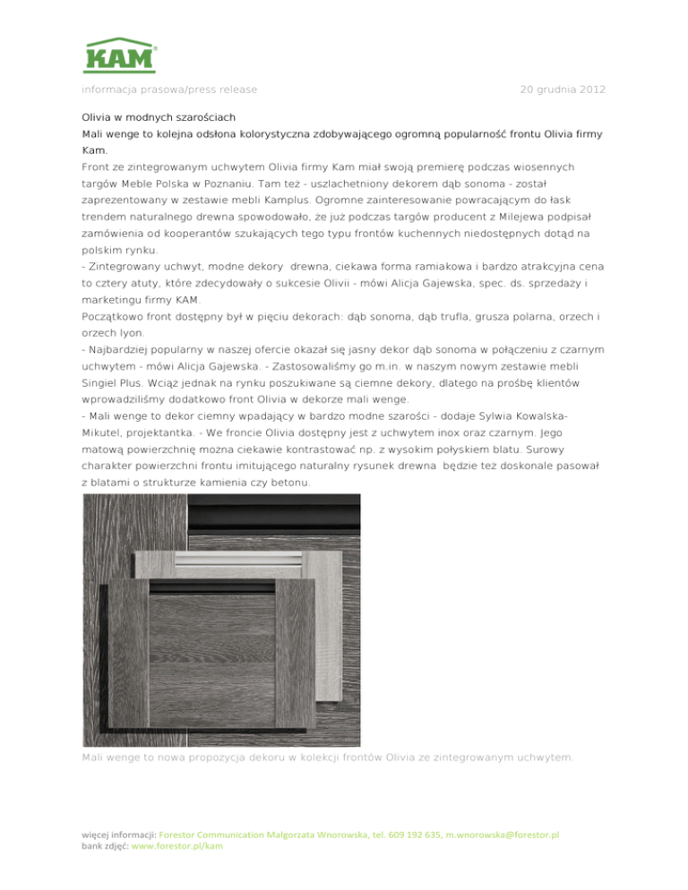 informacja prasowa/press release 20 grudnia 2012 Olivia w modnych szarościach Mali wenge to kolejna odsłona kolorystyczna zdobywającego ogromną popularność frontu Olivia firmy Kam. Front ze zintegrowanym uchwytem Olivia firmy Kam miał swoją premierę podczas wiosennych targów Meble Polska w Poznaniu. Tam też - uszlachetniony dekorem dąb sonoma - został zaprezentowany w zestawie mebli Kamplus. Ogromne zainteresowanie powracającym do łask trendem naturalnego drewna spowodowało, że już podczas targów producent z Milejewa podpisał zamówienia od kooperantów szukających tego typu frontów kuchennych niedostępnych dotąd na polskim rynku. - Zintegrowany uchwyt, modne dekory drewna, ciekawa forma ramiakowa i bardzo atrakcyjna cena to cztery atuty, które zdecydowały o sukcesie Olivii - mówi Alicja Gajewska, spec. ds. sprzedaży i marketingu firmy KAM. Początkowo front dostępny był w pięciu dekorach: dąb sonoma, dąb trufla, grusza polarna, orzech i orzech lyon. - Najbardziej popularny w naszej ofercie okazał się jasny dekor dąb sonoma w połączeniu z czarnym uchwytem - mówi Alicja Gajewska. - Zastosowaliśmy go m.in. w naszym nowym zestawie mebli Singiel Plus. Wciąż jednak na rynku poszukiwane są ciemne dekory, dlatego na prośbę klientów wprowadziliśmy dodatkowo front Olivia w dekorze mali wenge. - Mali wenge to dekor ciemny wpadający w bardzo modne szarości - dodaje Sylwia KowalskaMikutel, projektantka. - We froncie Olivia dostępny jest z uchwytem inox oraz czarnym. Jego matową powierzchnię można ciekawie kontrastować np. z wysokim połyskiem blatu. Surowy charakter powierzchni frontu imitującego naturalny rysunek drewna będzie też doskonale pasował z blatami o strukturze kamienia czy betonu. Mali wenge to nowa propozycja dekoru w kolekcji frontów Olivia ze zintegrowanym uchwytem. więcej informacji: Forestor Communication Małgorzata Wnorowska, tel. 609 192 635, [email protected] bank zdjęć: www.forestor.pl/kam informacja prasowa/press release 20 grudnia 2012 Ciekawa forma "ramiakowa" z krzyżowo ułożonym dekorem stanowi o wyjątkowej stylistyce frontu. więcej informacji: Forestor Communication Małgorzata Wnorowska, tel. 609 192 635, [email protected] bank zdjęć: www.forestor.pl/kam