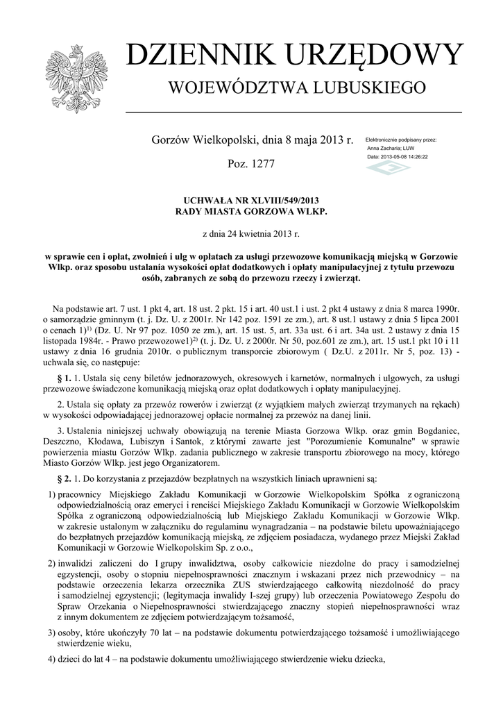 DZIENNIK URZĘDOWY WOJEWÓDZTWA LUBUSKIEGO Gorzów Wielkopolski, dnia 8 maja 2013 r. Elektronicznie podpisany przez: Anna Zacharia; LUW Poz. 1277 Data: 2013-05-08 14:26:22 UCHWAŁA NR XLVIII/549/2013 RADY MIASTA GORZOWA WLKP. z dnia 24 kwietnia 2013 r. w sprawie cen i opłat, zwolnień i ulg w opłatach za usługi przewozowe komunikacją miejską w Gorzowie Wlkp. oraz sposobu ustalania wysokości opłat dodatkowych i opłaty manipulacyjnej z tytułu przewozu osób, zabranych ze sobą do przewozu rzeczy i zwierząt. Na podstawie art. 7 ust. 1 pkt 4, art. 18 ust. 2 pkt. 15 i art. 40 ust.1 i ust. 2 pkt 4 ustawy z dnia 8 marca 1990r. o samorządzie gminnym (t. j. Dz. U. z 2001r. Nr 142 poz. 1591 ze zm.), art. 8 ust.1 ustawy z dnia 5 lipca 2001 o cenach 1)1) (Dz. U. Nr 97 poz. 1050 ze zm.), art. 15 ust. 5, art. 33a ust. 6 i art. 34a ust. 2 ustawy z dnia 15 listopada 1984r. - Prawo przewozowe1)2) (t. j. Dz. U. z 2000r. Nr 50, poz.601 ze zm.), art. 15 ust.1 pkt 10 i 11 ustawy z dnia 16 grudnia 2010r. o publicznym transporcie zbiorowym ( Dz.U. z 2011r. Nr 5, poz. 13) uchwala się, co następuje: § 1. 1. Ustala się ceny biletów jednorazowych, okresowych i karnetów, normalnych i ulgowych, za usługi przewozowe świadczone komunikacją miejską oraz opłat dodatkowych i opłaty manipulacyjnej. 2. Ustala się opłaty za przewóz rowerów i zwierząt (z wyjątkiem małych zwierząt trzymanych na rękach) w wysokości odpowiadającej jednorazowej opłacie normalnej za przewóz na danej linii. 3. Ustalenia niniejszej uchwały obowiązują na terenie Miasta Gorzowa Wlkp. oraz gmin Bogdaniec, Deszczno, Kłodawa, Lubiszyn i Santok, z którymi zawarte jest "Porozumienie Komunalne" w sprawie powierzenia miastu Gorzów Wlkp. zadania publicznego w zakresie transportu zbiorowego na mocy, którego Miasto Gorzów Wlkp. jest jego Organizatorem. § 2. 1. Do korzystania z przejazdów bezpłatnych na wszystkich liniach uprawnieni są: 1) pracownicy Miejskiego Zakładu Komunikacji w Gorzowie Wielkopolskim Spółka z ograniczoną odpowiedzialnością oraz emeryci i renciści Miejskiego Zakładu Komunikacji w Gorzowie Wielkopolskim Spółka z ograniczoną odpowiedzialnością lub Miejskiego Zakładu Komunikacji w Gorzowie Wlkp. w zakresie ustalonym w załączniku do regulaminu wynagradzania – na podstawie biletu upoważniającego do bezpłatnych przejazdów komunikacją miejską, ze zdjęciem posiadacza, wydanego przez Miejski Zakład Komunikacji w Gorzowie Wielkopolskim Sp. z o.o., 2) inwalidzi zaliczeni do I grupy inwalidztwa, osoby całkowicie niezdolne do pracy i samodzielnej egzystencji, osoby o stopniu niepełnosprawności znacznym i wskazani przez nich przewodnicy – na podstawie orzeczenia lekarza orzecznika ZUS stwierdzającego całkowitą niezdolność do pracy i samodzielnej egzystencji; (legitymacja inwalidy I-szej grupy) lub orzeczenia Powiatowego Zespołu do Spraw Orzekania o Niepełnosprawności stwierdzającego znaczny stopień niepełnosprawności wraz z innym dokumentem ze zdjęciem potwierdzającym tożsamość, 3) osoby, które ukończyły 70 lat – na podstawie dokumentu potwierdzającego tożsamość i umożliwiającego stwierdzenie wieku, 4) dzieci do lat 4 – na podstawie dokumentu umożliwiającego stwierdzenie wieku dziecka, Dziennik Urzędowy Województwa Lubuskiego –2– Poz. 1277 5) dzieci w wieku powyżej 4 lat i młodzież dotknięta inwalidztwem lub niepełnosprawna w okresie do ukończenia gimnazjum, szkoły ponadpodstawowej lub ponadgimnazjalnej – publicznej lub niepublicznej o uprawnieniach szkoły publicznej, nie dłużej niż do ukończenia 24 roku życia lub szkoły wyższej, nie dłużej niż do ukończenia 26 roku życia – na podstawie: dzieci i młodzież: a) legitymacji przedszkolnej (wzór MEN-I/52/2) lub legitymacji szkolnej dla uczniów dotkniętych inwalidztwem lub niepełnosprawnych (wzór MEN-I/51/2) lub b) orzeczenia komisji lekarskiej d/s inwalidztwa i zatrudnienia wraz z legitymacją szkolną lub studencką lub c) legitymacji osoby niepełnosprawnej wraz z legitymacją szkolną lub studencką. 6) osoby niewidome i słabo widzące oraz ich przewodnicy – na podstawie legitymacji Polskiego Związku Niewidomych lub orzeczenia Powiatowego Zespołu do Spraw Orzekania o Niepełnosprawności stwierdzającego znaczny lub umiarkowany stopień niepełnosprawności spowodowany wadą narządu wzroku, określony odpowiednim kodem ( 04-O ), wraz z innym dokumentem ze zdjęciem potwierdzającym tożsamość. W przypadku przewodników wskazania przez niewidomego lub słabo widzącego, 7) kombatanci – na podstawie legitymacji kombatanckiej wydanej przez Urząd ds. Kombatantów i Osób Represjonowanych oraz członkowie Stowarzyszenia Polaków Poszkodowanych przez III Rzeszę urodzeni przed 8 maja 1945r. - na podstawie legitymacji Stowarzyszenia, 8) jedno z rodziców lub opiekun dzieci i młodzieży dotkniętej inwalidztwem lub niepełnosprawnej zawsze przy przejazdach wraz z dzieckiem lub przy przejazdach, po dziecko, z miejsca zamieszkania lub miejsca pobytu do przedszkola, szkoły, placówki opiekuńczo-wychowawczej, ośrodka rehabilitacji, ośrodka rehabilitacyjno-wychowawczego, domu pomocy społecznej, ośrodka wsparcia, zakładu opieki zdrowotnej, poradni psychologiczno-pedagogicznej i z powrotem – na podstawie: dla podróżujących wraz dzieckiem dokumentu dziecka, dla podróżujących po dziecko lub po jego odwiezieniu zaświadczenia dla opiekuna ucznia niepełnosprawnego, 9) umundurowani funkcjonariusze Straży Miejskiej miasta Gorzowa Wlkp. i Policji, 10) Honorowi Dawcy Krwi, legitymujący się oddaniem honorowo co najmniej: mężczyźni 25 litrów krwi, kobiety 18 litrów krwi, zamieszkali w Gorzowie Wlkp. – na podstawie legitymacji Honorowego Dawcy Krwi w sztywnej okładce z potwierdzonym wpisem oddania: mężczyźni 25 litrów krwi, kobiety 18 litrów krwi, 11) posiadacze Biletów Jednodniowych (VBB - Bilet Jednodniowy T/P) uprawniających do przejazdu 