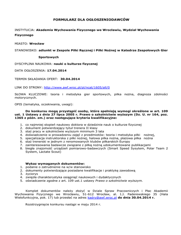 FORMULARZ DLA OGŁOSZENIODAWCÓW INSTYTUCJA: Akademia Wychowania Fizycznego we Wrocławiu, Wydział Wychowania Fizycznego MIASTO: Wrocław STANOWISKO: adiunkt w Zespole Piłki Ręcznej i Piłki Nożnej w Katedrze Zespołowych Gier Sportowych DYSCYPLINA NAUKOWA: nauki o kulturze fizycznej DATA OGŁOSZENIA: 17.04.2014 TERMIN SKŁADANIA OFERT: 30.04.2014 LINK DO STRONY: http://www.awf.wroc.pl/pl/ncat/1605/all/0 SŁOWA KLUCZOWE: teoria i metodyka gier sportowych, piłka nożna, diagnoza zdolności motorycznych. OPIS (tematyka, oczekiwania, uwagi): Do konkursu mogą przystąpić osoby, które spełniają wymogi określone w art. 109 ust. 1 Ustawy z dnia 27 lipca 2005 r. Prawo o szkolnictwie wyższym (Dz. U. nr 164, poz. 1365 z późn. zm.) oraz następujące kryteria kwalifikacyjne: 1. 2. 3. 4. 5. 6. 7. 8. 1. 2. 3. 4. 5. co najmniej stopień naukowy doktora w dziedzinie nauk o kulturze fizycznej dokument potwierdzający tytuł trenera II klasy staż pracy w szkolnictwie wyższym minimum 3 lata doświadczenie w prowadzeniu zajęć z przedmiotów: teoria i metodyka piłki nożnej, specjalizacja instruktorska z piłki nożnej, halowa piłka nożna, plażowa piłka nożna staż trenerski w jednym z renomowanych klubów piłkarskich Europy zainteresowania badawcze związane z piłką nożną udokumentowane publikacjami biegła znajomość urządzeń pomiarowo-badawczych (Smart Speed Sysytem, Polar Team 2 System, Lactate Scout) Wykaz wymaganych dokumentów: podanie o zatrudnienie na w/w stanowisko dokumenty potwierdzające posiadane kwalifikacje i praktykę zawodową życiorys zwięzła charakterystyka osiągnięć naukowych i dydaktycznych oświadczenie zgodne z art. 109 ust.1 ustawy Prawo o szkolnictwie wyższym. Komplet dokumentów należy złożyć w Dziale Spraw Pracowniczych i Płac Akademii Wychowania Fizycznego we Wrocławiu, 51-612 Wrocław, al. I.J. Paderewskiego 35 (Hala Wielofunkcyjna, pok. 17) lub przesłać na adres [email protected] do dnia 30.04.2014 r. Rozstrzygnięcie konkursu nastąpi w maju 2014 r.