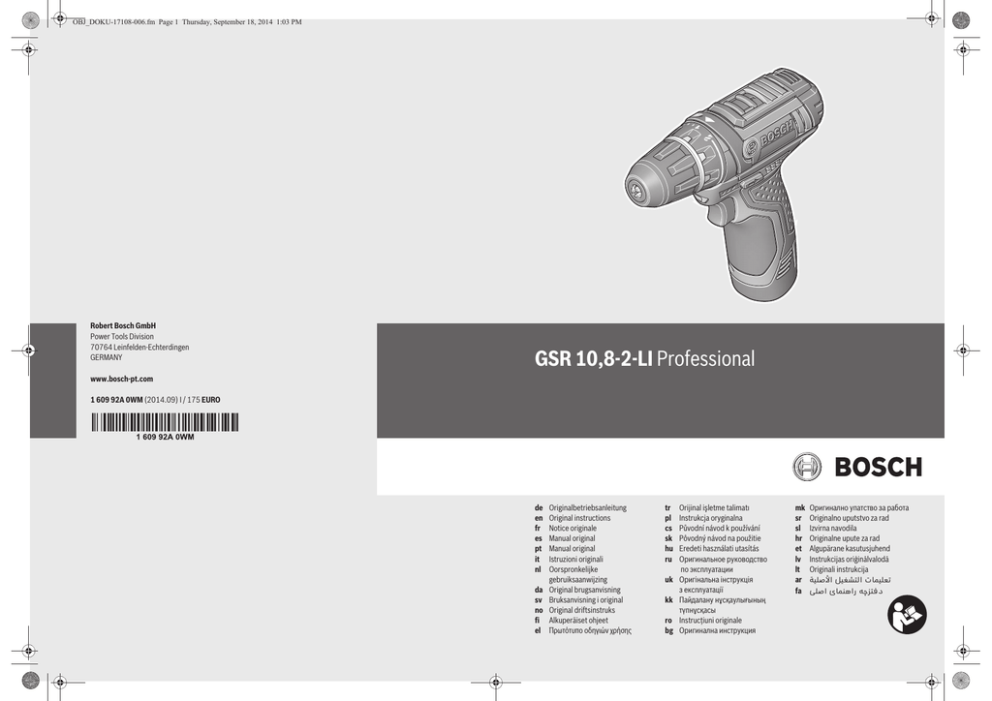 OBJ_DOKU-17108-006.fm Page 1 Thursday, September 18, 2014 1:03 PM Robert Bosch GmbH Power Tools Division 70764 Leinfelden-Echterdingen GERMANY GSR 10,8-2-LI Professional www.bosch-pt.com 1 609 92A 0WM (2014.09) I / 175 EURO Originalbetriebsanleitung Original instructions Notice originale Manual original Manual original Istruzioni originali Oorspronkelijke gebruiksaanwijzing da Original brugsanvisning sv Bruksanvisning i original no Original driftsinstruks fi Alkuperäiset ohjeet el Πρωτότυπο οδηγιών χρήσης de en fr es pt it nl tr pl cs sk hu ru uk kk ro bg Orijinal işletme talimatı Instrukcja oryginalna Původní návod k používání Pôvodný návod na použitie Eredeti használati utasítás Оригинальное руководство по эксплуатации Оригінальна інструкція з експлуатації Пайдалану нұсқаулығының түпнұсқасы Instrucţiuni originale Оригинална инструкция mk sr sl hr et lv lt ar fa Оригинално упатство за работа Originalno uputstvo za rad Izvirna navodila Originalne upute za rad Algupärane kasutusjuhend Instrukcijas oriģinālvalodā Originali instrukcija ςТЎϩХʉ ЌТϾϦφЍʉ ʌμВТЎϺυ ΖЎϩʉ ˒μВЖЙʉʓ ИͳϞφЁʑ OBJ_BUCH-970-006.book Page 76 Thursday, September 18, 2014 1:01 PM 76 | Polski Polski Wskazówki bezpieczeństwa Ogólne przepisy bezpieczeństwa dla elektronarzędzi OSTRZEZENIE Należy przeczytać wszystkie wskazówki i przepisy. Błędy w przestrzeganiu poniższych wskazówek mogą spowodować porażenie prądem, pożar i/lub ciężkie obrażenia ciała. Należy starannie przechowywać wszystkie przepisy i wskazówki bezpieczeństwa dla dalszego zastosowania. Użyte w poniższym tekście pojęcie „elektronarzędzie“ odnosi się do elektronarzędzi zasilanych energią elektryczną z sieci (z przewodem zasilającym) i do elektronarzędzi zasilanych akumulatorami (bez przewodu zasilającego). Bezpieczeństwo miejsca pracy f Stanowisko pracy należy utrzymywać w czystości i dobrze oświetlone. Nieporządek w miejscu pracy lub nieoświetlona przestrzeń robocza mogą być przyczyną wypadków. f Nie należy pracować tym elektronarzędziem w otoczeniu zagrożonym wybuchem, w którym znajdują się np. łatwopalne ciecze, gazy lub pyły. Podczas pracy elektronarzędziem wytwarzają się iskry, które mogą spowodować zapłon. f Podczas użytkowania urządzenia zwrócić uwagę na to, aby dzieci i inne osoby postronne znajdowały się w bezpiecznej odległości. Odwrócenie uwagi może spowodować utratę kontroli nad narzędziem. Bezpieczeństwo elektryczne f Wtyczka elektronarzędzia musi pasować do gniazda. Nie wolno zmieniać wtyczki w jakikolwiek sposób. Nie wolno używać wtyków adapterowych w przypadku elektronarzędzi z uziemieniem ochronnym. Niezmienione wtyczki i pasujące gniazda zmniejszają ryzyko porażenia prądem. f Należy unikać kontaktu z uziemionymi powierzchniami jak rury, grzejniki, piece i lodówki. Ryzyko porażenia prądem jest większe, gdy ciało użytkownika jest uziemione. f Urządzenie należy zabezpieczyć przed deszczem i wilgocią. Przedostanie się wody do elektronarzędzia podwyższa ryzyko porażenia prądem. f Nigdy nie należy używać przewodu do innych czynności. Nigdy nie należy nosić elektronarzędzia, trzymając je za przewód, ani używać przewodu do zawieszenia urządzenia; nie wolno też wyciągać wtyczki z gniazdka pociągając za przewód. Przewód należy chronić przed wysokimi temperaturami, należy go trzymać z dala od oleju, ostrych krawędzi lub ruchomych części urządzenia. Uszkodzone lub splątane przewody zwiększają ryzyko porażenia prądem. f W przypadku pracy elektronarzędziem pod gołym niebem, należy używać przewodu przedłużającego, dostosowanego również do zastosowań zewnętrznych. 1 609 92A 0WM | (18.9.14) Użycie właściwego przedłużacza (dostosowanego do pracy na zewnątrz) zmniejsza ryzyko porażenia prądem. f Jeżeli nie da się uniknąć zastosowania elektronarzędzia w wilgotnym otoczeniu, należy użyć wyłącznika ochronnego różnicowo-prądowego. Zastosowanie wyłącznika ochronnego różnicowo-prądowego zmniejsza ryzyko porażenia prądem. Bezpieczeństwo osób f Podczas pracy z elektronarzędziem należy zachować ostrożność, każdą czynność wykonywać uważnie i z rozwagą. Nie należy używać elektronarzędzia, gdy jest się zmęczonym lub będąc pod wpływem narkotyków, alkoholu lub lekarstw. Moment nieuwagi przy użyciu elektronarzędzia może stać się przyczyną poważnych urazów ciała. f Należy nosić osobiste wyposażenie ochronne i zawsze okulary ochronne. Noszenie osobistego wyposażenia ochronnego – maski przeciwpyłowej, obuwia z podeszwami przeciwpoślizgowymi, kasku ochronnego lub środków ochrony słuchu (w zależności od rodzaju i zastosowania elektronarzędzia) – zmniejsza ryzyko obrażeń ciała. f Należy unikać niezamierzonego uruchomienia narzędzia. Przed włożeniem wtyczki do gniazdka i/lub podłączeniem do akumulatora, a także przed podniesieniem lub przeniesieniem elektronarzędzia, należy upewnić się, że elektronarzędzie jest wyłączone. Trzymanie palca na wyłączniku podczas przenoszenia elektronarzędzia lub podłączenie do prądu włączonego narzędzia, może stać się przyczyną wypadków. f Przed włączeniem elektronarzędzia, należy usunąć narzędzia nastawcze lub klucze. Narzędzie lub klucz, znajdujący się w ruchomych częściach urządzenia mogą doprowadzić do obrażeń ciała. f Należy unikać nienaturalnych pozycji przy pracy. Należy dbać o stabilną pozycję przy pracy i zachowanie równowagi. W ten sposób możliwa będzie lepsza kontrola elektronarzędzia w nieprzewidzianych sytuacjach. f Należy nosić odpowiednie ubranie. Nie należy nosić luźnego ubrania ani biżuterii. Włosy, ubranie i rękawice