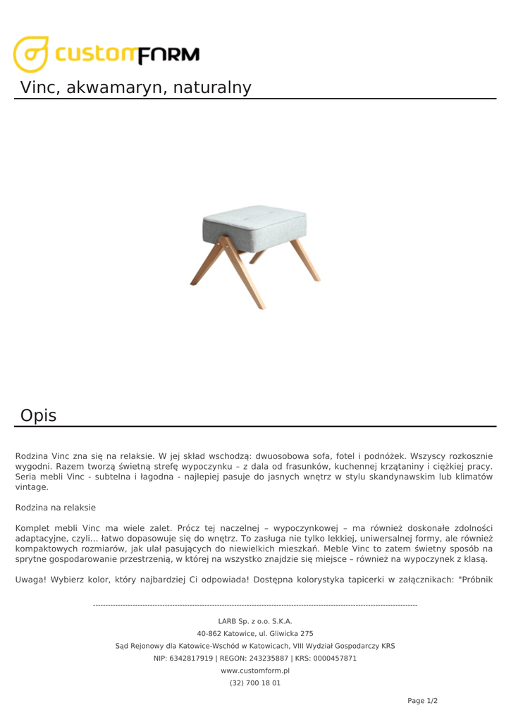 Vinc, akwamaryn, naturalny Opis Rodzina Vinc zna się na relaksie. W jej skład wschodzą: dwuosobowa sofa, fotel i podnóżek. Wszyscy rozkosznie wygodni. Razem tworzą świetną strefę wypoczynku – z dala od frasunków, kuchennej krzątaniny i ciężkiej pracy. Seria mebli Vinc - subtelna i łagodna - najlepiej pasuje do jasnych wnętrz w stylu skandynawskim lub klimatów vintage. Rodzina na relaksie Komplet mebli Vinc ma wiele zalet. Prócz tej naczelnej – wypoczynkowej – ma również doskonałe zdolności adaptacyjne, czyli… łatwo dopasowuje się do wnętrz. To zasługa nie tylko lekkiej, uniwersalnej formy, ale również kompaktowych rozmiarów, jak ulał pasujących do niewielkich mieszkań. Meble Vinc to zatem świetny sposób na sprytne gospodarowanie przestrzenią, w której na wszystko znajdzie się miejsce – również na wypoczynek z klasą. Uwaga! Wybierz kolor, który najbardziej Ci odpowiada! Dostępna kolorystyka tapicerki w załącznikach: "Próbnik ----------------------------------------------------------------------------------------------------------------------------------LARB Sp. z o.o. S.K.A. 40-862 Katowice, ul. Gliwicka 275 Sąd Rejonowy dla Katowice-Wschód w Katowicach, VIII Wydział Gospodarczy KRS NIP: 6342817919 | REGON: 243235887 | KRS: 0000457871 www.customform.pl (32) 700 18 01 Page 1/2 tkanin - I, II, III grupa cenowa”. Cena uzależniona jest od rodzaju wybranej tkaniny. Drewniane elementy wykończenia produktu możemy wykonać w kolorach: naturalny - jasne drewno, orzech ciemne drewno, biały oraz czarny. Specyfikacja Wysokość 44 cm Szerokość 58 cm Głębokość 42 cm Wykończenie tkanina: 52 % PES, 48% ACR Siedzisko tkanina Podstawa drewno Dodatkowe zdjęcia ----------------------------------------------------------------------------------------------------------------------------------LARB Sp. z o.o. S.K.A. 40-862 Katowice, ul. Gliwicka 275 Sąd Rejonowy dla Katowice-Wschód w Katowicach, VIII Wydział Gospodarczy KRS NIP: 6342817919 | REGON: 243235887 | KRS: 0000457871 www.customform.pl (32) 700 18 01 Page 2/2 Powered by TCPDF (www.tcpdf.org)