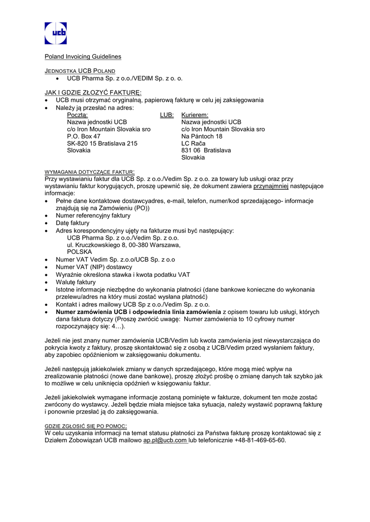 Poland Invoicing Guidelines • UCB Pharma Sp. z o.o./VEDIM Sp. z