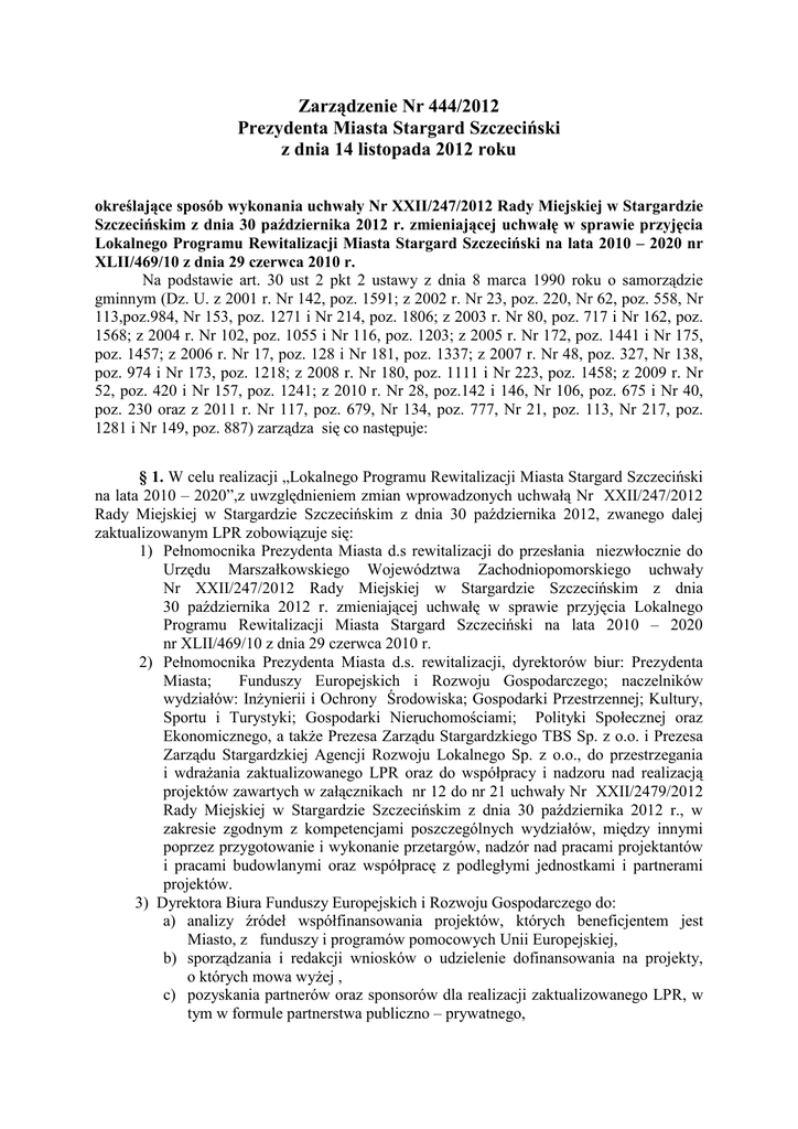 Zarządzenie Nr 444/2012 Prezydenta Miasta Stargard Szczeciński z