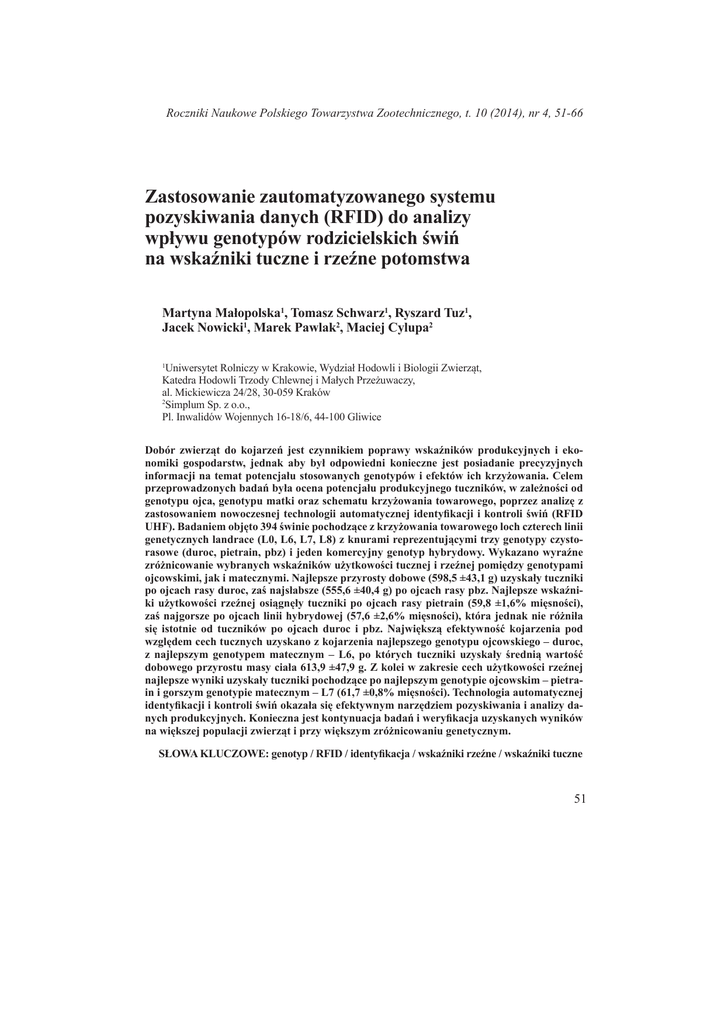Roczniki Naukowe Polskiego Towarzystwa Zootechnicznego, t. 10 (2014), nr 4, 51-66 Zastosowanie zautomatyzowanego systemu pozyskiwania danych (RFID) do analizy wpływu genotypów rodzicielskich świń na wskaźniki tuczne i rzeźne potomstwa Martyna Małopolska1, Tomasz Schwarz1, Ryszard Tuz1, Jacek Nowicki1, Marek Pawlak2, Maciej Cylupa2 Uniwersytet Rolniczy w Krakowie, Wydział Hodowli i Biologii Zwierząt, Katedra Hodowli Trzody Chlewnej i Małych Przeżuwaczy, al. Mickiewicza 24/28, 30-059 Kraków 2 Simplum Sp. z o.o., Pl. Inwalidów Wojennych 16-18/6, 44-100 Gliwice 1 Dobór zwierząt do kojarzeń jest czynnikiem poprawy wskaźników produkcyjnych i ekonomiki gospodarstw, jednak aby był odpowiedni konieczne jest posiadanie precyzyjnych informacji na temat potencjału stosowanych genotypów i efektów ich krzyżowania. Celem przeprowadzonych badań była ocena potencjału produkcyjnego tuczników, w zależności od genotypu ojca, genotypu matki oraz schematu krzyżowania towarowego, poprzez analizę z zastosowaniem nowoczesnej technologii automatycznej identyfikacji i kontroli świń (RFID UHF). Badaniem objęto 394 świnie pochodzące z krzyżowania towarowego loch czterech linii genetycznych landrace (L0, L6, L7, L8) z knurami reprezentującymi trzy genotypy czystorasowe (duroc, pietrain, pbz) i jeden komercyjny genotyp hybrydowy. Wykazano wyraźne zróżnicowanie wybranych wskaźników użytkowości tucznej i rzeźnej pomiędzy genotypami ojcowskimi, jak i matecznymi. Najlepsze przyrosty dobowe (598,5 ±43,1 g) uzyskały tuczniki po ojcach rasy duroc, zaś najsłabsze (555,6 ±40,4 g) po ojcach rasy pbz. Najlepsze wskaźniki użytkowości rzeźnej osiągnęły tuczniki po ojcach rasy pietrain (59,8 ±1,6% mięsności), zaś najgorsze po ojcach linii hybrydowej (57,6 ±2,6% mięsności), która jednak nie różniła się istotnie od tuczników po ojcach duroc i pbz. Największą efektywność kojarzenia pod względem cech tucznych uzyskano z kojarzenia najlepszego genotypu ojcowskiego – duroc, z najlepszym genotypem matecznym – L6, po których tuczniki uzyskały średnią wartość dobowego przyrostu masy ciała 613,9 ±47,9 g. Z kolei w zakresie cech użytkowości rzeźnej najlepsze wyniki uzyskały tuczniki pochodzące po najlepszym genotypie ojcowskim – pietrain i gorszym genotypie matecznym – L7 (61,7 ±0,8% mięsności). Technologia automatycznej identyfikacji i kontroli świń okazała się efektywnym narzędziem pozyskiwania i analizy danych produkcyjnych. Konieczna jest kontynuacja badań i weryfikacja uzyskanych wyników na większej populacji zwierząt i przy większym zróżnicowaniu genetycznym. SŁOWA KLUCZOWE: genotyp / RFID / identyfikacja / wskaźniki rzeźne / wskaźniki tuczne 51 M. Małopolska i wsp. Od wielu lat jednym z głównych kierunków hodowli trzody chlewnej i priorytetów badawczo-rozwojowych jest, obok doskonalenia użytkowości rozpłodowej, poprawa wskaźników tucznych i rzeźnych świń, realizowana w procesie doskonalenia ras czystych poprzez ocenę przyrostów masy ciała i szacowanie mięsności. Istnieje przekonanie, iż postęp w zakresie mięsności świń może powodować obniżenie jakości mięsa oraz pogorszenie wskaźników rozrodczych [1, 7, 20]. Odpowiedni dobór zwierząt do rozpłodu to nie tylko umiejętne wykorzystanie zalet dostępnego materiału hodowlanego, lecz także sposób poprawy wyników w chlewni [12]. Zgodnie z powyższym, jednym z kluczowych czynników wpływającym na jakość żywca wieprzowego jest genotyp, a w celu uzyskania oczekiwanych rezultatów prowadzona jest intensywna selekcja [32]. Jednak najszybsze efekty uzyskiwane są przy wykorzystaniu krzyżowań towarowych z zastosowaniem odpowiednich ras matecznych i ojcowskich [9]. Producenci wykorzystujący programy krzyżowania ras i genotypów charakteryzujących się genetycznym potencjałem wysokiej mięsności, jak pietrain, duroc i mieszańce pomiędzy nimi, z rasami rodzimymi lub matecznymi, w stosunkowo krótkim czasie mogą uzyskać znaczący efekt zwiększenia zawartości chudego mięsa w tuszy tuczników, przy zachowaniu potencjału rozrodczego matek [6, 9]. Musi to jednak iść w parze z zapewnieniem odpowiednich warunków środowiskowych, z właściwie zbilansowanym żywieniem na czele. Zapewnienie właściwej rynkowej podaży oczekiwanej jakości tusz i mięsa wymaga, poza intensywnymi badaniami naukowymi i pracą hodowlaną, współdziałania producentów żywca z branżą przetwórstwa mięsnego, poprzez stosowanie finansowej gratyfikacji dla dostawców lepszego jakościowo surowca [26]. W Unii Europejskiej jedną z platform współpracy pomiędzy produkcją rolniczą a przemysłem przetwórczym jest system klasyfikacji tusz wieprzowych EUROP, którego celem jest ujednolicenie kryteriów zapłaty producentom za tuczniki oraz ułatwienie handlu półtuszami, a jednocześnie wskazywanie preferowanych kierunków pracy hodowlanej [29, 31]. Jednak do efektywnej poprawy wskaźników tucznych, jak i rzeźnych, niezbędna jest wiedza na temat indywidualnych wartości osiąganych przez poszczególne tuczniki. W 2001 roku zostały przeprowadzone próby wdrożenia „nowego” systemu oceny tuczników [4]. Zakładał on prowadzenie skrupulatnej dokumentacji, opartej na przygotowanym schemacie. Prosięta znakowano plastikowymi kolczykami z numerem, do którego w dokumentacji przypisane były poszczególne dane: województwo, w którym zwierzę było utrzymywane, numer gospodarstwa, numer i rasa ojca oraz matki, data urodzenia oraz płeć zwierzęcia. Następnie zbierano drugą część danych, dotyczących użytkowości rzeźnej. Jak podają Eckert i Blicharski [4], realizacja projektu przysporzyła sporo trudności związanych z wielkością zbioru danych (pracochłonność gromadzenia i analizy danych) oraz trwałością kolczyków, wskazując jednocześnie, iż projekt jest wiarygodny i powinien być kontynuowany w zakresie automatyzacji procesu pozy