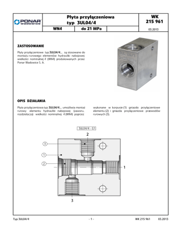 WK 215 961 Płyta przyłączeniowa typ 3UL04/4 WN4 do 21 MPa 03.2013 ZASTOSOWANIE Płyty przyłączeniowe typ 3UL0 UL04/4... są stosowane do montażu rurowego elementów hydrauliki nabojowej wielkości nominalnej 4 (WN4) produkowanych przez Ponar Wadowice S. A. OPIS DZIAŁANIA Płyta przyłączeniowa typ 3UL0 3U L04 L04/4... umożliwia montaż rurowy elementu hydrauliki nabojowej (zaworu, rozdzielacza) wielkości nominalnej 4 (WN4) poprzez wykonane w korpusie (1) gniazdo przyłączeniowe elementu (2) i gniazda przyłączeniowe przewodów rurowych (3). 3UL04/4 - G1 2 3 1 2 1 3 Typ 3UL04/4 -1- WK 215 961 03.2013 WYMIARY GABARYTOWE I PRZYŁĄCZENIOWE 13 G1/4 3 gniazda O 6,5 - 2 otw. 60 45 M18 x 1,5 30 13 1 (max) = = płyta płyt a przy pr zył zyłącze ączen zeniowa typ 3UL0 UL04/4 G1 30 2 7,5 1 3 15 1 (max) 15 30 28 43 = = 60 1 - Korpus płyty 2 - Gniazdo przyłączeniowe elementu (rozdzielacza lub zaworu WN4) 3 - Gniazdo przyłączeniowe przewodów rurowych WK 215 961 03.2013 -2- Typ 3UL04/4 WYMIARY GABARYTOWE I PRZYŁĄCZENIOWE gni gniazdo zdo przy pr zył zyłącze ączen zeniowe eleme e lemen lementu (zaworu, oru, ro r ozdz zdziel ielacz acza) WN4 WN4 3- drog dr ogo ogowe M18 x 1,5 1, 5 (oznaczenie M-04-3) moment dokręcenia zaworu Md = 35 - 40 Nm φ 0,025 - dotyczy wszystkich średnic O O O R 0,1 +0,4 2,5 23 (min) 19,97 +0,1 M18 x 1.5 a 1 (max) 3,3 otworu głównego i faz 0,025 A 15° +0,05 15 0 n a 1,25 szczegół 18 13 12 45° 2,5 20 ° O 6,5 2 1,25 42 20° 33 O 28 3 6,5 A 2,5 1 O 12 gni gniazda zda przy pr zył zyłącze ączen zeniowe prze pr zew zewodó odów rur ruro urowych wych (1, 2, 3) ^ 25 (min) 13,2 G 1/4 B 13 16,5 2,5 1 , 2, 3 Typ 3UL04/4 0,1 B 1 (max) OO 90° -3- WK 215 961 03.2013 SPOSÓB ZAMAWIANIA UL 3 04 4 Rodzaj gniazda elementu hydraulicznego (zaworu lub rozdzielacza WN4) gniazdo 3-drogowe =3 Wielkość nominalna płyty (WN) WN4 G1 * = 04 Konfiguracja gniazd gwintowych przewodów rurowych rozmieszczenie gniazd wg rysunku - ark. 2 =4 Rodzaj gniazd gwintowych przewodów rurowych gniazda G 1/4 = G1 Ewentualne dodatkowe wymagania określone w sposób opisowy (uzgodnione z producentem) UWA UWAGI: Płytę przyłączeniową należy zamawiać wg kodu,ustalonego z symboli wg powyższego diagramu. Symbo Symb ole zaznacz aczone dru dr ukiem pogr p ogrub ogr ubi ubionym oznacz aczają ają prefero prefer owane wersje wyk wykonania dostęp dostępne stęp ne w krótk rótkim termi term inie do d osta stawy. Przykład kodu płyty w zamówieniu: 3UL04/4 G1 PONAR Wadowice S.A. ul. Wojska Polskiego 29 34-100 Wadowice tel. +48 33 488 21 00 fax.+48 33 488 21 03 www.ponar-wadowice.pl WK 215 961 03.2013 -4- Typ 3UL04/4