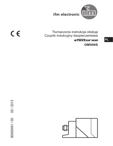 Tłumaczona instrukcja obsługi Czujnik indukcyjny bezpieczeństwa PL 80005491 / 00 05 / 2013 GM504S Spis treści 1 Uwagi wstępne����������������������������������������������������������������������������������������������������3 1.1 Objaśnienie symboli��������������������������������������������������������������������������������������3 2 Instrukcje dotyczące bezpieczeństwa�����������������������������������������������������������������4 2.1 Wymagania dotyczące bezpieczeństwa podczas stosowania����������������������4 3 Dostarczone elementy�����������������������������������������������������������������������������������������5 4 Funkcje i własności����������������������������������������������������������������������������������������������5 5 Działanie��������������������������������������������������������������������������������������������������������������6 5.1 Strefa dozwolona�������������������������������������������������������������������������������������������6 5.2 Ochrona przed prostym przekłamaniem��������������������������������������������������������7 6 Montaż�����������������������������������������������������������������������������������������������������������������8 6.1 Ustawianie powierzchni aktywnej czujnika.���������������������������������������������������8 6.2 Warunki montażu�������������������������������������������������������������������������������������������8 7 Podłączenie elektryczne������������������������������������������������������������������������������������10 7.1 Połączenie szeregowe 2-10 indukcyjnych czujników bezpieczeństwa��������10 8 Uruchomienie���������������������������������������������������������������������������������������������������� 11 8.1 Tryb wsparcia do ustawiania strefy dozwolonej������������������������������������������� 11 8.2 Określanie strefy dozwolonej����������������������������������������������������������������������� 11 8.3 Dezaktywacja trybu wsparcia����������������������������������������������������������������������12 9 Praca�����������������������������������������������������������������������������������������������������������������12 9.1 Sygnały czujnika������������������������������������������������������������������������������������������12 9.2 Charakterystyka wejścia / charakterystyka wyjścia�������������������������������������13 9.3 Zwarcia poprzeczne������������������������������������������������������������������������������������13 9.4 Tryb pracy��������������������������������������������������