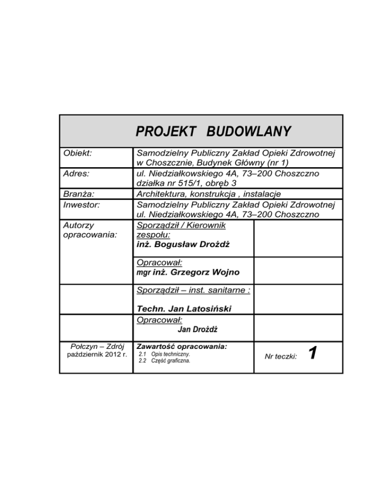 PROJEKT BUDOWLANY Obiekt: Adres: Branża: Inwestor: Autorzy opracowania: Samodzielny Publiczny Zakład Opieki Zdrowotnej w Choszcznie, Budynek Główny (nr 1) ul. Niedziałkowskiego 4A, 73–200 Choszczno działka nr 515/1, obręb 3 Architektura, konstrukcja , instalacje Samodzielny Publiczny Zakład Opieki Zdrowotnej ul. Niedziałkowskiego 4A, 73–200 Choszczno Sporządził / Kierownik zespołu: inż. Bogusław Drożdż Opracował: mgr inż. Grzegorz Wojno Sporządził – inst. sanitarne : Techn. Jan Latosiński Opracował: Jan Drożdż Połczyn – Zdrój październik 2012 r. Zawartość opracowania: 2.1 Opis techniczny. 2.2 Część graficzna. Nr teczki: 1 Budynek Główny (1), ul. Niedziałkowskiego 4A, 73-200 Choszczno, dz. nr 515/1 obr.3 1.0. INFORMACJA OGÓLNA: Zakres opracowania obejmuje remont i przebudowę wybranych pomieszczeń szpitala, w tym wygospodarowanie nowych łazienek. 2.0. PODSTAWA OPRACOWANIA: Zlecenie inwestora z dn. Inwentaryzacja obiektu Obowiązujące normy 3.0. SZCZEGÓŁOWY ZAKRES PRAC REMONTOWYCH: 3.1. PRACE REMONTOWE NA PARTERZE - SEKTOR „1„ 3.1.1. Prace remontowe w pomieszczeniu socjalnym pielęgniarek – (pom. 2.24 i 2.25). • Wybudowanie ścianki działowej: Ściankę działową zbudować zgodnie z częścią graficzną. Część ścianki działowej, zbudowanej z cegły pełnej na zaprawie cementowej zakotwić z jednej strony w ścianie za pomocą metalowych płaskowników. Drugą część zamocować w ceowniku UPN 140. Ceownik zamocować w posadzce i suficie za pomocą blach przyspawanych doczołowo i mocowanych na kołki rozprężne. Ściankę pokryć tynkiem mineralnym. Drzwi i naświetle nad drzwiami wykonać ze szkła w ramie aluminiowej. Część ściany wykonaną z luksferów zazbroić i zakotwić w ścianie. Montaż w np. systemie firmy Vitrosilicon lub podobnym, koniecznie z uwzględnieniem zbrojenia. Luksfery barwione w masie bądź powierzchniowo np. firmy Vitrosilicon lub podobne w jasnych kolorach. • Zamurowanie otworu okna wewnętrznego – wykonać za pomocą bloczków gazobetonowych bądź płyt G-K na ruszcie stalowym. • Zamontowanie zlewozmywaka dwukomorowego – instalacja wod.-kan. wg odrębnego opracowania • Zamontowanie umywalki istniejącej w szafce o wymiarach 60x60xm. • Zamiana istniejącego grzejnika na dwa mniejsze o wymiarach 60x40cm i przeniesienie w miejsca pokazane w części graficzne – instalacja wod.-kan. wg odrębnego opracowania. • Przetarcie i pomalowanie pokoju na kolory charakterystyczne dla oddziału chirurgii farbą zmywalną. • Przeniesienie szafek z dyżurki pielęgniarek – pom. 2.4 do nowej dyżurki pielęgniarek – pom. 2.25 • W każdym z pomieszczeń powstałym po podziale (pom. 2.24 i 2.25). wykonać po dwa wypusty świetleniowe oraz po dwa gniazda z bolcem 10A/Z. 3.1.2. Pozostałe prace remontowe na parterze • • • • Pomieszczenie 2.33 – Administracja – montaż kasetonów sufitu podwieszanego, wymiana umywalki, usunięcie paneli oraz ceramiki podłogowej i położenie wykładziny podłogowej np. Gamrat Rekord 43 wraz z listwą podłogową oraz drobne przetarcie i malowanie ścian. Pomieszczenie 2.34 – Pokój lekarzy – wymiana kasetonów sufitu podwieszanego, usunięcie sidingu ze słupów i wykonanie zabudowy z płyt G-K, wymiana umywalki, położenie wykładziny podłogowej np. Gamrat Rekord 43 wraz z listwą podłogową oraz drobne przetarcie i malowanie ścian. Komunikacja 2.35 - Zdjęcie sidingu ze ścian korytarza, przetarcie, szpachlowanie i malowanie farbami lateksowymi lub innymi zmywalnymi. Położenie wykładziny podłogowej np. Gamrat Rekord 43 wraz z listwą podłogową na Oddziale Chirurgii w pomieszczeniach: - 2.6 Komunikacja - 2.14 – 2.20 – Sale Chorych 2 Budynek Główny (1), ul. Niedziałkowskiego 4A, 73-200 Choszczno, dz. nr 515/1 obr.3 PRACE REMONTOWE NA I PIĘTRZE- SEKTOR „2„ 3.2.1. Prace remontowe w pomieszczeniu 3.13 – WC • • • • • Wymiana urządzeń sanitarnych na nowe – nowa miska WC kompakt + zbiornik WC, nowa umywalka oraz nowa armatura. Wymiana instalacji wod-kan i elektrycznej. Skucie i położenie nowej glazury do wysokości 2m. Nowa glazura w jasnych kolorach, nawiązujących do kolorystyki na Oddziale Położnictwa. Wykonie nowej posadzki ceramicznej. Sprawdzenie możliwości wykonania wentylacji WC w starym kanale dymowym kotłowni. 3.2.2. Prace remontowe w pomieszczeniu 3.14 – łazienka. • • • • • • • • • Wymiana nowych drzwi do kabin ustępowych wraz z ościeżnicami. Wykonanie nowych ścianek działowych do kabin prysznicowych zgodnie z częścią graficzną. Wymiana urządzeń sanitarnych na nowe – nowe dwie miski WC kompakt + zbiorniki WC, nowe dwa płytkie brodziki prysznicowe, nowa umywalka oraz nowa armatura do całej łazienki. W kabinach prysznicowych należy zamontować dodatkowe uchwyty. Kabiny prysznicowe z zamykanymi drzwi. Przykładowe rozwiązania kabiny natrysku w części graficznej – rys. nr 10. Wymiana instalacji wod-kan i elektrycznej. Położenie nowej glazury do wysokości 2m w jasnych kolorach, charakterystycznych dla Oddziału Położnictwa. Pomalowanie na biało ściany powyżej części zmywalnej. Zamocowanie nowego lustra nad umywalką wpuszczanego w glazurę. Wykonie nowej posadzki ceramicznej. W miarę możliwości wymiana zabudowy rur wod-kan. w narożu pomieszczenia na mniejszą umożliwiającą otwarcie 2 kanałów wentylacyjnych. Wykonanie wentylacji – otwarcie 2 kanałów wentylacyjnych zgodnie z częścią graficzną. 3.2.3. Prace remontowe w pomieszczeniu 3.17 – wydzielenie nowej łazienki. • • • • • • • • • • • • Wyburzenie fragmentu ściany działowej zgodnie z częścią graficzną. Zamurowanie, zgodnie z częścią graficzną, istniejących otworów drzwiowych bloczkiem gazobetonowym bądź płytą G-K na stelażu stalowym. Wykonanie ścianki działowej z bloczków gazobetonowych gr. 8cm. Ścianki działowe zakotwić w śc