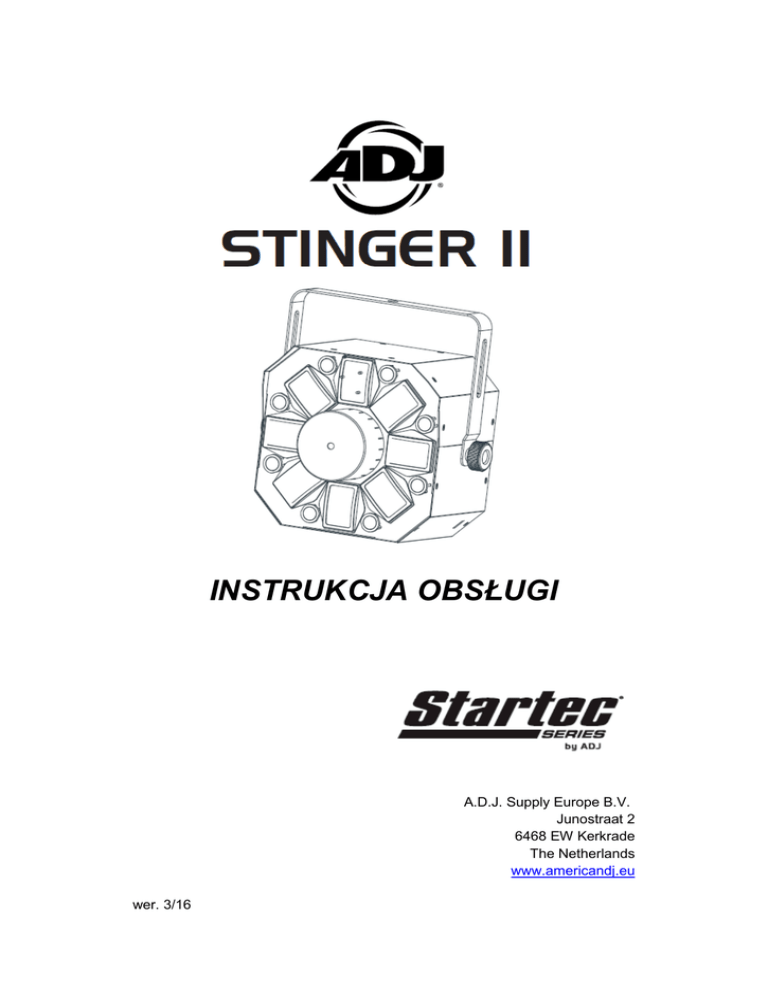 INSTRUKCJA OBSŁUGI A.D.J. Supply Europe B.V. Junostraat 2 6468 EW Kerkrade The Netherlands www.americandj.eu wer. 3/16 ©2015 ADJ Products, LLC wszystkie prawa zastrzeżone. Informacje, specyfikacje, rysunki, zdjęcia oraz instrukcje zawarte w niniejszej instrukcji mogą ulec zmianie bez wcześniejszego powiadomienia. Produkty marki ADJ, logo LLC oraz nazwy i numery identyfikujące produkty opisane w niniejszym dokumencie stanowią znak handlowy ADJ Products, LLC. Zgłoszona ochrona praw autorskich obejmuje wszelkie formy i wszelkie kwestie dotyczące materiałów i informacji podlegających ochronie prawem autorskim, dozwolone obecnie przez obowiązujące ustawy bądź rozstrzygnięcia sądowe. Nazwy produktów użyte w niniejszym dokumencie mogą stanowić znaki towarowe bądź zarejestrowane znaki towarowe produkujących je spółek i zostają niniejszym prawnie uznane. Wszelkie marki oraz nazwy produktów nie pochodzące od ADJ Products, LLC, stanowią znaki towarowe lub zarejestrowane znaki towarowe odpowiednich, produkujących je spółek. ADJ Products, LLC oraz wszystkie powiązane z nią spółki wyłączają niniejszym wszelką swoją odpowiedzialność za szkody we własności, sprzęcie, budynkach lub szkody elektryczne, za obrażenia poniesione przez jakiekolwiek osoby, jak też za bezpośrednie lub pośrednie straty ekonomiczne związane z lub zależne od użycia jakichkolwiek informacji zawartych w niniejszym dokumencie, oraz/lub wynikłe z niewłaściwego, niebezpiecznego, niepełnego lub niestarannego montażu, instalacji, konfiguracji osprzętu oraz działania opisanych tutaj produktów. A.D.J. Supply Europe B.V. - www.americandj.eu - Stinger II Podręcznik Użytkownika 2 Spis treści INFORMACJE OGÓLNE ............................................................................................................................................................ 4 INSTRUKCJE OGÓLNE .............................................................................................................................................................. 4 CECHY...................................................................................................................................................................................... 4 BEZPIECZNA OBSŁUGA ............................................................................................................................................................ 4 ŚRODKI BEZPIECZEŃSTWA ...................................................................................................................................................... 5 OSTRZEŻENIA I ZASADY BEZPIECZEŃSTWA DOTYCZĄCE LASERA ........................................................................................... 5 USTAWIENIA ........................................................................................................................................................................... 7 INSTALACJA ............................................................................................................................................................................. 8 ETYKIETY OSTRZEGAWCZE DOTYCZĄCE LASERA..................................................................................................................... 9 MENU SYSTEMU ................................................................................................................................................................... 10 DZIAŁANIE ............................................................................................................................................................................. 12 USTAWIENIA MASTER-SLAVE ............................................................................................................................................... 13 POŁĄCZENIE SZEREGOWE ..................................................................................................................................................... 13 WYGASZACZ AWARYJNY ....................................................................................................................................................... 13 ZDALNE STEROWANIE UC IR/AIRSTREAM ............................................................................................................................ 13 2 KANAŁOWY ........................................................................................................................................................................ 14 9 KANAŁOWY ........................................................................................................................................................................ 14 WYMIANA BEZPIECZNIKA ..................................................................................................................................................... 15 CZYSZCZENIE ......................................................................................................................................................................... 15 ROZWIĄZYWANIE PROBLEMÓW .......................................................................................................................................... 16 SPECYFIKACJE ........................................................................................................................................................................ 16 ROHS - Olbrzymi wkład w ochronę środowiska .................................................................................................................... 17 WEEE – ODPADY Z URZĄDZEŃ ELEKTRYCZNYCH I ELEKTRONICZNYCH ................................................................................ 18 NOTATKI ................................................................................................................................................................................ 19 A.D.J. Supply Europe B.V. - www.americandj.eu - Sting