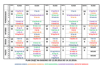 PONIEDZIAŁEK WTOREK ŚRODA PIĄTEK le k cj a DATA KLASA DATA KLASA DATA KLASA DATA KLASA DATA KLASA 2 3 4 5 12 IX II hp/hd ch II hd dz III bma dz III bmb dz 19 IX II hp dz 26 IX II hp/hd ch II hd dz III bma dz III bmb dz 3 X II hp dz 10 X II hp/hd ch II hd dz III bma dz III bmb dz 6 7 1 2 3 4 6 7 1 2 3 4 1 2 4 5 6 7 13 IX 14 IX 16 IX II bmb1 dz II bmb2 dz III mia /sg dz III sg ch I hd/mia ch I mib ch III hp/hd ch I bm dz I ba dz II bma2 dz II mg dz II mia/mib dz III mg/mib dz III mg ch I hp dz I mg/hp dz 20 IX 21 IX 22 IX III ba/bma/bmb ch III ba dz II ba/bmb ch II ba dz III mia 1 ch III mia2 ch I hd dz I mia/mib dz III hp dz III hd dz I ba/bm ch II bma1 dz II bma/mg ch II mib ch II mia ch III mib1 ch III mib2 ch I hp/mg ch 27 IX 28 IX 30 IX II bmb1 dz II bmb2 dz III mia /sg dz III sg ch I hd/mia ch I mib ch III hp/hd ch I bm dz I ba dz II bma2 dz II mg dz II mia/mib dz III mg/mib dz III mg ch I hp dz I mg/hp dz 4 X 5 X 7 X III ba/bma/bmb ch III ba dz II ba/bmb ch II ba dz III mia 1 ch III mia2 ch I hd dz I mia/mib dz III hp dz III hd dz I ba/bm ch II bma1 dz II bma/mg ch II mib ch II mia ch III mib1 ch III mib2 ch I hp/mg ch 11 X 12 X 14 X PLAN ZAJĘĆ NA BASENIE OD 12.09.2016 DO 14.10.2016r. AGNIESZKA SOBIECH ,ALEKSANDRA CZARNECKA, PIOTR MARUDZIŃSKI, SŁAWOMIR RUSZKOWSKI, KRZYSZTOF BIERNACKI II bmb1 dz II bmb2 dz III mia /sg dz III sg ch I hd/mia ch I mib ch III hp/hd ch I bm dz I ba dz II bma2 dz II mg dz WOLNE WOLNE WOLNE