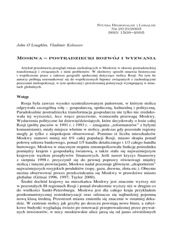 Studia Regionalne i Lokalne Nr 2(12)/2003 ISSN 1509–4995 John O’Loughlin, Vladimir Kolossov Moskwa – postradziecki rozwój i wyzwania Artykuł przedstawia przegla˛d zmian zachodza˛cych w Moskwie w okresie postradzieckiej transformacji i zwia˛zanych z nimi problemów. W skrótowy sposób omawia historyczne i współczesne prace z zakresu geografii społecznej dotycza˛ce stolicy Rosji. Na tym tle autorzy próbuja˛ ustosunkować sie˛ do współczesnych hipotez zwia˛zanych z zachodza˛cymi procesami metropolizacji, w tym społecznej i przestrzennej polaryzacji wyste˛puja˛cej w miastach globalnych. Wste˛p Rosja była zawsze wysoko scentralizowanym państwem, w którym stolica odgrywała szczególna˛ role˛ – gospodarcza˛, społeczna˛, kulturalna˛ i polityczna˛. Paradoksalnie postradziecka transformacja gospodarcza nie tylko nie zredukowała tej wyższości, lecz wre˛cz przeciwnie, wzmocniła przewage˛ Moskwy. Wydarzenia polityczne lat dziewie˛ćdziesia˛tych, które decydowały o losie całej Rosji (próby puczów w 1991 r. i 1993 r. – zmagania „reformatorów” z byłymi komunistami), miały miejsce właśnie w stolicy, podczas gdy pozostałe regiony mogły je tylko z niepokojem obserwować. Pomimo iż liczba mieszkańców Moskwy stanowi mniej niż 6% całej populacji Rosji, miasto skupia ponad połowe˛ sektora bankowego, ponad 1/5 handlu detalicznego i 1/3 całego handlu hurtowego. Moskwa w znacznym stopniu zmonopolizowała funkcje˛ pośrednika pomie˛dzy krajem i gospodarka˛ światowa˛, a także stała sie˛ najważniejszym krajowym we˛złem przepływów finansowych. Jeśli nawet kryzys finansowy z sierpnia 1998 r. przyczynił sie˛ do pewnej poprawy równowagi mie˛dzy stolica˛ i innymi prowincjami, Moskwa nadal pozostaje głównym „eksporterem” najważniejszych rosyjskich produktów (ropy, gazu, drewna, złota etc.). Obecnie można obserwować proces przekształcania sie˛ Moskwy w prawdziwe miasto globalne (Gritsai 1996, 1997; Taylor 2000). Średni dochód krajowy na mieszkańca Moskwy jest znacznie wyższy niż w pozostałych 88 regionach Rosji i ponad dwukrotnie wyższy niż w drugim co do wielkości Sankt-Petersburgu. Moskwa jest dla całego kraju przykładem postkomunistycznej restrukturyzacji oraz odznacza sie˛ najbardziej pojemna˛ nowa˛ klasa˛ średnia˛. Przestrzeń miasta zmieniła sie˛ znacznie w ostatniej dekadzie. W centrum stolicy jak grzyby po deszczu powstaja˛ nowe biura, a zabytkowe budynki wygla˛daja˛ świeżo po renowacji przeprowadzonej przez prywatnych inwestorów; w nocy moskiewskie ulice jarza˛ sie˛ od jasno oświetlonych 18 JOHN O’LOUGHLIN, VLADIMIR KOLOSSOV wystaw sklepowych i zagranicznych reklam, wzbudzaja˛c zazdrość w mieszkańcach wielu innych miast, które cierpia˛ z powodu długów miejskich i braków w dostawie pra˛du. Czy Moskwa rzeczywiście jest dominuja˛cym graczem rosyjskiej gospodarki, określaja˛cym kierunki i skale˛ restrukturyzacji państwa? Jak trwały jest „moskiewski cud”? Jaka jest druga strona medalu – zwia˛zana z nierównościami i polaryzacja˛, które stały sie˛ widoczne w ostatniej dekadzie? Te pytania znajduja˛ sie˛ coraz cze˛ściej w centrum dyskusji mie˛dzy politykami i naukowcami. Ekonomiczne i społeczne koszty gwałtownych zmian, jakie zaszły w Moskwie od 1991 r., sa˛ już znane. Moskwa stała sie˛ bezsprzecznie demograficzna˛ „czarna˛ dziura˛”: liczba zgonów przewyższyła w cia˛gu dekady liczbe˛ urodzeń. Starzenie sie˛ ludności miasta i spadek liczby jego mieszkańców sa˛ rekompensowane przez migracje˛ zarobkowa˛ z wie˛kszości byłych republik radzieckich, z pozostałych regionów Rosji, a nawet z krajów Trzeciego Świata. Wie˛kszość emigrantów przebywa w Moskwie nielegalnie. Te procesy pogarszaja˛ jakościowa˛ strukture˛ ludności, stwarzaja˛ napie˛cia na rynku pracy i rynku mieszkaniowym oraz moga˛ prowadzić do konfliktów religijnych i etnicznych. Pomimo iż społeczne zróżnicowanie przestrzeni Moskwy nie osia˛gne˛ło jeszcze takiej skali jak w Stanach Zjednoczonych czy nawet w miastach Europy Zachodniej, pogłe˛biaja˛ce sie˛ nierówności społeczne powoduja˛ powstawanie zamknie˛tych społeczności i moga˛ skazywać przeważaja˛ca˛ wie˛kszość moskwian na życie w zaniedbanych i opuszczonych gettach. Co wie˛cej, procesy polaryzacji niosa˛ ze soba˛ ryzyko zwie˛kszania sie˛ kontrastów społecznych poprzez tworzenie rozwarstwionego systemu edukacji i opieki zdrowotnej – separuja˛cego bogatsze warstwy społeczne od warstw biedniejszych. Władze miejskie Moskwy musza˛ rozwia˛zać także inne problemy. Jednym z najpoważniejszych jest wymagaja˛cy ogromnych inwestycji problem mieszkaniowy, a w szczególności konieczność renowacji starej i zrujnowanej zabudowy mieszkaniowej, w tym czteropie˛trowych bloków, tzw. chruszczowów, zbudowanych w latach sześćdziesia˛tych. Co wie˛cej, miasto cierpi na brak wolnej przestrzeni pod zabudowe˛, w zwia˛zku z czym konieczne jest wyburzenie starych budynków mieszkalnych i zakładów przemysłowych lub przeniesienie fabryk poza miasto w celu zwie˛kszenia intensywności wykorzystania terenu. Kolejnym pala˛cym problemem jest gwałtowny wzrost liczby pojazdów w stosunku do niewystarczaja˛cej pojemności sieci drogowej i liczby miejsc parkingowych; ze wzgle˛du na stałe utrudnienia w ruchu (korki) dojazd samochodem do centrum w dni robocze jest prawie niemożliwy. Na tym tle zbyt wolny rozwój transportu publicznego, wynikaja˛cy z niewystarczaja˛cego doinwestowania, wydaje sie˛ szczególnie niepokoja˛cy. Władze miasta nie posiadaja˛ wystarczaja˛cych środków finansowych na jednoczesna˛ budowe˛ autostrad takich jak „Trzeci Kra˛g” i inwestowanie w rozbudowe˛ metra oraz pozostałego transportu publicznego. Władze miejskie pod przewodnictwem Jurija Łużkowa (burmistrz od 1992 r.) zobowia˛zały sie˛ do kontynuowania inwestycji w prestiżowe pro