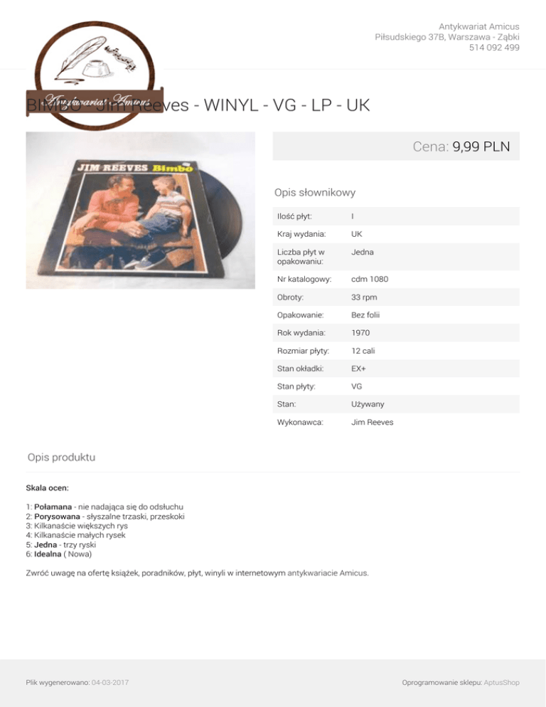 Antykwariat Amicus Piłsudskiego 37B, Warszawa - Ząbki 514 092 499 BIMBO - Jim Reeves - WINYL - VG - LP - UK Cena: 9,99 PLN Opis słownikowy Ilość płyt: I Kraj wydania: UK Liczba płyt w opakowaniu: Jedna Nr katalogowy: cdm 1080 Obroty: 33 rpm Opakowanie: Bez folii Rok wydania: 1970 Rozmiar płyty: 12 cali Stan okładki: EX+ Stan płyty: VG Stan: Używany Wykonawca: Jim Reeves Opis produktu Skala ocen: 1: Połamana - nie nadająca się do odsłuchu 2: Porysowana - słyszalne trzaski, przeskoki 3: Kilkanaście większych rys 4: Kilkanaście małych rysek 5: Jedna - trzy ryski 6: Idealna ( Nowa) Zwróć uwagę na ofertę książek, poradników, płyt, winyli w internetowym antykwariacie Amicus. Plik wygenerowano: 04-03-2017 Oprogramowanie sklepu: AptusShop Antykwariat Amicus Piłsudskiego 37B, Warszawa - Ząbki 514 092 499 Galeria Plik wygenerowano: 04-03-2017 Powered by TCPDF (www.tcpdf.org) Oprogramowanie sklepu: AptusShop